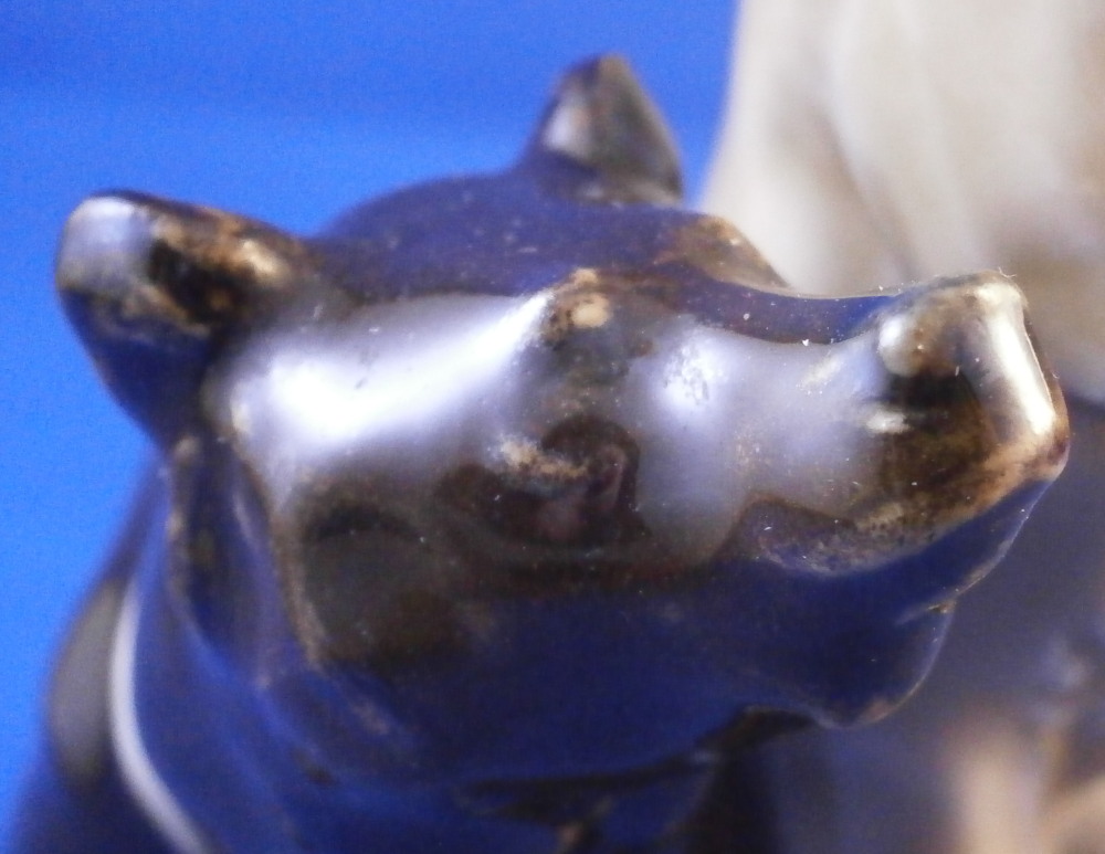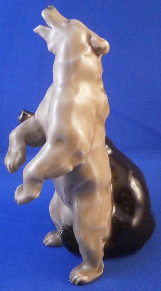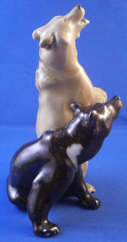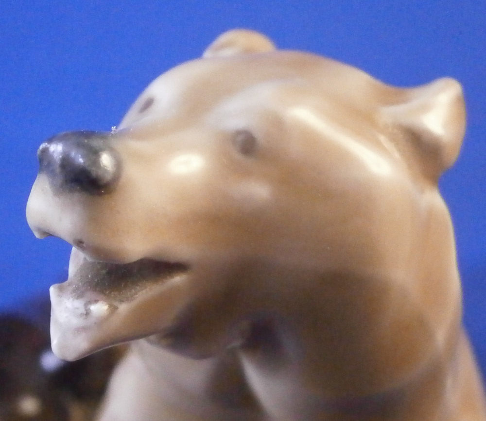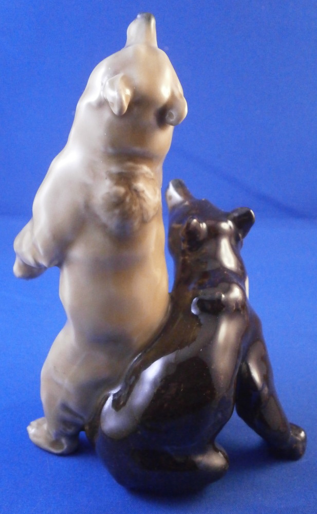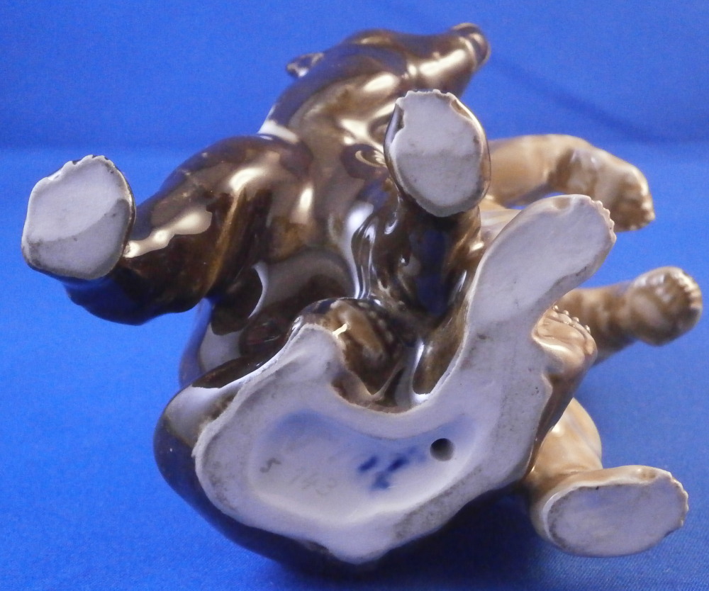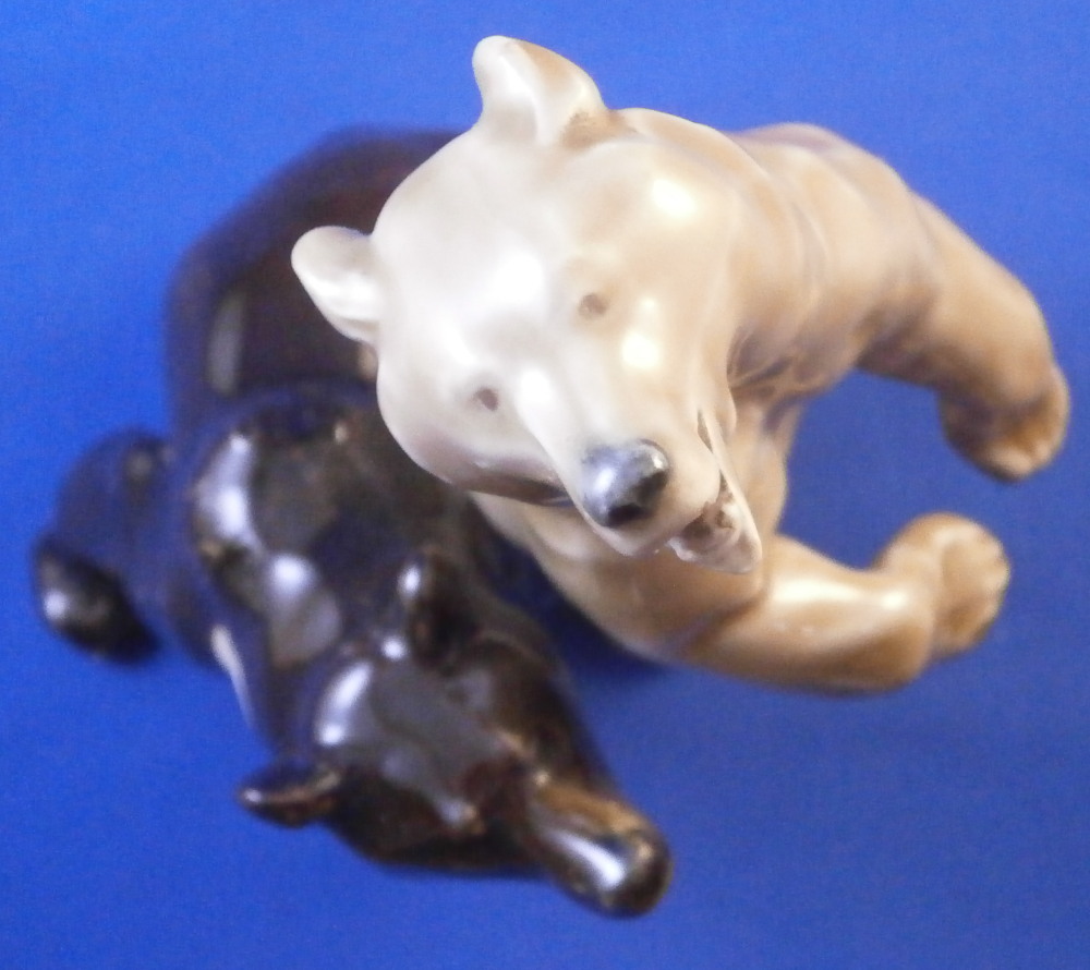 This is a really nice figurine made by Meissen in the very early 20th century. The figure is of a pair of bears - one light brown and standing up and the other dark brown and sitting down. The darks brown bear has a white patch around his neck. The figurine is superbly modeled and painted just right to look very elegant and almost real. They used the under glaze colors from the Art Nouveau / Jugendstil period that one does not see too often and they look amazing! The figurine is in perfect condition. It is marked underneath with the under glazed blue crossed swords mark along with the usual impressed / incised marks and a painter's number 5. as shown. The piece is 5.25 inches tall, 3.75 inches wide and 3.25 inches deep. The piece was designed by Erich Hoesel and has the model number V102. Please email me for more information or other pictures.