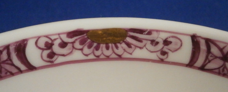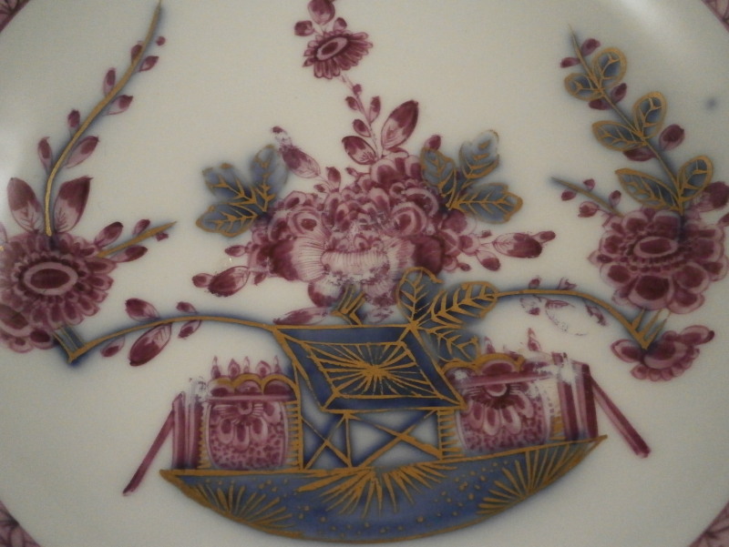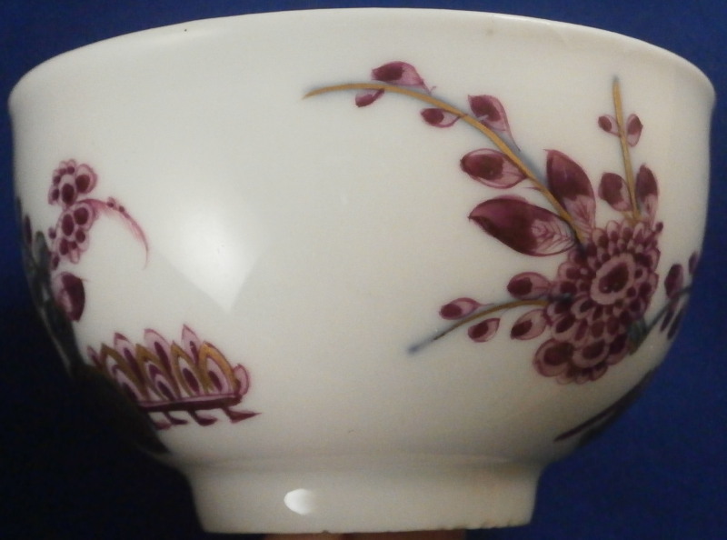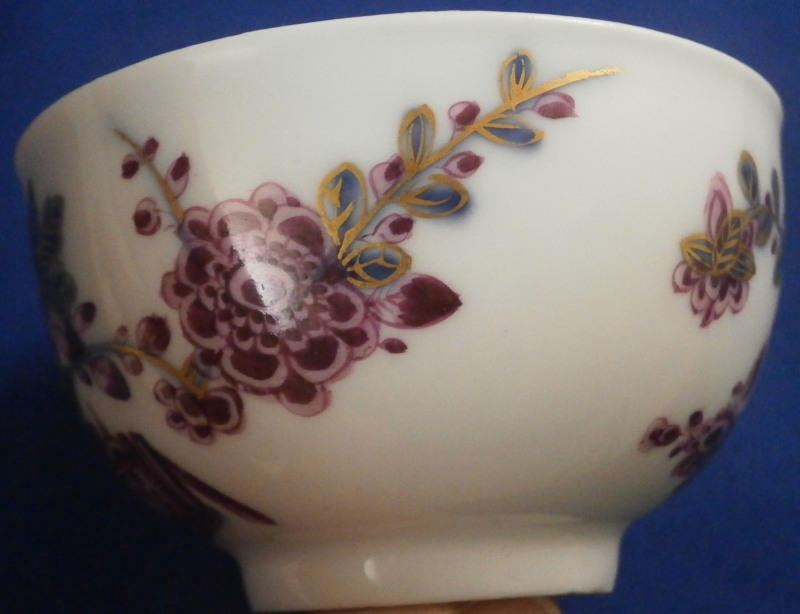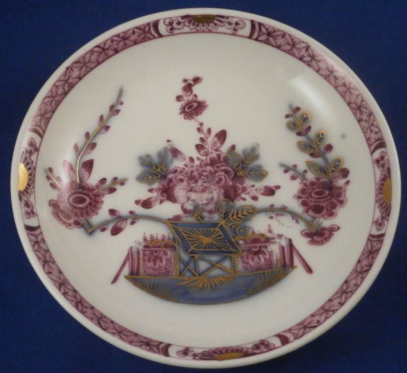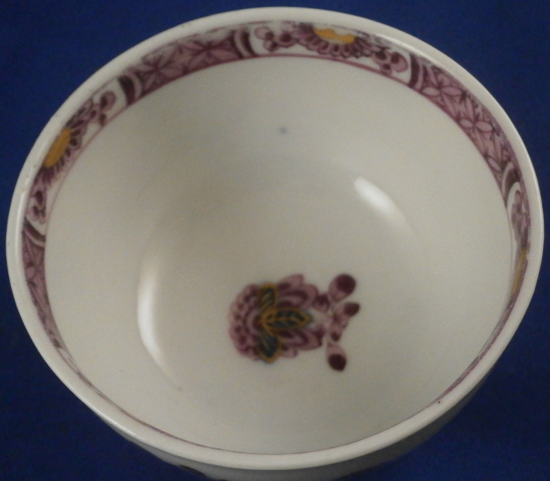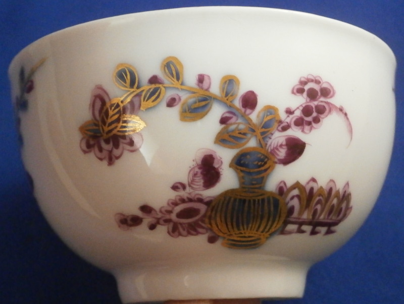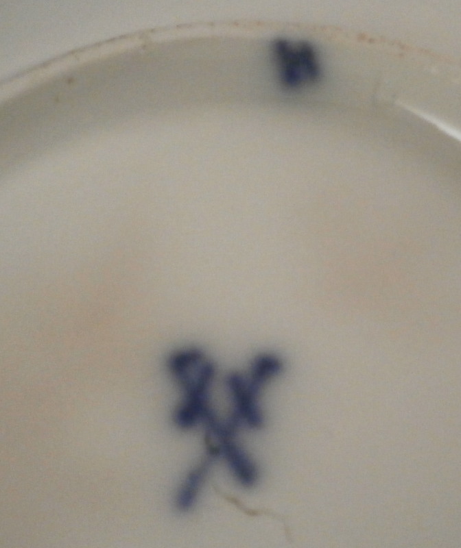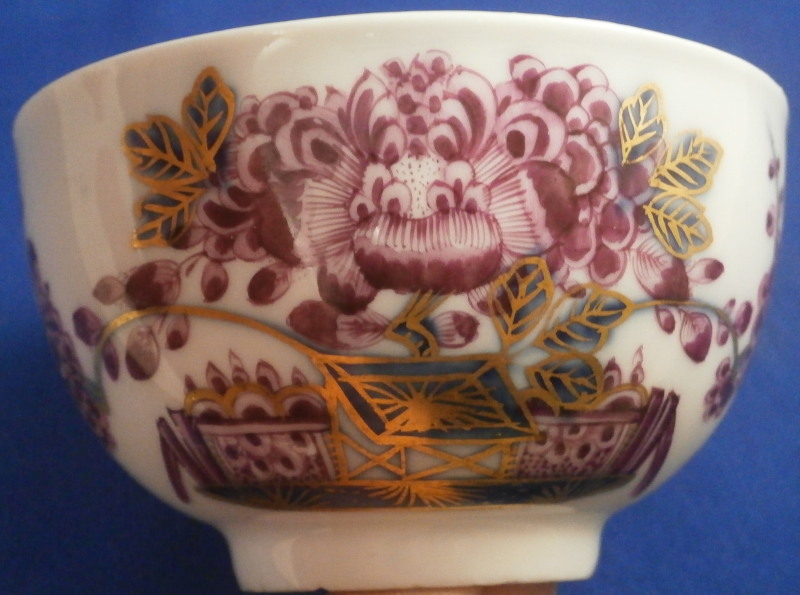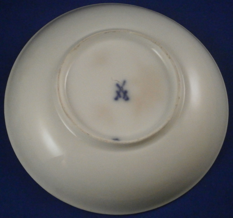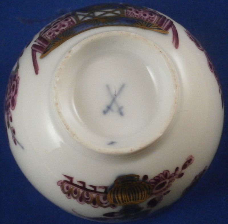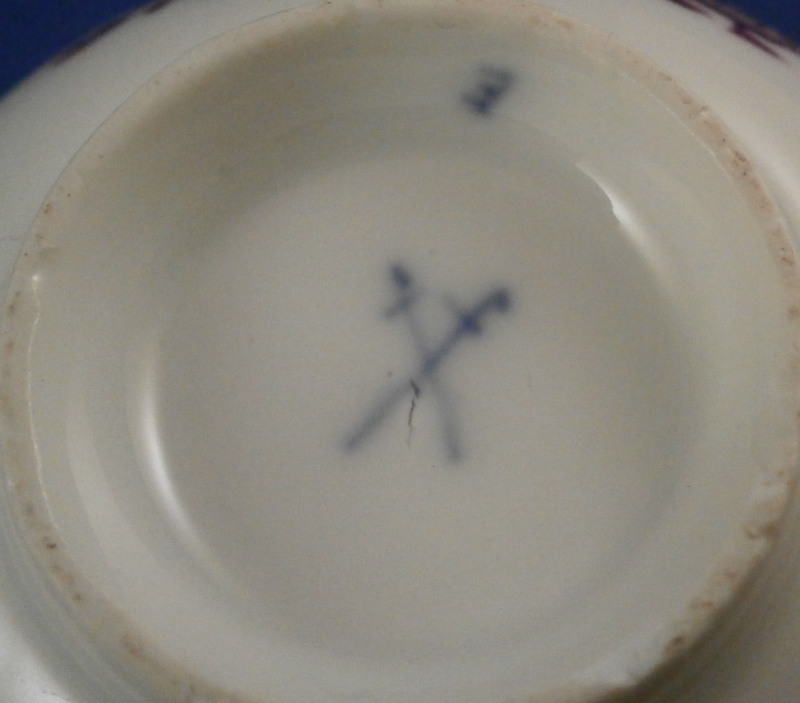 This is a nice mid 18th century Meissen teabowl ( aka Koppchen ) cup and saucer dating to the 1740s. It is hand painted with their famous hand painted Tischchenmuster design (little table motif ) in puce and under glaze blue with gold highlights which is rarer than the usual version in iron red, puce, blue, green, yellow and gold. The table is in under glaze blue with Indian style flowers all around and a nice design to the rim. The set is in great condition with a bit of wear to the center of the saucer where the cup would sit from age and to the very top inside edge of the cup from use but the set displays nicely. The cup has a firing crack on the udnerside by the mark which does not affect the piece and is from the making. Each is marked underneath with the Meissen crossed swords marks as well as a blue painter's mark on the foot ring and an impressed number 2 as shown. The tea bowl is a bit over 1.75 inches tall and has a diameter of 3.125 inches. The saucer is 1.125 inches tall and 5.25 inches in diameter. Please email me for more information or other pictures.
