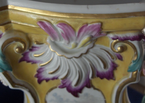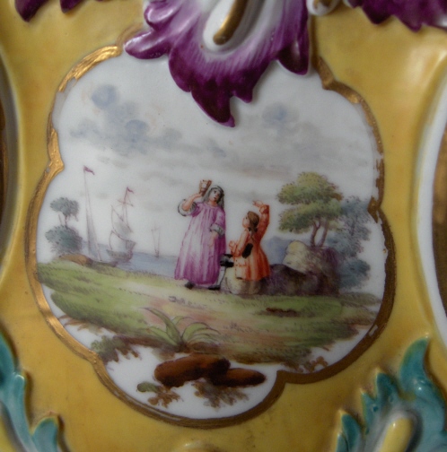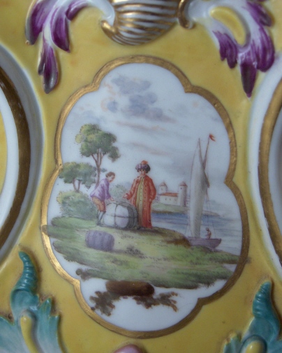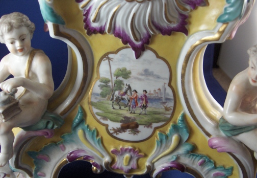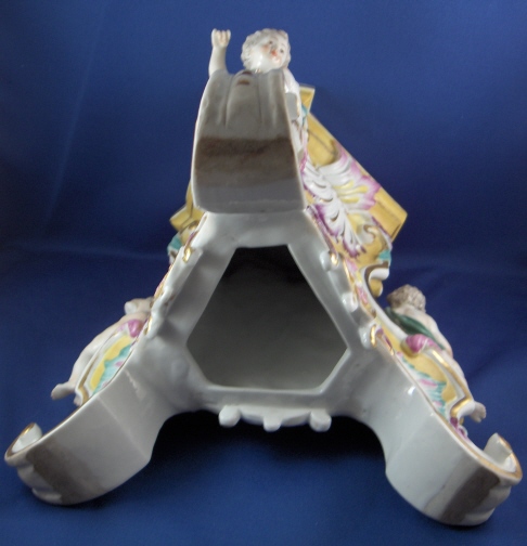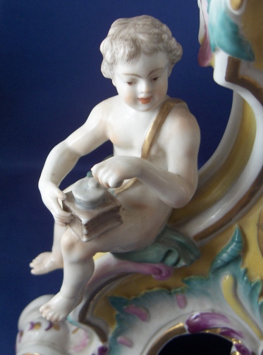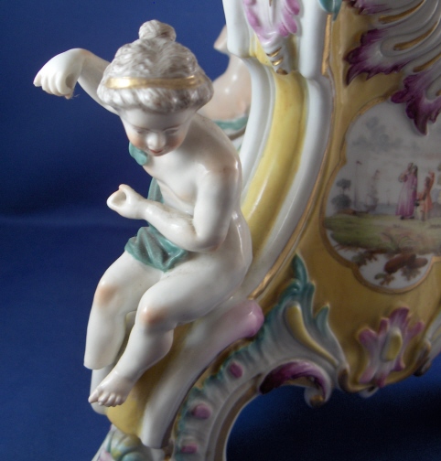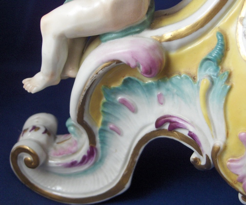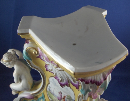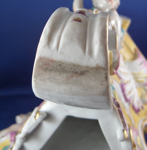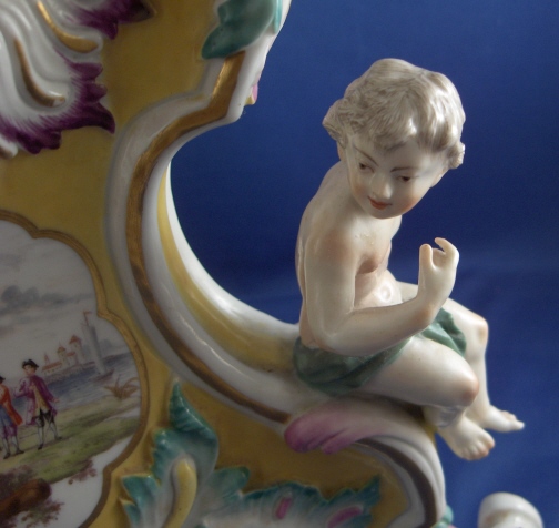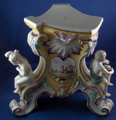 This is a rare stand for a liquor / spirits barrel made by Meissen in the 1740's. It is superbly made with three putti - one on each leg, lots of fancy molding work, a yellow ground color and three cartouches with merchant scenes in them. It doesn't get much better than this except if you had the barrel as well. And you can find the barrels alone but not the stand so if you have the lonely barrel here is your stand! I took lots of pictures to show all the detail since it is a bit much to describe. One putto is holding what looks like a coffee grinder which is kind of neat. The stand is in great condition with a small restored chip to the top edge, the girl putto has a paint flake on the back of her, a missing pinky on her right hand and a missing right foot and lastly the other putto has a missing left arm and some damage in his lap and I do believe he was broken off the stand and/or in half and restored. The restoration work is quite good! Even with this little bit of damage I think it displays very well and is quite rare to say the least. It is rather large being 9 inches tall and 9.5 inches from foot to foot. The piece is unmarked but certainly Meissen from this period. It is not uncommon for pieces to be unmarked during the early days of Meissen! Please email me for more information or other pictures.