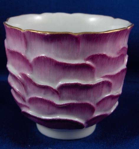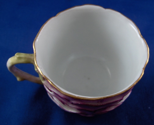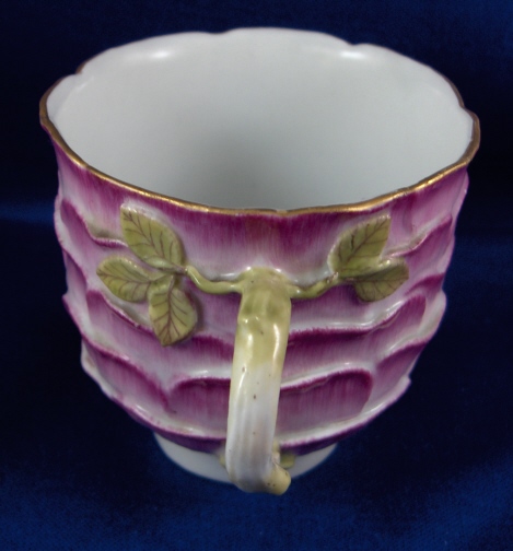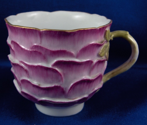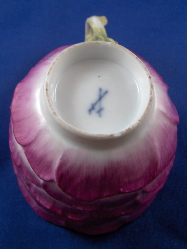 This is a rare cup made by Meissen in about 1745. It is modeled in the shape of a lotus flower and handpainted very well with lots of detail in mostly puce with the handle being green. The handle is in the shape of a branch with leaves growing out of the top to both sides. Nice gold trim to the rim. It is in perfect condition. The cup is 2.5 inch tall and 2.75 inches in diameter. It is marked with the underglaze blue crossed swords mark underneath. Please email me for more information or other pictures.