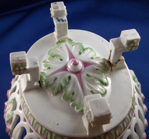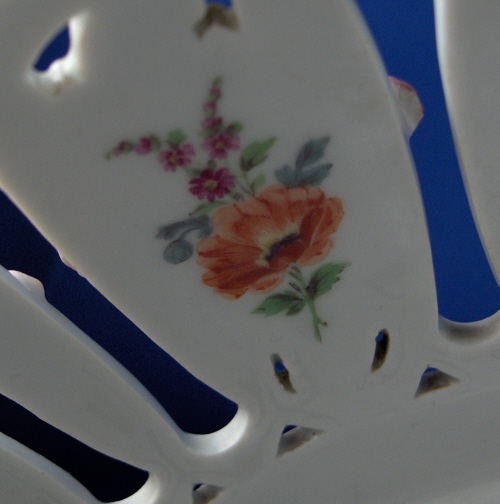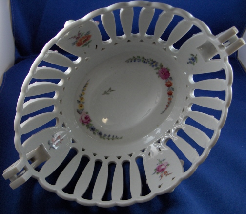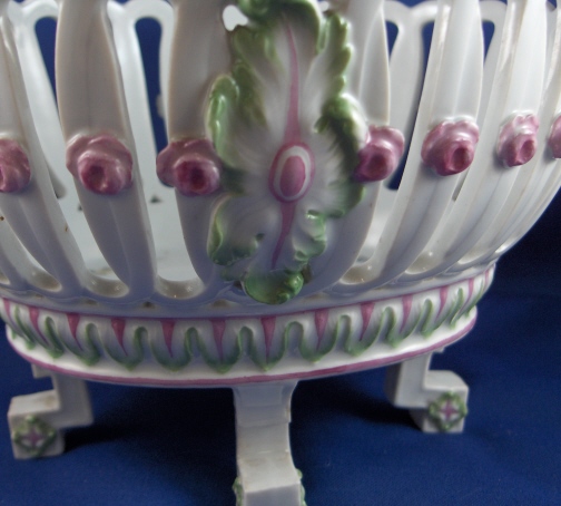 This is a reticulated basket made by Meissen around 1800. It is handpainted with flowers and there is lots of relief work in the shape of roses and leaves that are painted pink and green. A superb example of the classical period when Meissen was under control of Graf Marcolini. The basket is marked on one of the legs with the blue underglaze crossed swords with the star under it as well as the number 11. On another leg there is a puce number 11 probably a painters mark. The basket is in good condition considering all the reticulation. It has one leg put back on with a metal piece inside of it but needs to be redone since it wobbles a bit and the covering to hide the metal is gone. Also one chip to the bottom rim which could easily be fixed as it is shallow and not big. The handles and the whole basket itself is in top shape which amazed me. It is 5.5 inches tall not including the handles, 10 inches wide including the handles and 7 inches deep. Please email me for more information or other pictures.