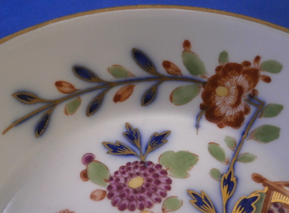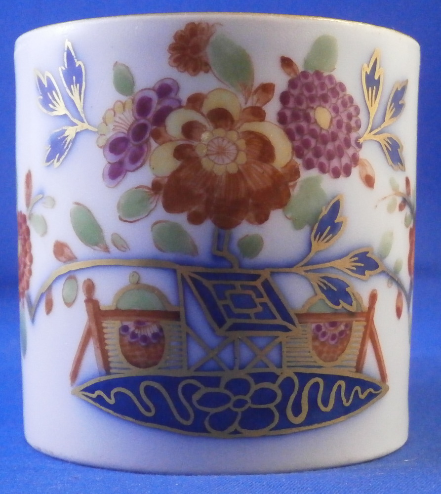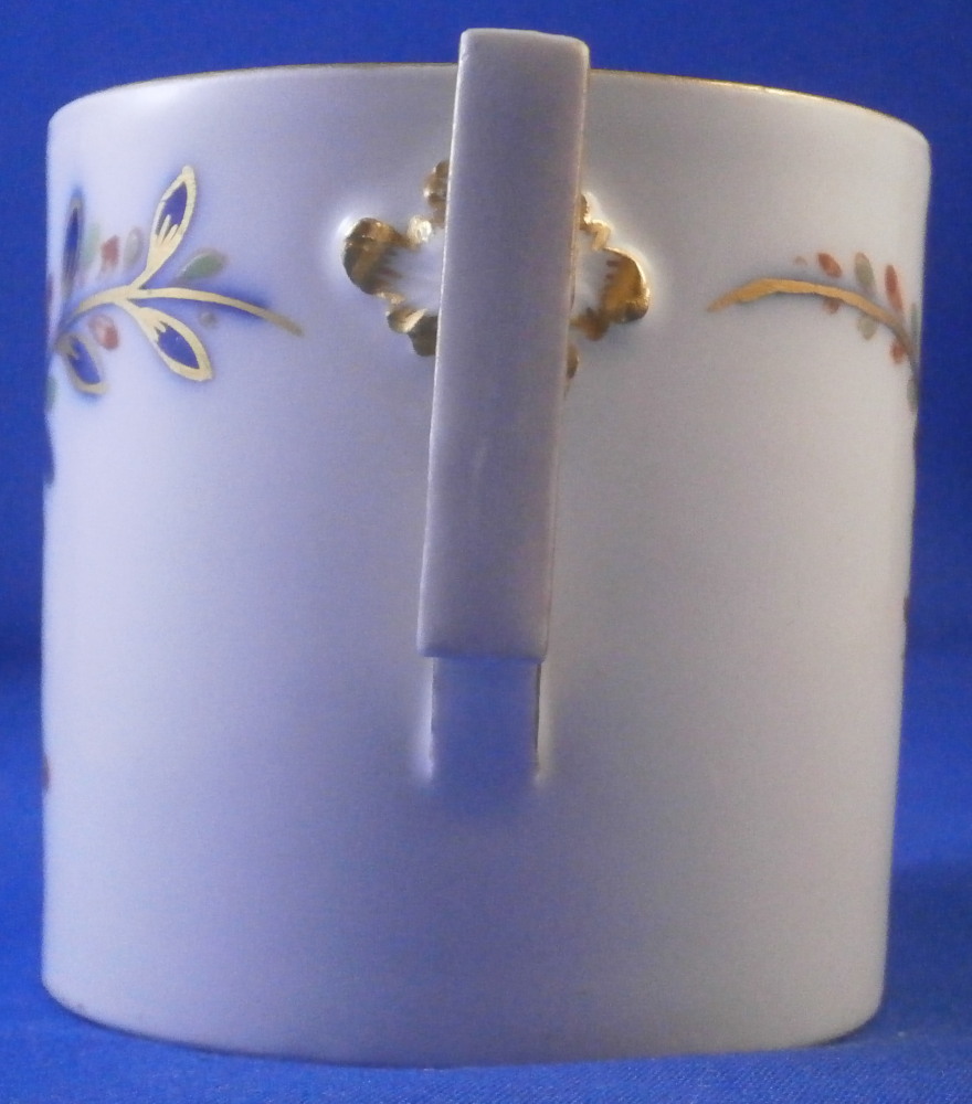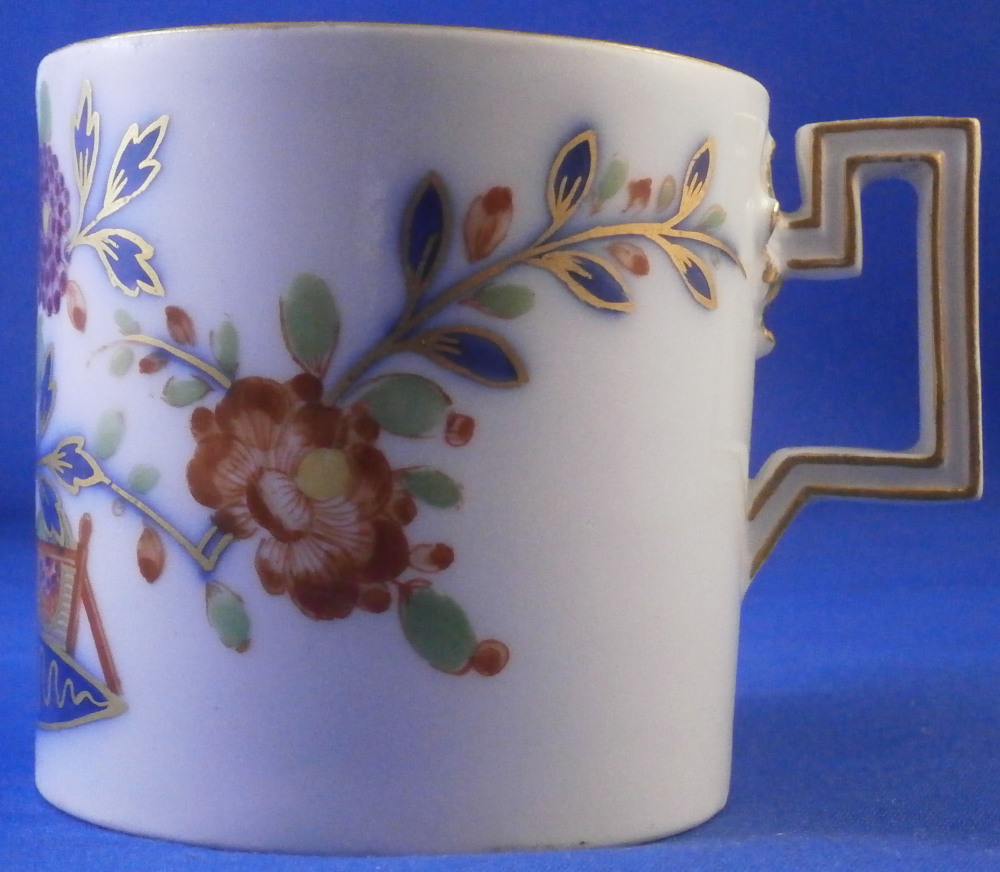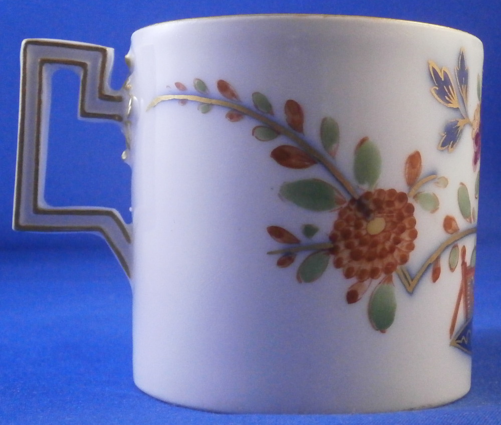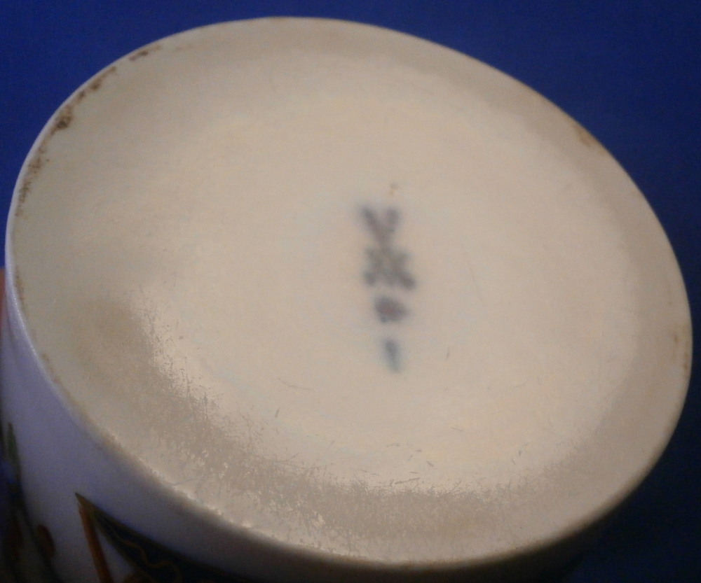 This is a nice coffee cup and saucer made by Meissen in the later 18th century during the Marcolini period. Both pieces are hand painted with a really nice polychrome version of the famous Tischchenmuster (little table design) in iron red, puce, blue, green, yellow and gold. The table is in under glaze blue with Imari type flowers all around going into the rim. On the cup the design is going all around the the handle which is nice. Typical angular handle shape typical for this period and one of my favorites! Gold trim to the edges and the handle. This shape cup is not very common with the flat glazed bottom. The set is in great condition with just a minor touch of wear to the saucer where the cup sits and some wear to the bottom of the cup which is to be expected given it is flat and glazed. They display perfectly! Both are marked with the under glaze blue crossed swords mark with the star below as shown. Both ahve a blue line - right below the mark on the cup and on the foot ring of the saucer. Impressed numbers to both which is typical for Meissen. The saucer is 1.125 inches tall and 5.375 inches in diameter. The cup is 2.5 inches tall with a diameter 2.5 inches. Please email me for more information or other pictures.