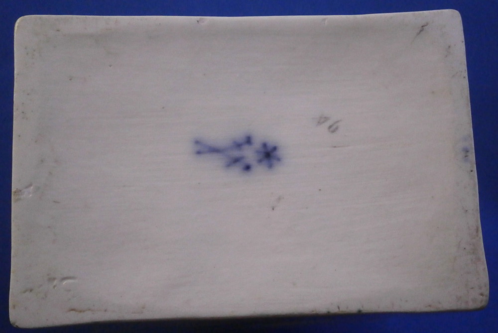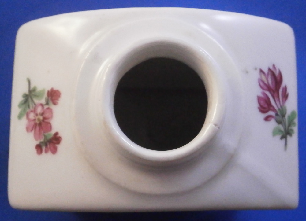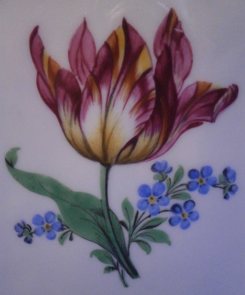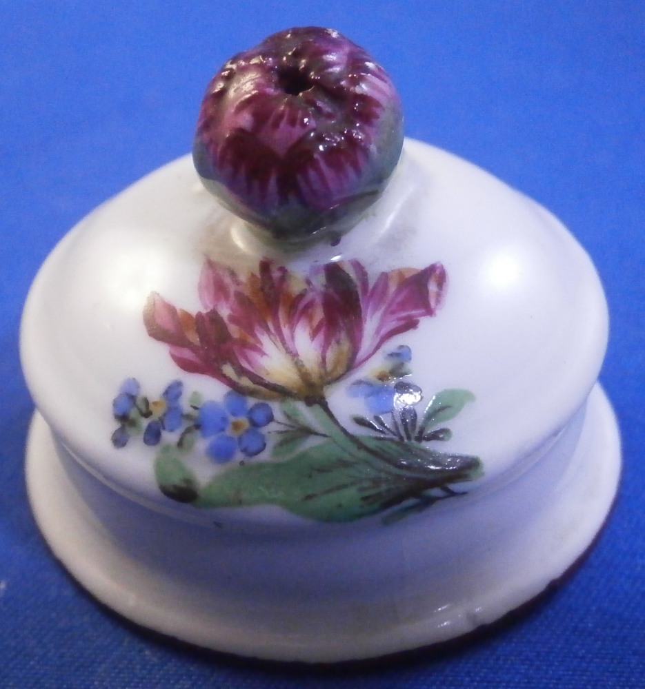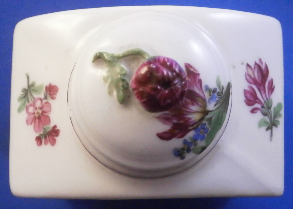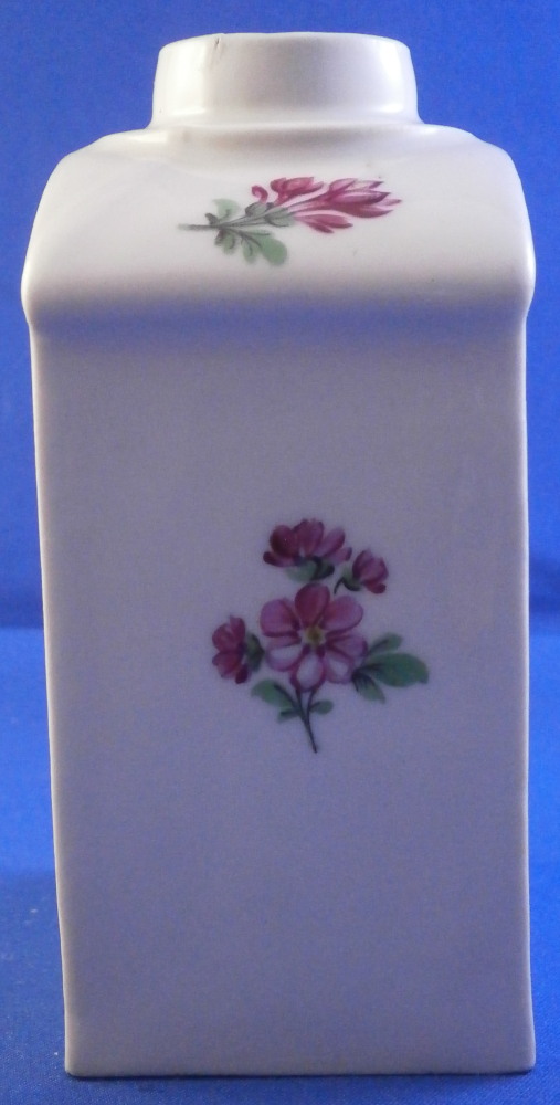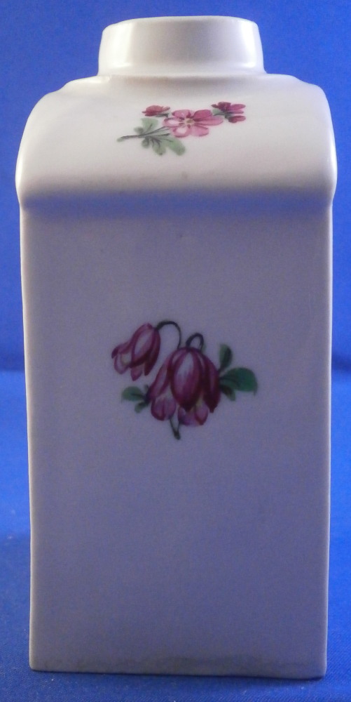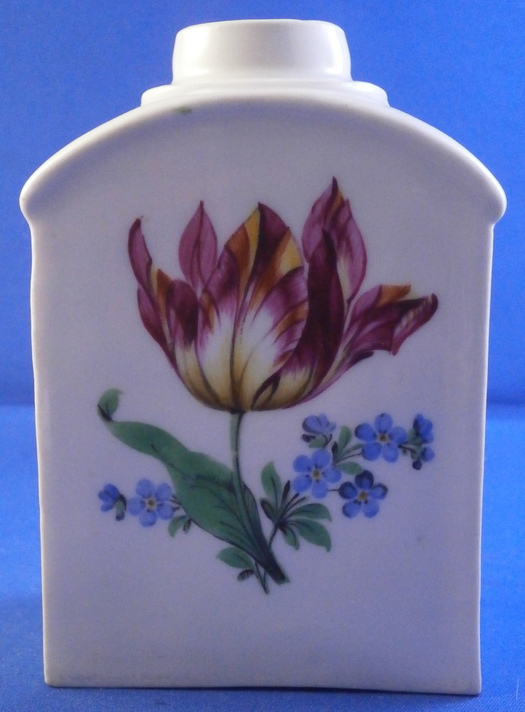 This is a nice tea caddy / jar made by Meissen during the Marcolini period of the late 18th into the early 19th century. Judging by the quality of the flowers it's still an 18th century example. Both the front and the back are hand painted with a floral arrangement including a large nice looking tulip with some small blue and yellow forgetmenots. Each side has a small flower to it as do the shoulders of the piece. The lid has a small floral arrangement to it matching the larger ones and a nice floral finial with brown trim to the bottom edge. The piece is in great condition with a small chip to the edge of the lid as shown with a tiny hairline in the chipped spot. A little paint would hide the chip perfectly and it displays nicely as is. The tea jar is marked underneath with the under glaze blue crossed swords mark with the star under it as well as a painter's number 94 (I think) as shown. The piece with the lid in place is 4.75 inches tall, 2.75 inches wide and 1.75 inches deep. Please email me for more information or other pictures.