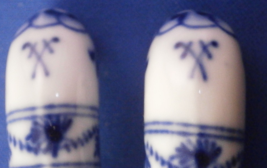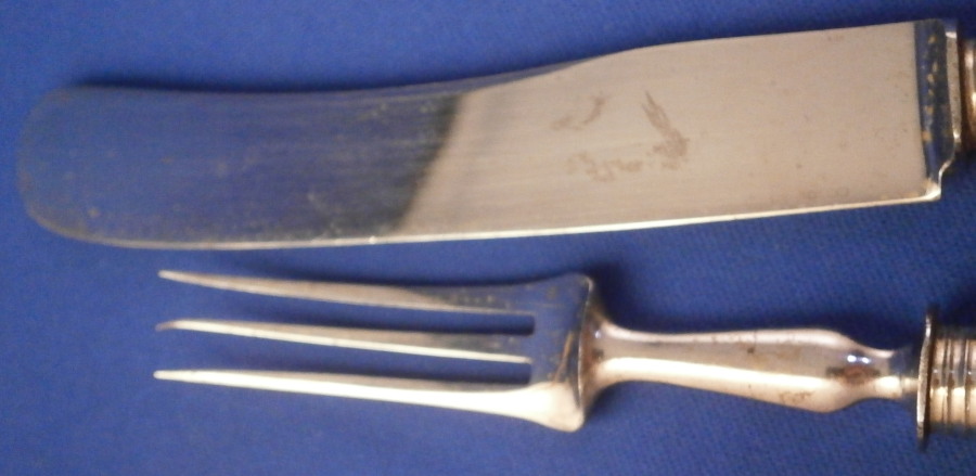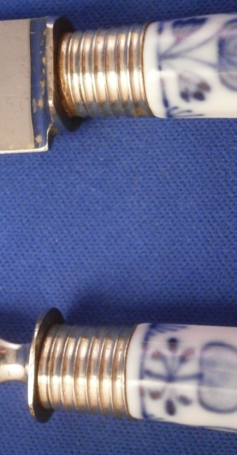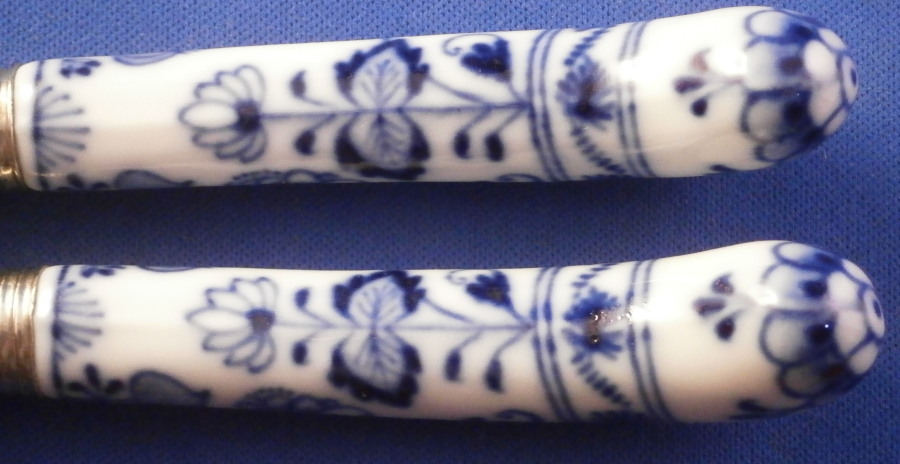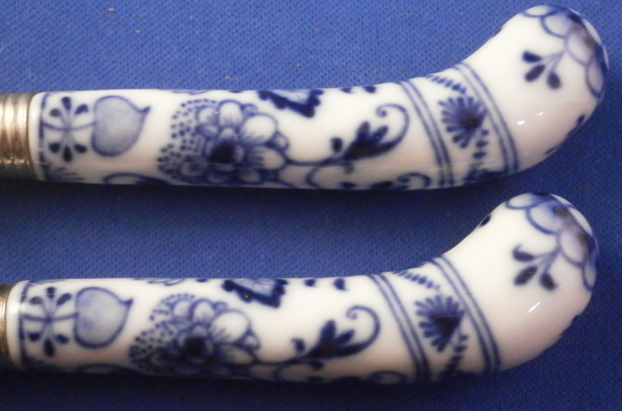 This is a nice porcelain handled knife and fork set made by Meissen in the late 19th or early 20th century. They are both visibly marked which is rather rare to see! Both porcelain handles are decorated with their famous under glaze blue onion ( Zwiebelmuster ) design. Each has the crossed swords mark on the end of the handle as shown. The fork is in great condition with just a bit of oxidation to the metal while the knife has a bout an inch long hairline going down the handle from the ferrule end that is very hard to spot. It still is solid and still a nice example to have especially with the matching fork. The knife is about 8.125 inches long while the fork is about 7 inches long with the visible porcelain being about 3.125 inches long. Please email me for more information or other pictures.