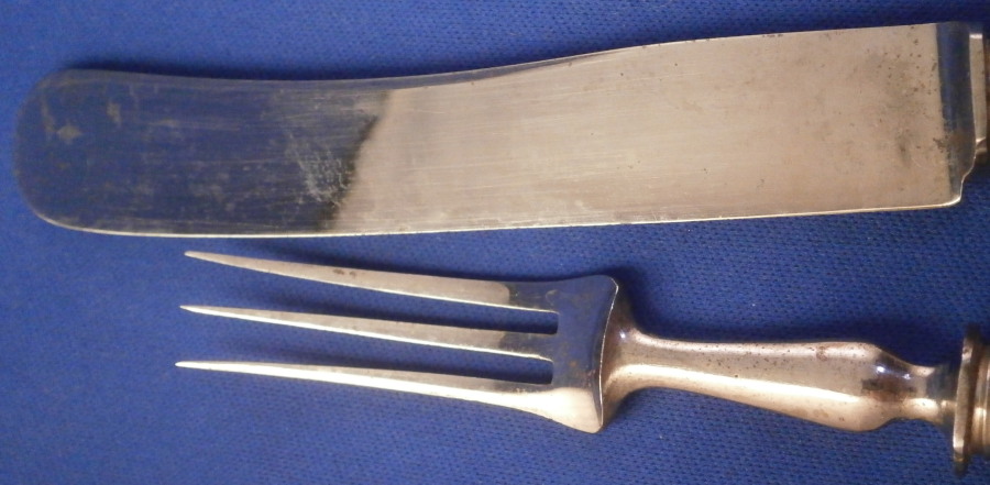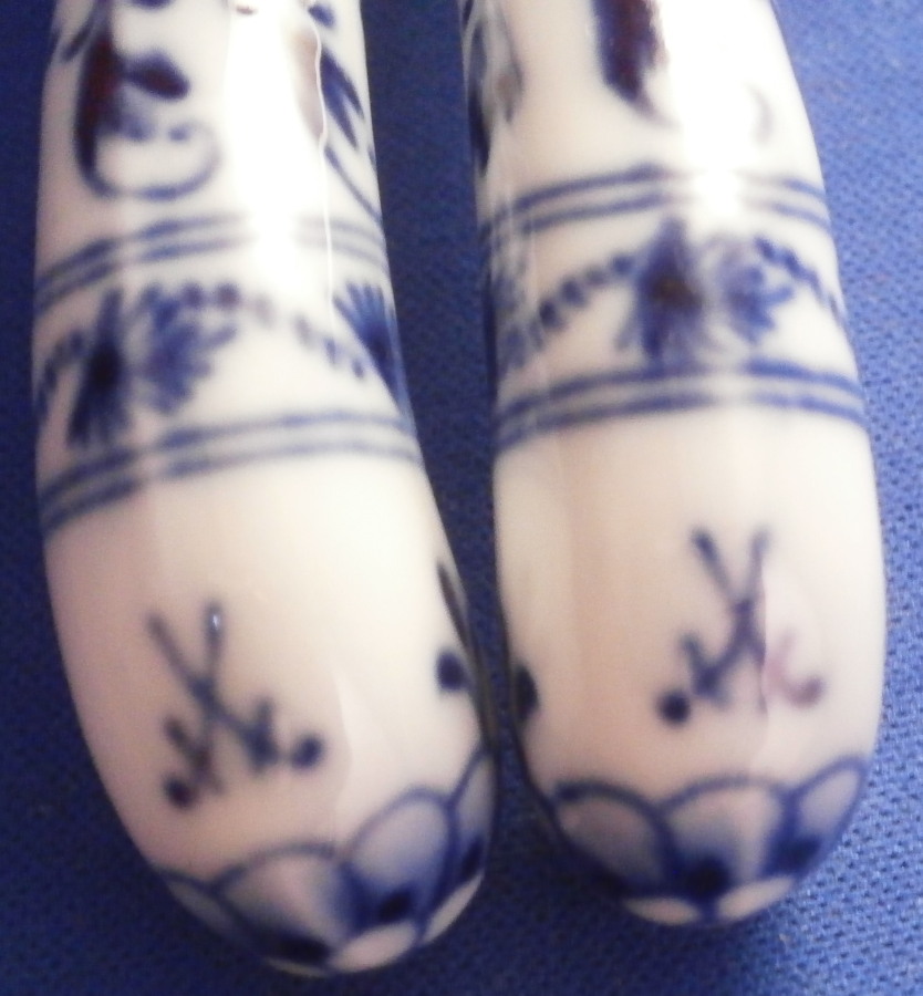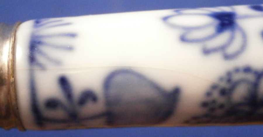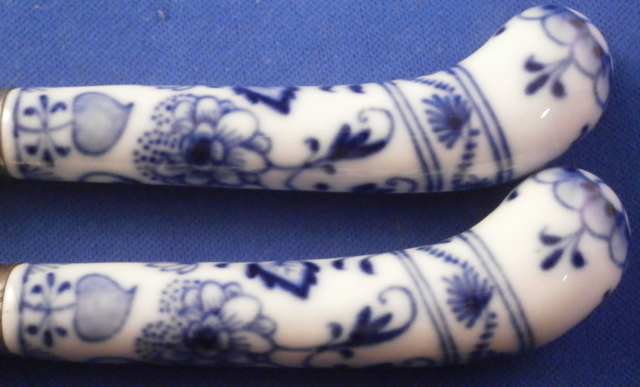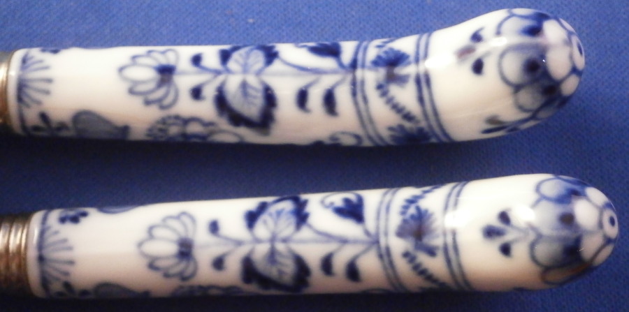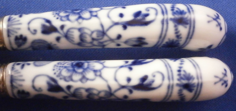 This is a nice porcelain handled knife and fork set made by Meissen in the late 19th or early 20th century. They are both visibly marked which is rather rare to see! Both porcelain handles are decorated with their famous under glaze blue onion ( Zwiebelmuster ) design. Each has the crossed swords mark on the end of the handle as shown. The set displays perfectly but the fork has some slight cracks near the ferrule that are stable and jsut at the very edge while the knife has about an inch long hairline going down the handle from the ferrule end that is very hard to spot and very tight. A bit of oxidation to the metal on either pieces which is to be expected. They are still a nice example to have especially with it being a matching set. The knife is about 8.125 inches long while the fork is about 7 inches long with the visible porcelain being about 3.125 inches long. Please email me for more information or other pictures.