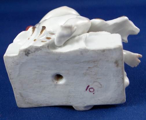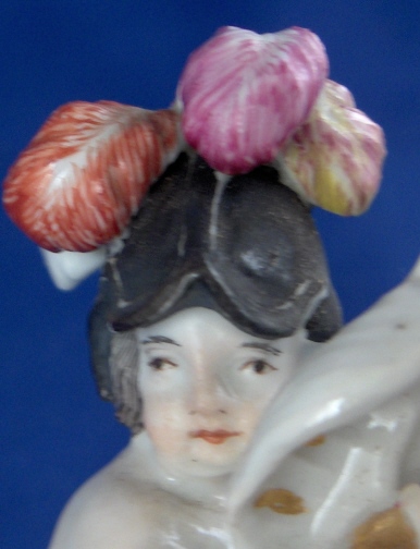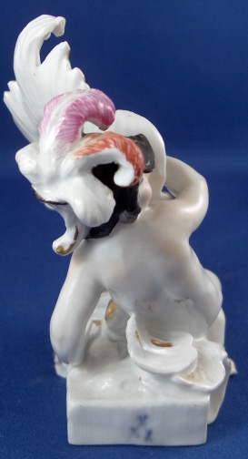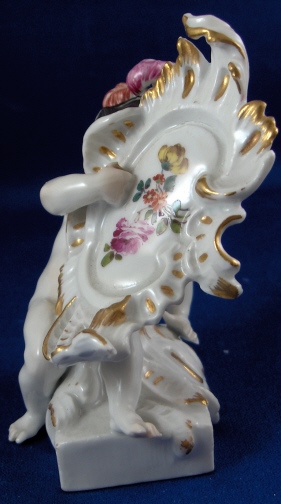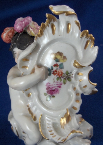 This is a figurine of a little putto representing Mars with his shield made by Meissen in about 1750. He is sitting on a rectangular pedestal holding his fancy shield on his lap in front of him. The shield is decorated with a small floral arrangement and lot of gold detail. He is wearing a helmet with some feathers on it which is quite nice. The helmet is a matte black color so it was likely originally a silver luster color which has tarnished over time. The figurine is in top condition with almost no wear at all and the only minor issue I can find is that heleft hand that is leaning on the pedestal looks like it is a bit chipped underneath though very likely from the making and not later and cannot be seen unless you turn him over and look for it. The bottom of the base is flat and filled with only the air hole in it. It is marked with the underglaze blue crossed swords on the back of the base and a puce number 10. underneath. The figure is 3.375 inches tall, 2.375 inches wide and 2 inches deep. Please email me for more information or other pictures.