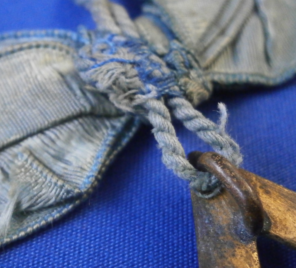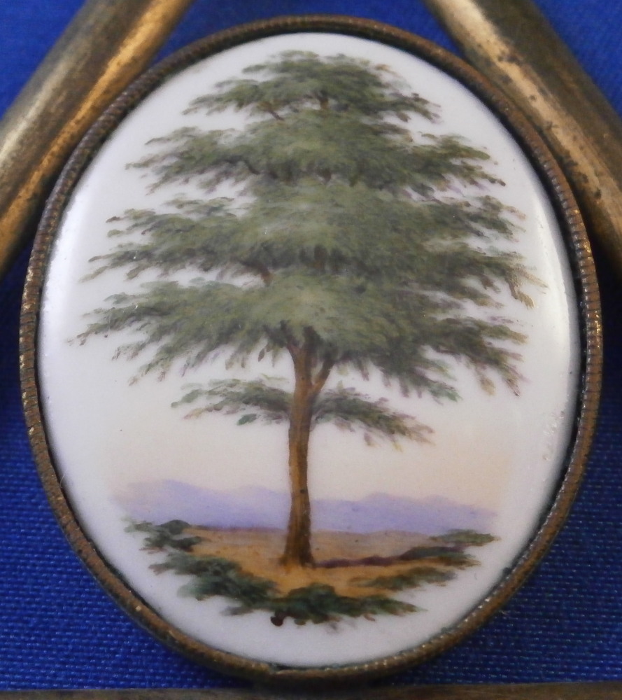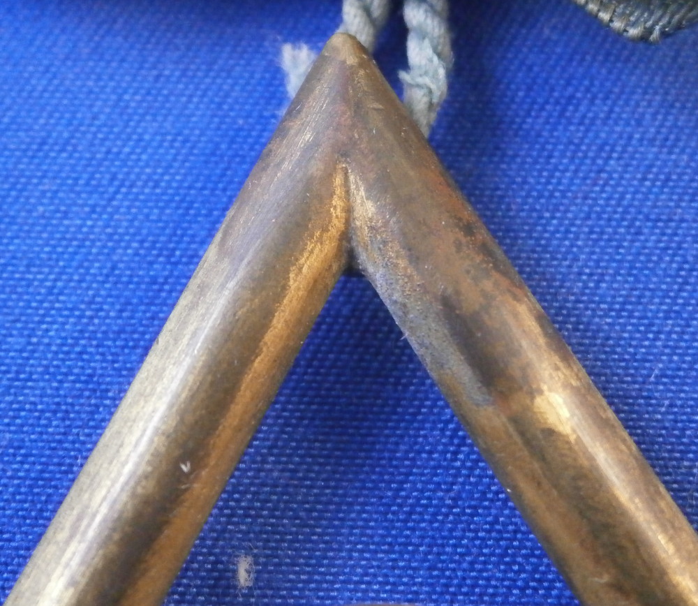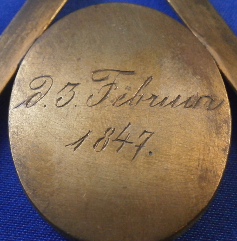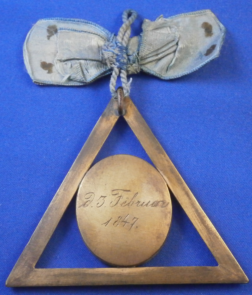 This is a really interesting piece. It is a masonic emblem with a little porcelain plaque in the center made by Meissen in the mid 19th century. The piece came from the Loge zur Akazie im Orient located in the city of Meissen. The porcelain plaque has a hand painted arcacia tree on it which is superb. This tree was their symbol and is well known to be associated with the freemasons . And since this lodge is located in Meissen it only makes sense to ahve a piece of Meissen porcelain for their use :) The little plaque has a small brass or bronze mount around the edge and back which is conencted to the brass or bronze triangle. This has a little loop to the back top part which has a silk string and bow connected to it in order to be able to hang it on the wall. This was probably a nice blue at some point but has faded and is slightly worn and stained from age. The metal has oxidized a bit as well and could use a polishing but I won't do that. The plaque is perfect! The markings on the back of the metal are incised 23. Februar 1847. Nice way to date the piece. The porcelain plaque is likely marked in the back with the crossed swords but I won't try to pry it out. Quality matches this maker so I have no doubt it was made by them. Fun piece with a nice provenance and an interesting conenction to the freemason group. The piece is 2.875 inches in each side of the triangle, the bow is 2.75 inches wide and adds about 1.125 inches in height. The porcelain plaque is just over 1 inch wide and just under 1.375 inches tall. Please email me for more information or other pictures.