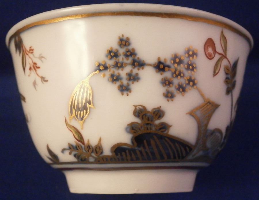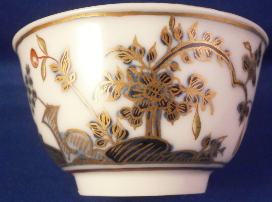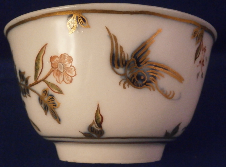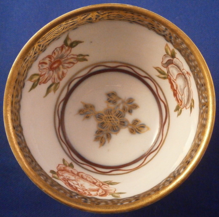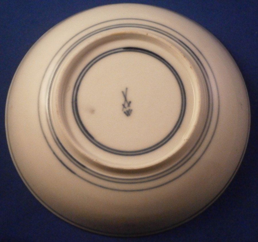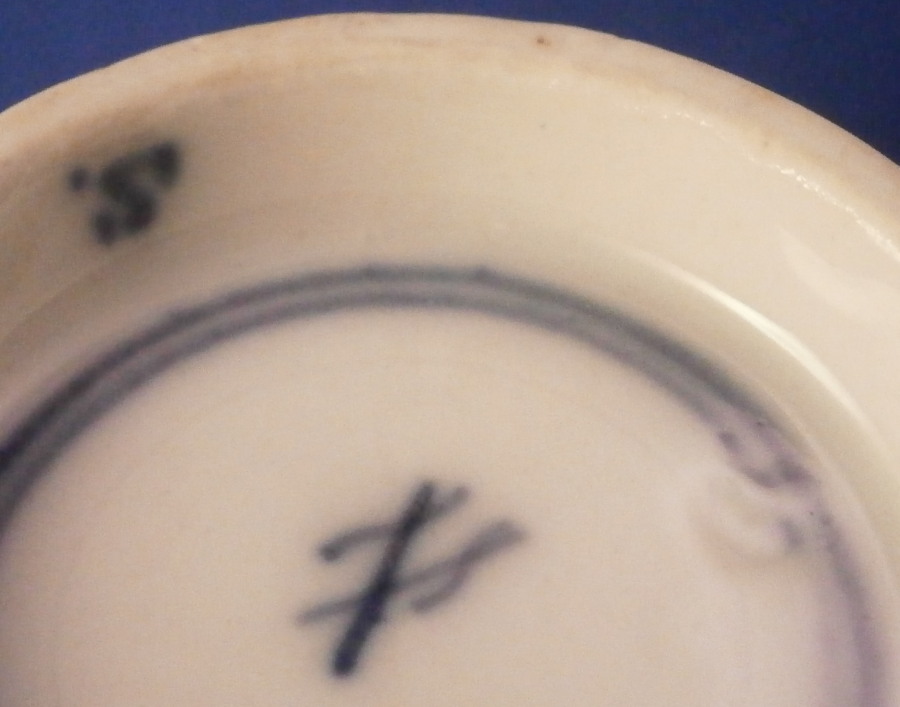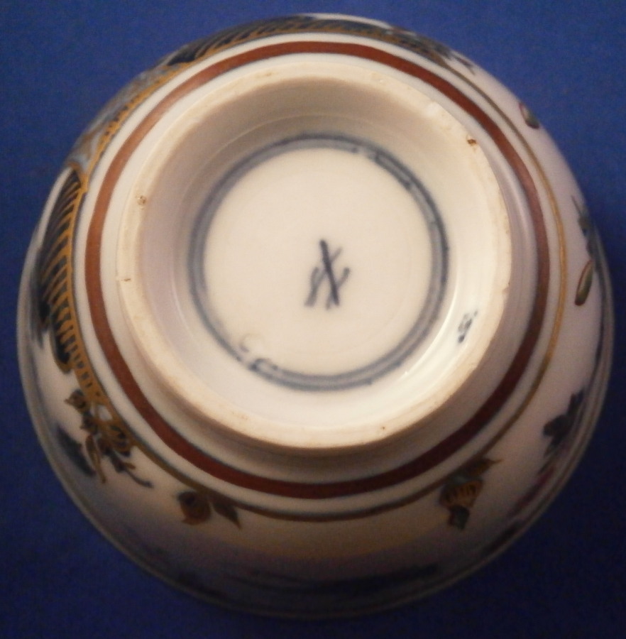 This is an early teabowl shaped cup and saucer set made by Meissen around 1750 and decorated by the famous Franz Ferdinand Mayer in Pressnitz , Bohemia . One could easily think it was painted by Ferner but these red outlines flowers are usually associated with Mayer. He was active from about 1745 until 1776 and his items are rare and highly collectable. The cup has the under glaze blue rock and bird pattern to it painted by Meissen with the gilding, the red trim and polychrome fowers added at the Hausmaler shop of Mayer. A really nice looking set and quite rare. This is a nice example of his work in the typical colors and style. The cup & saucer are in great condition with just a touch of wear to the gilding. The Koeppchen cup is 1.75 inches tall and 3.125 inches in diameter. The saucer is 1 inch tall with a diameter of 5.125 inches. Both pieces are marked with the under glaze blue crossed swords mark underneath as shown from about 1745-50 and an impressed number. Each also has a blue painter's mark - and S. on the cup and W on the saucer. Please email me for more information or other pictures.