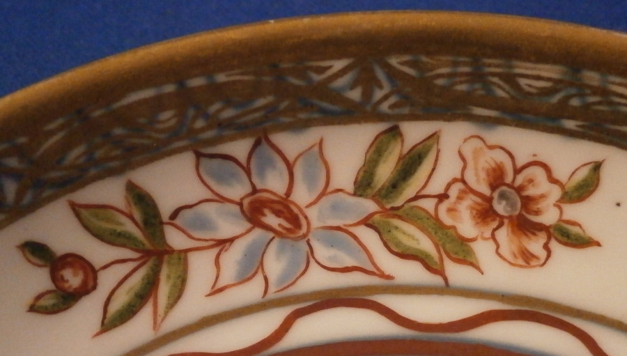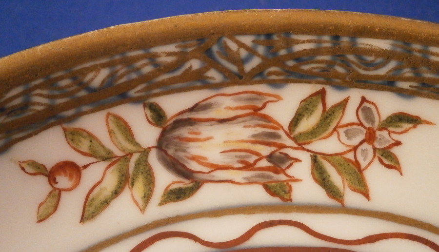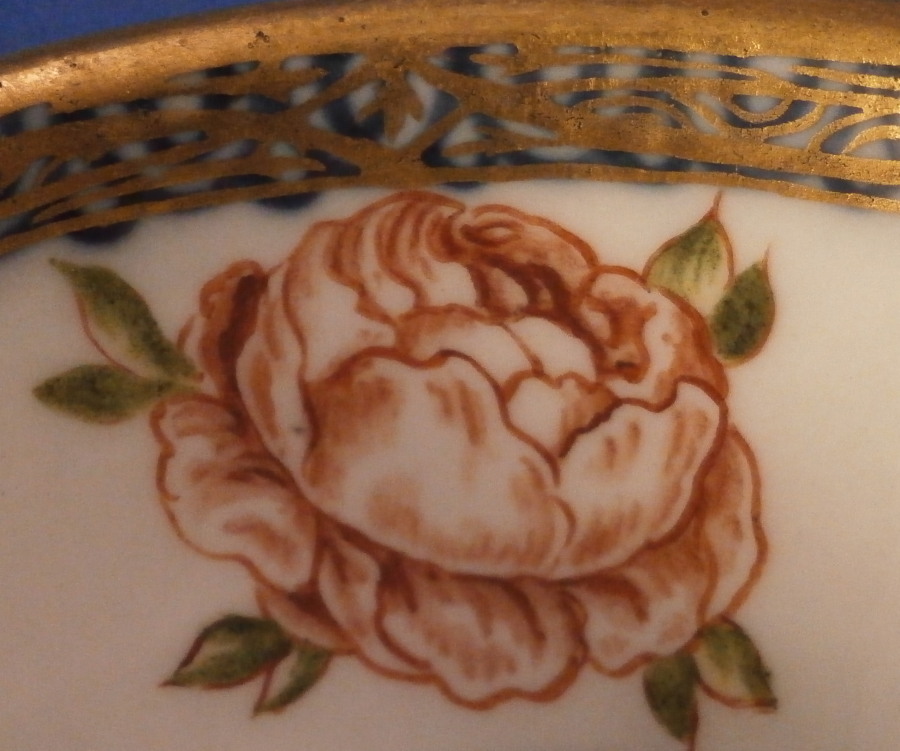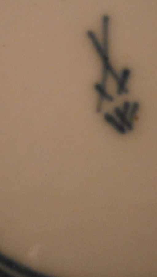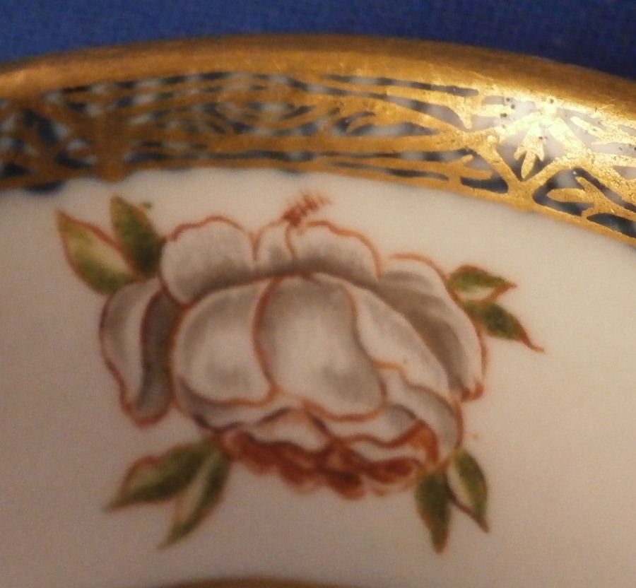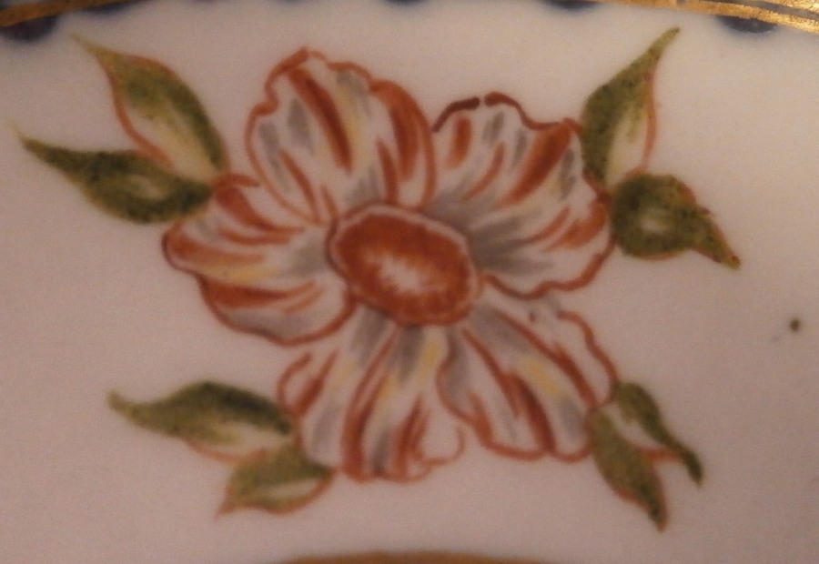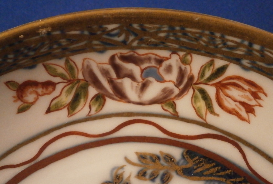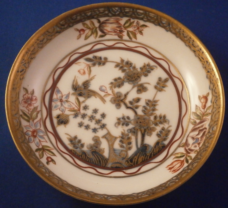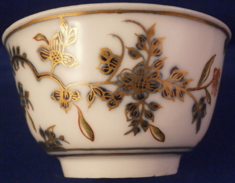 This is an early teabowl shaped cup and saucer set made by Meissen around 1750 and decorated by the famous Franz Ferdinand Mayer in Pressnitz , Bohemia . One could easily think it was painted by Ferner but these red outlines flowers are usually associated with Mayer. He was active from about 1745 until 1776 and his items are rare and highly collectable. The cup has the under glaze blue rock and bird pattern to it painted by Meissen with the gilding, the red trim and polychrome fowers added at the Hausmaler shop of Mayer. A really nice looking set and quite rare. This is a nice example of his work in the typical colors and style. The cup & saucer are in great condition with just a touch of wear to the gilding. The Koeppchen cup is 1.75 inches tall and 3.125 inches in diameter. The saucer is 1 inch tall with a diameter of 5.125 inches. Both pieces are marked with the under glaze blue crossed swords mark underneath as shown from about 1745-50 and an impressed number. Each also has a blue painter's mark - and S. on the cup and W on the saucer. Please email me for more information or other pictures.