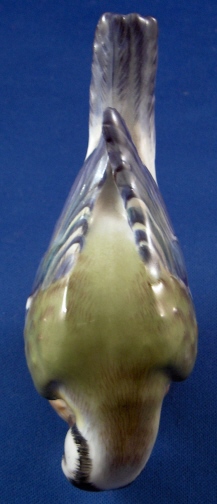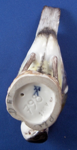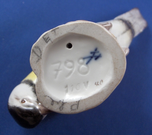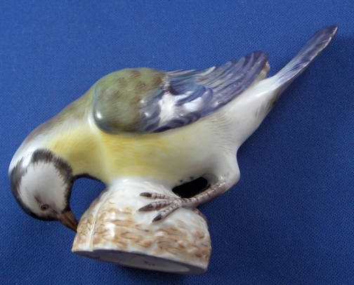 This is a bird (a bluetit I believe) made by Meissen in the first half of the 20th century. It is pecking at a walnut that it is standing on and is superbly handpainted with lots of detail! It is in superb condition. The piece is marked with the blue swords underneath. It also has an impressed 798 and 116V underneath and a black number 40. The bird is 3.5 inches tall, 3.75 inches long and 1.75 inches wide. Please email me for more information or other pictures.