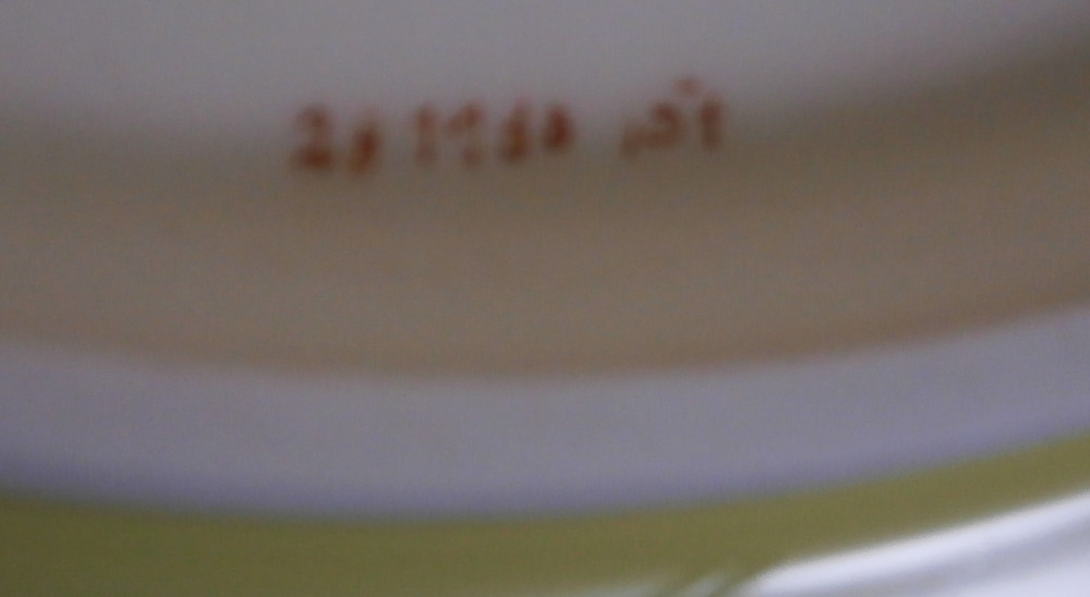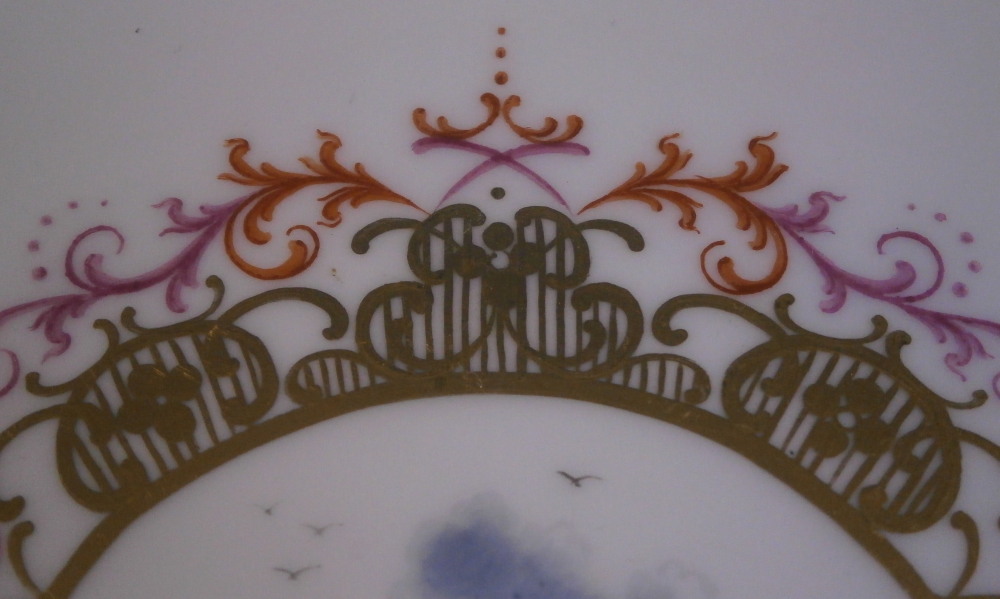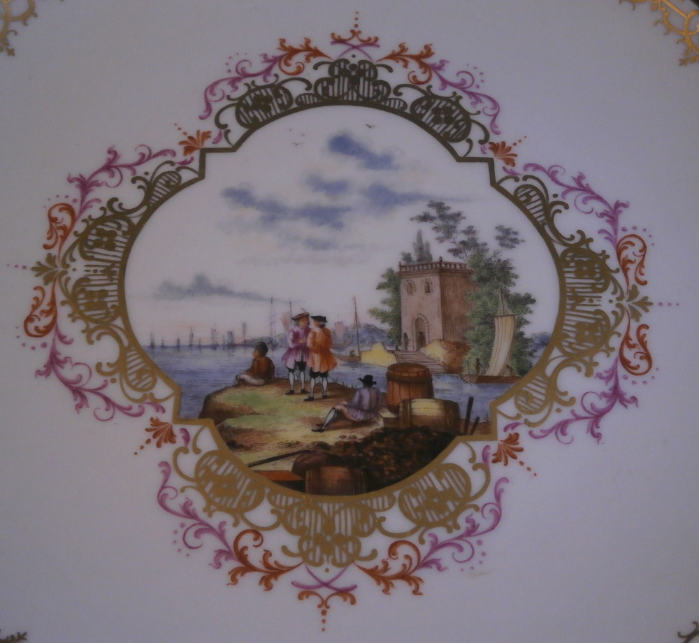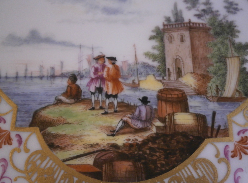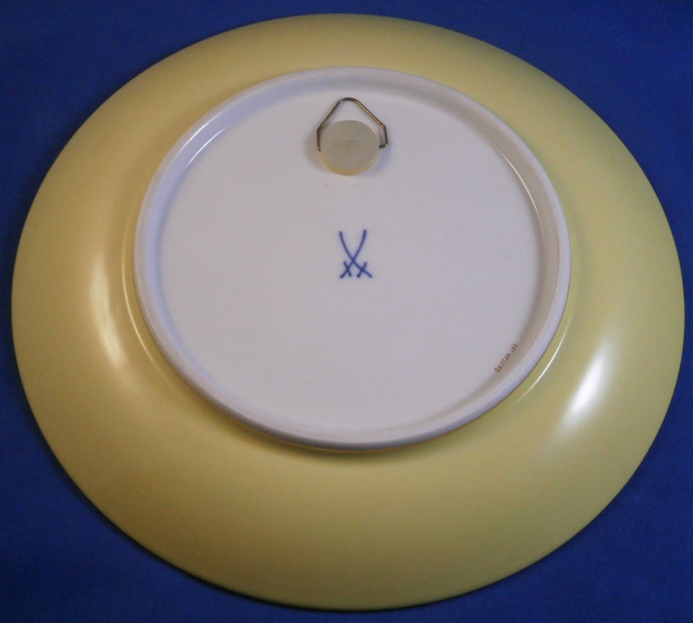 This is a superb plate made by Meissen in the later 20th century. It is hand painted with a harbor / merchant scene surrounded by a fancy gold, puce and red trim. Another fancy gold trim along the edge but my favorite part is the yellow ground color to the underside rim! The piece is quite rare as this type of design is not made foten anymore. Most date to the 18th century when they were first made. So this is a rare chance to own a piece in perfect condition! or a more modern one and looks very much like the original 18th century ones!The plate is just under 1 inch tall and 7.875 inches in diameter. Marked underneath with the under glaze blue crossed swords mark (first choice) as well as a some red and impressed numbers as shown. Attached hanger to be able to hang it on the wall safely. Please email me for more information or other pictures.