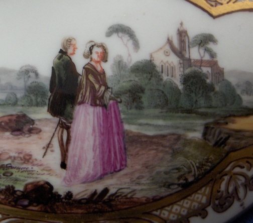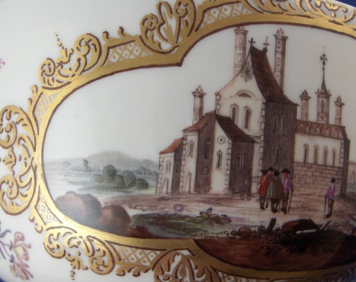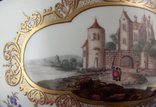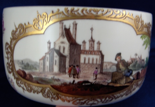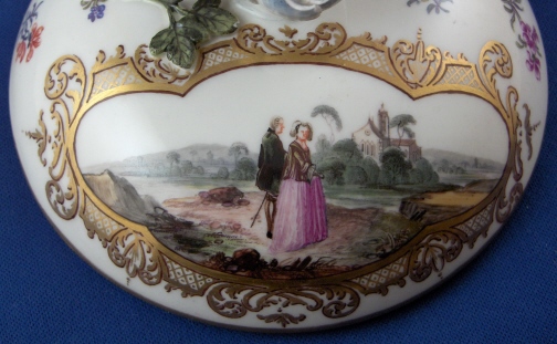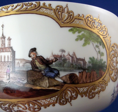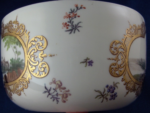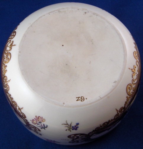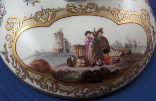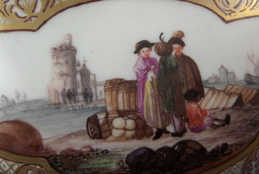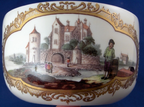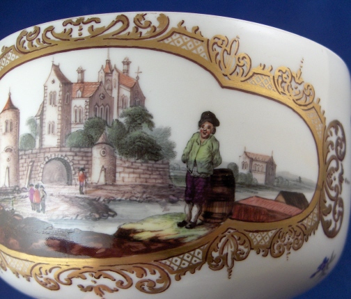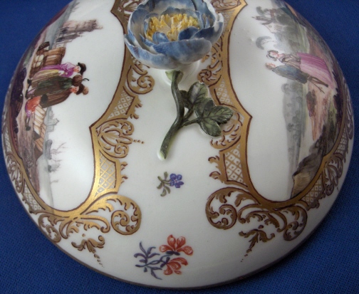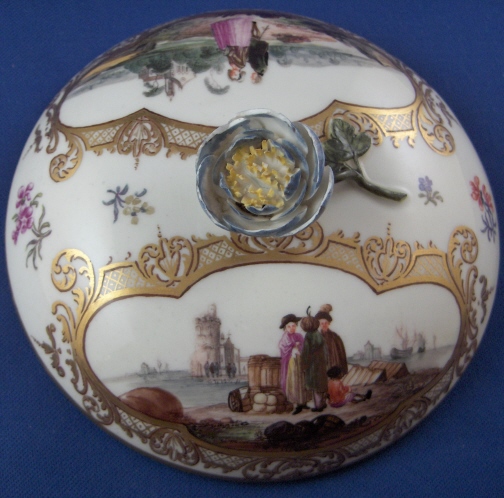 This is a very early lidded sugar box made by Meissen in about 1745. I have rarely seen as nice a sugar dish from this period as this one if ever. It is superbly handpainted with four large merchant / harbor type scenes with lots of superb gilding around these scenes and some small flowers scattered in between. The lid has a large flower finial that is very nice. The detail of the scenes is stunning ad they are rather large. The really interesting thing is (I think) that on the main body scenes there is a much larger than usual figure to the right side which seems to be a later addition than the rest of the scene kind of like an afterthought or special request (but done at the time and at Meissen). One can see the old scene though them if you really look. Never seen anything like it! The gold trim is also very nice and quite detailed typical of the period. The box is in amazing condition with just some minor damage to mostly two petals of the flower finial. The dish with its lid is 4 inches tall including the finial and has a diameter of 4.625 inches. It is marked underneath with a gilders mark Z9. on an old unglazed type bottom. I am sure it once had blue crossed swords but they disappeared during the firing and time since which is not uncommon on these old unglazed bottom pieces but more common on figurines. Please email me for more information or other pictures.
