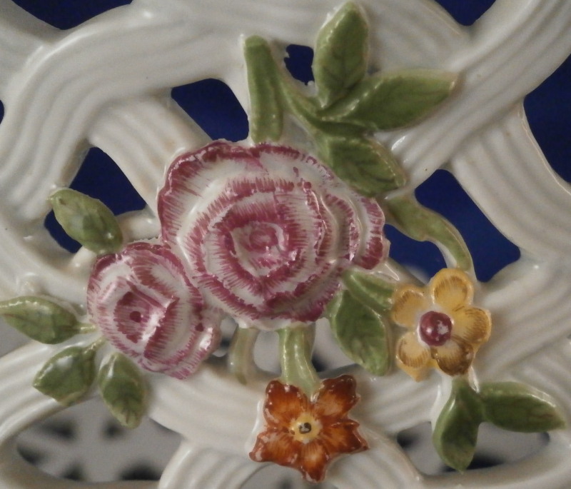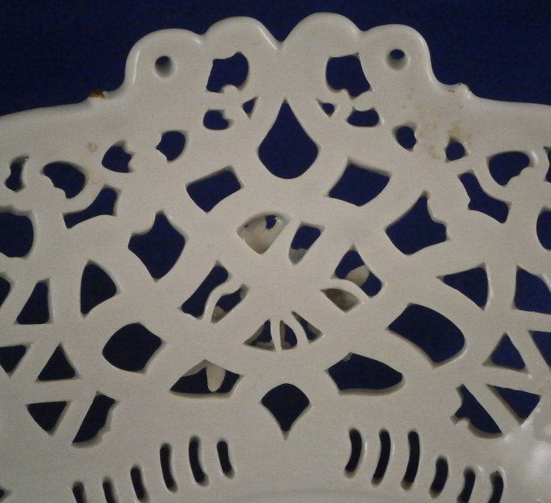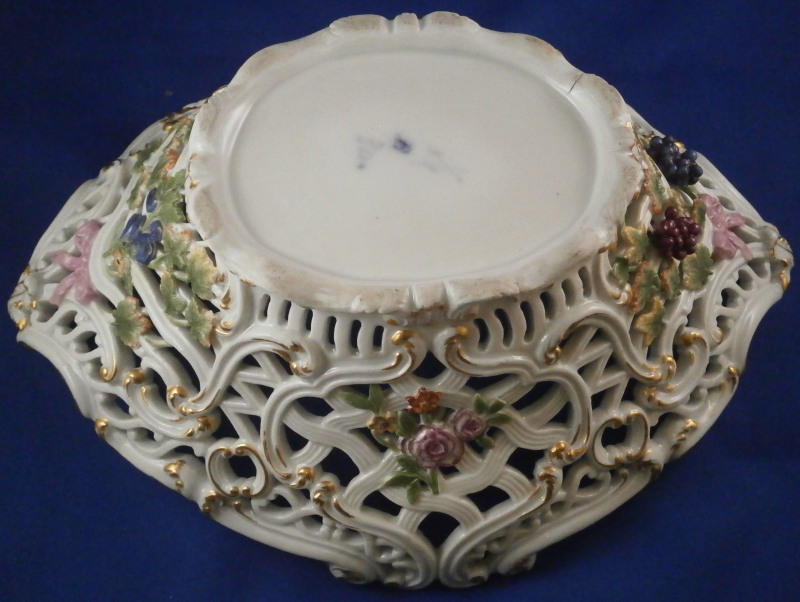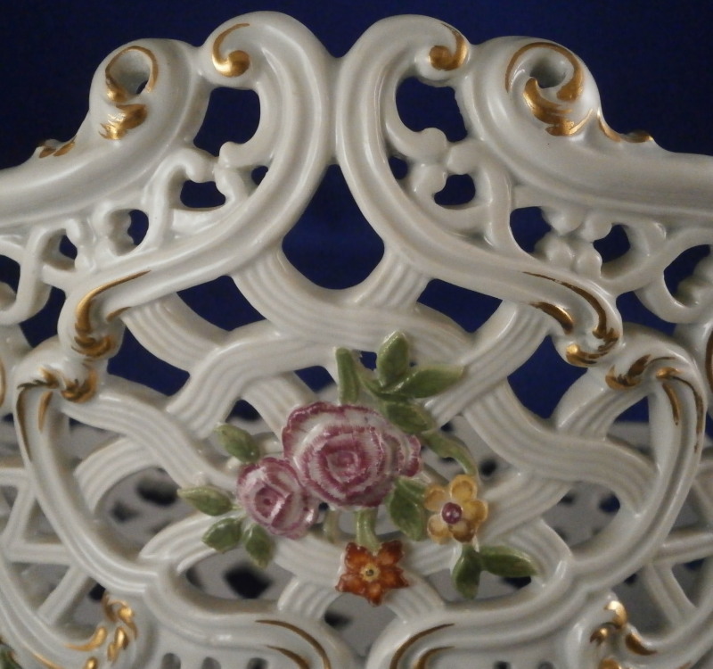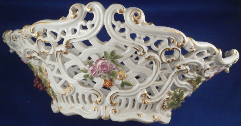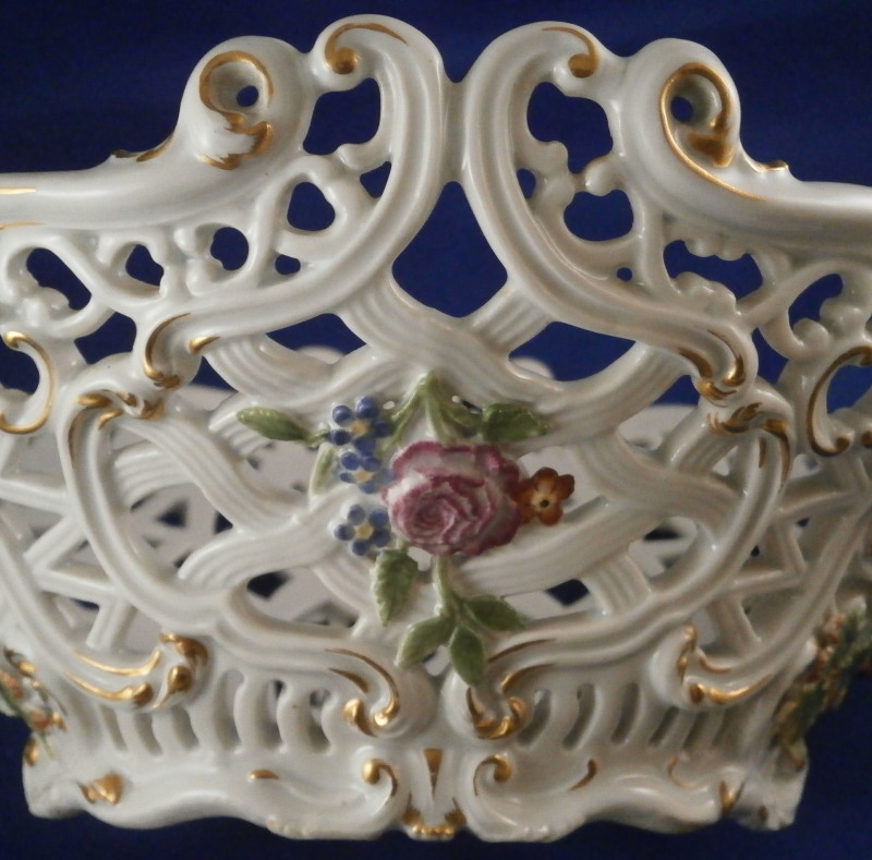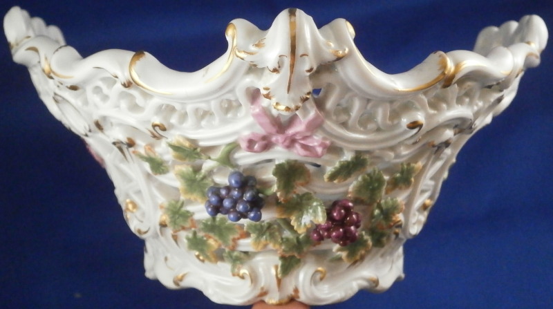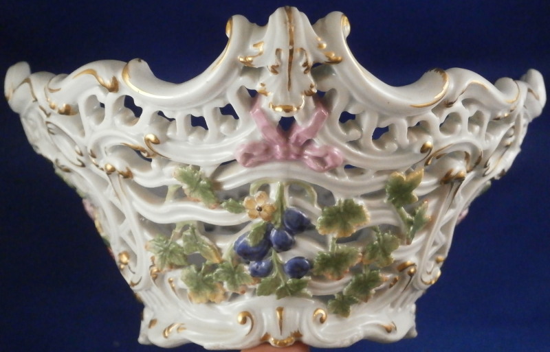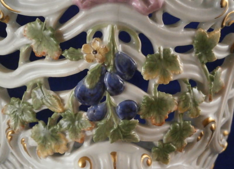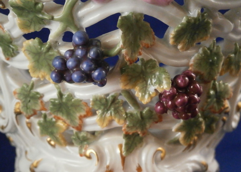 This is a nice early reticulated basket made by Meissen during the mid 18th century likely right around 1740. The piece is superbly modeled with a reticulated design all around that lots of extra detail to the outside as well as gold highlights and a had painted floral design to both the front and the back and a grape vine leaf / garland design to the sides that was often used during this period and a bit earlier. The grape vines are painted with superb detail including the veins on each leaf and each leaf is painted differently with not just green but also some yellow or orange. A stunning basket in almost perfect condition besides the occasional chip to a leaf as shown. The basket is marked underneath with the blue under glaze crossed swords mark as shown - an early version as well as an udner glaze blue B and a 30. marks of people that worked on the piece and were used during this period. The piece is 3.75 inches tall, 9.75 incheslong and 7.375 inches wide. Please email me for more information or other pictures.