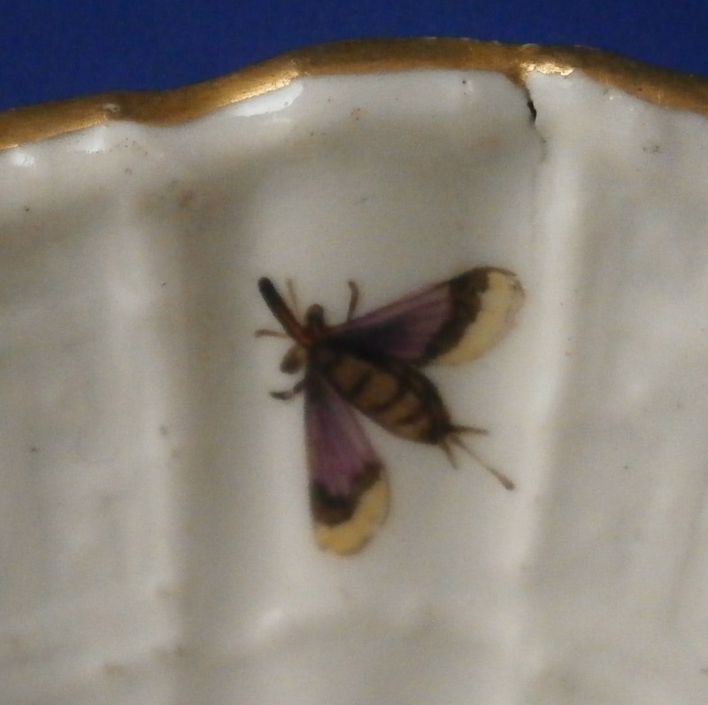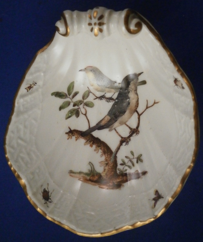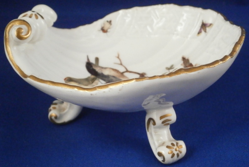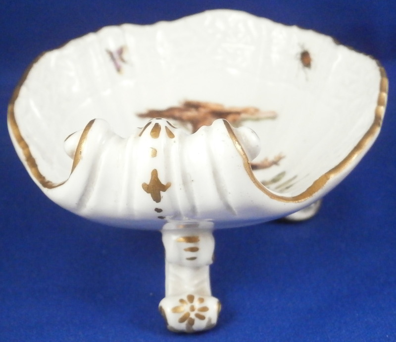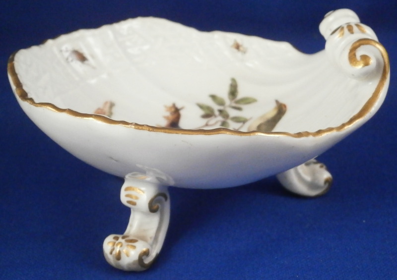 This is a superb open salt dish made by Meissen in about 1740. A really nice example in terms of shape and painting. The piece has a shell shaped dish on top sitting on three feet. The dish rim has a nice relief design to the paste and four bugs painted on that with the center having a nice hand painted bird scene to it including two birds sitting on a branch with some greenery. Nice gold trim to the edge, end and feet. The piece is marked with the under glaze blue crossed swords mark on the underside as shown. No numbers yet. The salt dish is 1.875 inches tall, 3.125 inches wide and 3.625 inches long. It is in perfect condition with some minor firing flaws like a firing crack by one of the legs and the bottom of the feet have not been glazed and turned a dark grey over time. Just a superb piece! Please email me for more information or other pictures.