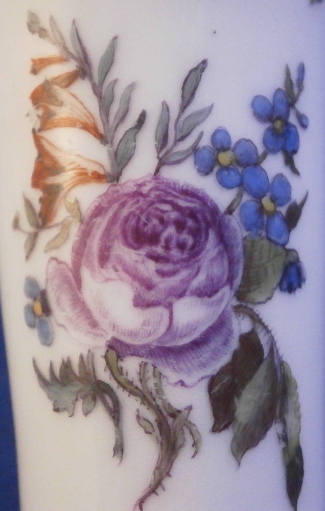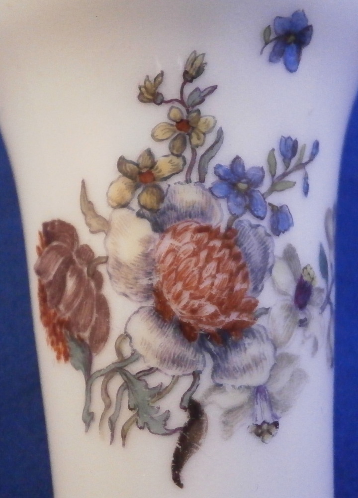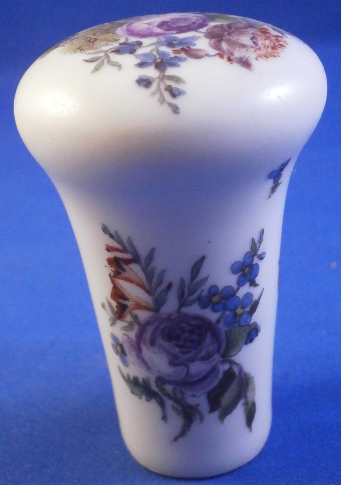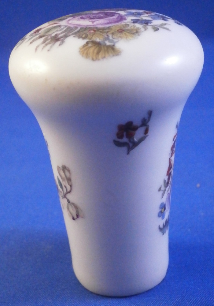 This is a rare early cane / umbrella handle made by Meissen around 1740 or a touch earlier. It is hand painted with three superb floral arrangements in the woodcut style as well as three tiny single flowers. The painting is of top quality and looks amazing. Nice shape to the piece as well which still fits in today! Just needs a can to attach it to and voila off you go :) The handle is just under 2.5 inches tall and has a top diameter of just over 1.5 inches. It is unmarked which is normal but there is no question as to who made it and when by looking at the quality and style of painting. The piece is in superb condition with just a touch of wear which does not show except in the enlarges pictures. It displays perfectly! Please email me for more information or other pictures.