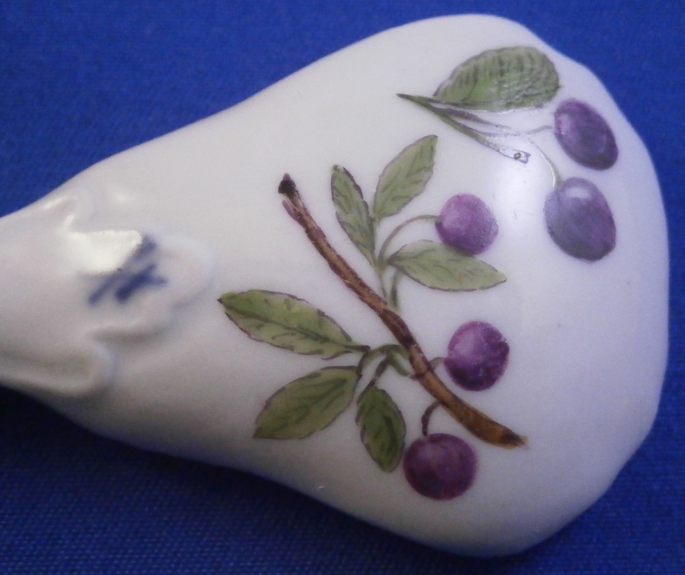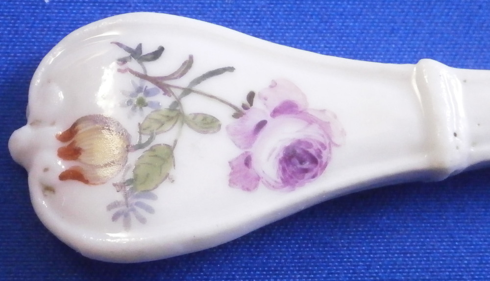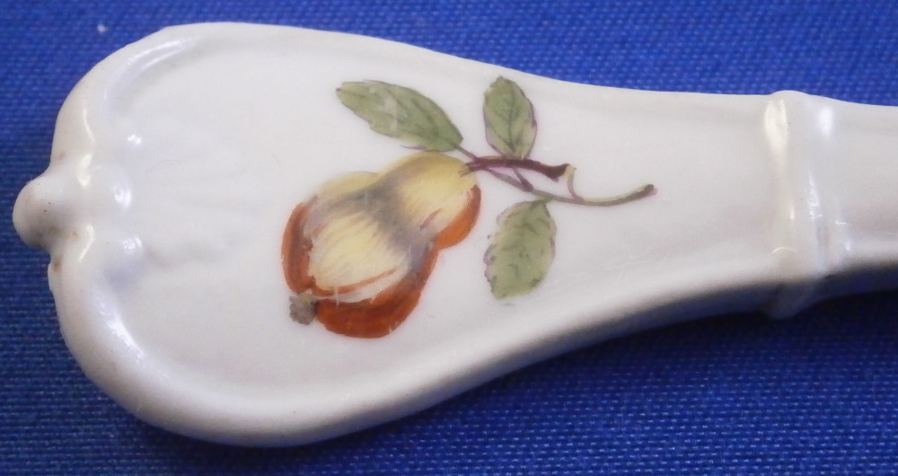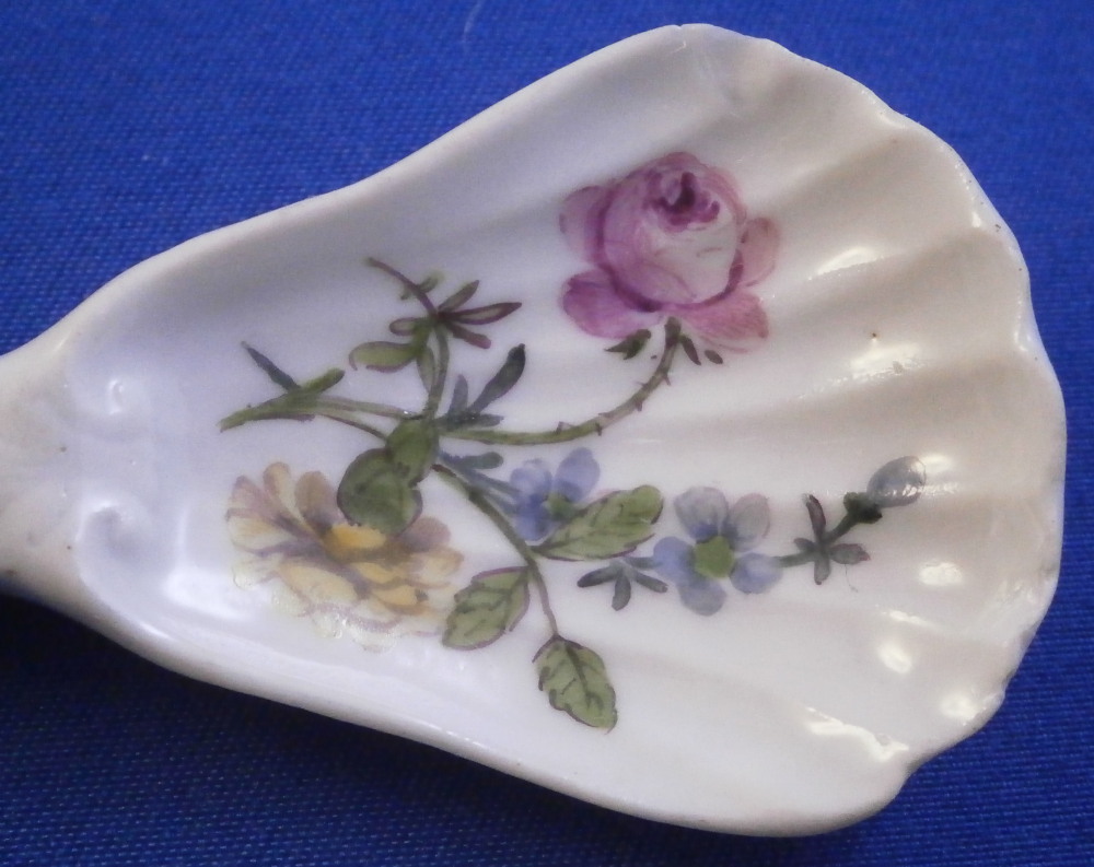 This is a rare early spoon made by Meissen in about 1750. A rare early survivor. Not entirely sure what it was for but it might ahve been a version of the butter spoon with the ribbed shell design to the front. I could not find another example like it. Either way it is a superb piece with the shell design as the bowl part and a nice handle. It has lots of hand painted flowers / fruit to it. There is a floral arrangement to the top of the bowl and plums / cherries to the bottom. The thin part of the handle has a little flower to both the top and bottom side and the thicker end has a pear design to the top and a small floral arrangement to the bottom. Some nice molded details to the porcelain as wel. It's a great looking spoon! A top notch example and amazing that it survived all these years. The piece is in good condition with a small chip to the left corner of the bowl and some minor chipping to the right edge of the front of the bowl but it displays superbly! The piece is actually marked which is not that common. Most are unmarked so it is really nice to find a marked example. It has the under glaze blue crossed swords to the bottom wher the bowl and the handle meet. The spoon is 5.625 inches long. The bowl is 1.5 inches long, 1.375 inches wide and 0.375 inches deep. Please email me for more information or other pictures.