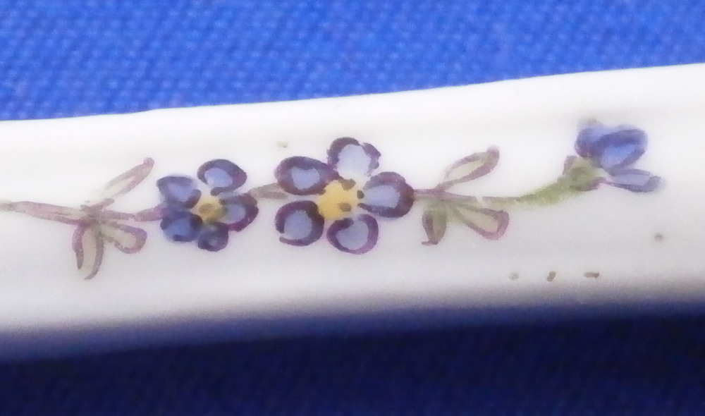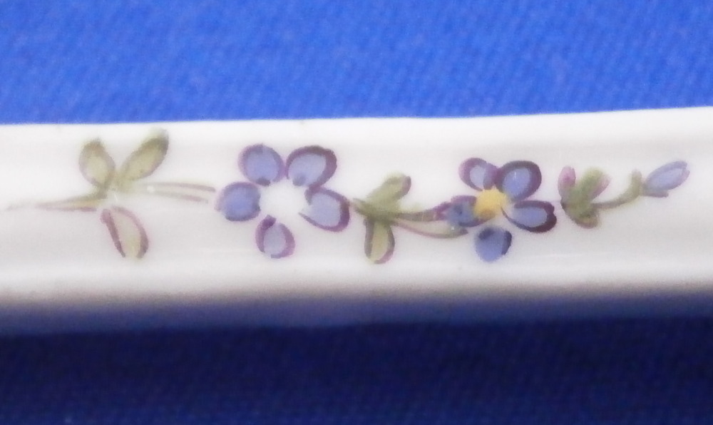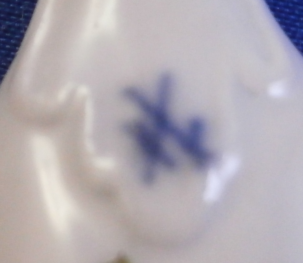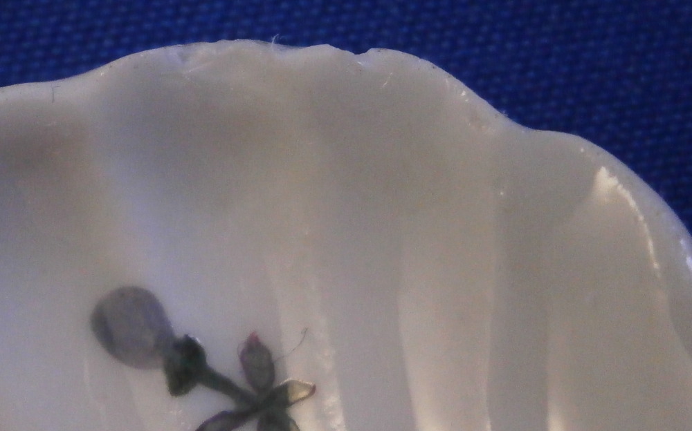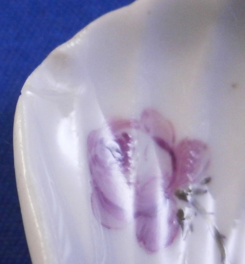 This is a rare early spoon made by Meissen in about 1750. A rare early survivor. Not entirely sure what it was for but it might ahve been a version of the butter spoon with the ribbed shell design to the front. I could not find another example like it. Either way it is a superb piece with the shell design as the bowl part and a nice handle. It has lots of hand painted flowers / fruit to it. There is a floral arrangement to the top of the bowl and plums / cherries to the bottom. The thin part of the handle has a little flower to both the top and bottom side and the thicker end has a pear design to the top and a small floral arrangement to the bottom. Some nice molded details to the porcelain as wel. It's a great looking spoon! A top notch example and amazing that it survived all these years. The piece is in good condition with a small chip to the left corner of the bowl and some minor chipping to the right edge of the front of the bowl but it displays superbly! The piece is actually marked which is not that common. Most are unmarked so it is really nice to find a marked example. It has the under glaze blue crossed swords to the bottom wher the bowl and the handle meet. The spoon is 5.625 inches long. The bowl is 1.5 inches long, 1.375 inches wide and 0.375 inches deep. Please email me for more information or other pictures.