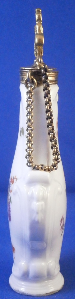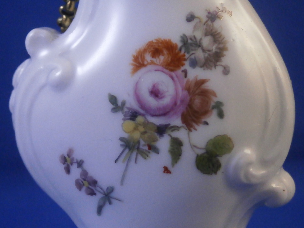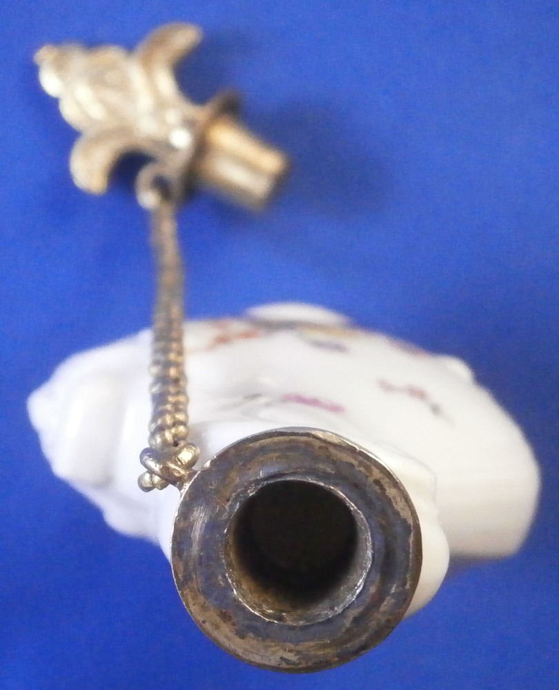 This is a superb perfume / scent bottle made by Meissen in the mid 18th century. It has a nice shape to it with some scrolls in relief and is smaller than most I have seen of this model. The piece is hand painted very nicely with two floral arrangements as well as some single flowers scattered about. It still has its original stopper attached with a chain which is a treat. Not sure what metal this is made of but looks to be gold washed silver. The piece is not marked underneath but the unglazed bottom and the style and color of the flowers makes this easy to identify as Meissen from about 1750. The perfume bottle is 3.75 inches tall to the tip of the stopper, 1.625 inches wide and 0.75 inches deep. The piece is in great condition with some roughness to the bottom edge but it was made that way. Two shallow tiny chips to mostly the underside probably also from when it was made. Some minor wear to the gold wash but it displays perfectly. Please email me for more information or other pictures.