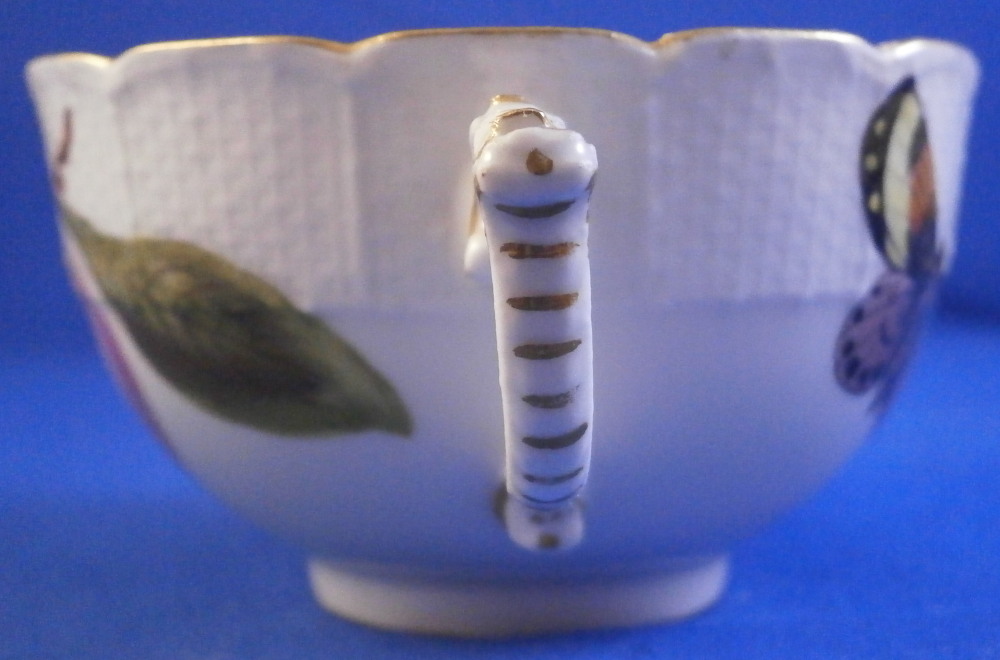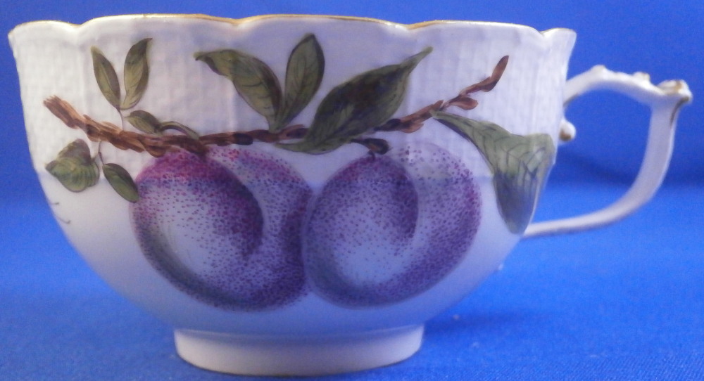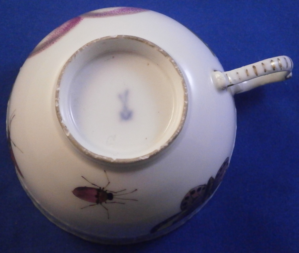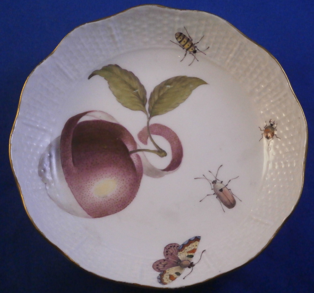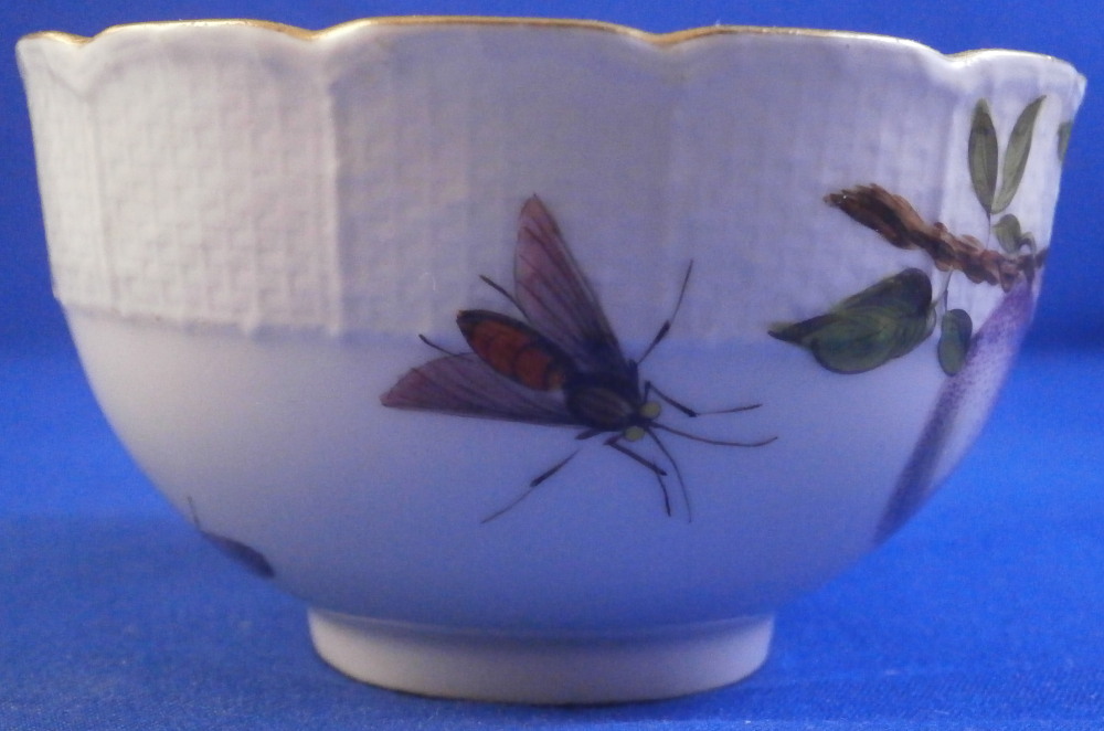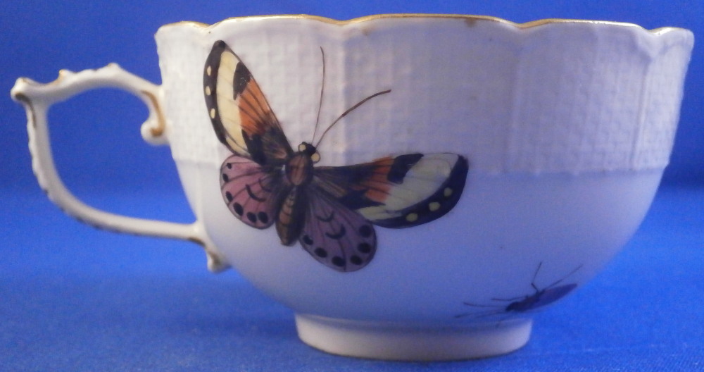 This is a superb early cup and saucer set made by Meissen in about 1745. Both pieces are hand painted with some superb fruit as well as bugs and a large butterfly on each. The saucer has I think an apple that has been partially peeled with the peel hanging on with its stem and two leaves, three smaller bugs and that beautiful butterfly to it while the cup has what look to be two peaches on their branch with some leaves on it as well as two bugs and another awesome butterfly. My favorite part is that superb mushroom pair on the bottom inside of the cup! Gold trim to the edge and a basket weave relief design to the rims. Nice handle shape on the cup with some gold highlights! A really superb set! The quality and detail is top! The cup and saucer are in superb condition with a couple of minor cratches to the leaves of the apple. They display perfecly. The cup is 1.75 inches tall and 3 inches in diameter. The saucer is 1 inch tall and 4.75 inches in diameter. Both are marked with the under glaze blue crossed swords mark underneath as well as an impressed 2 on the saucer and 52 on the cup. Please email me for more information or other pictures.