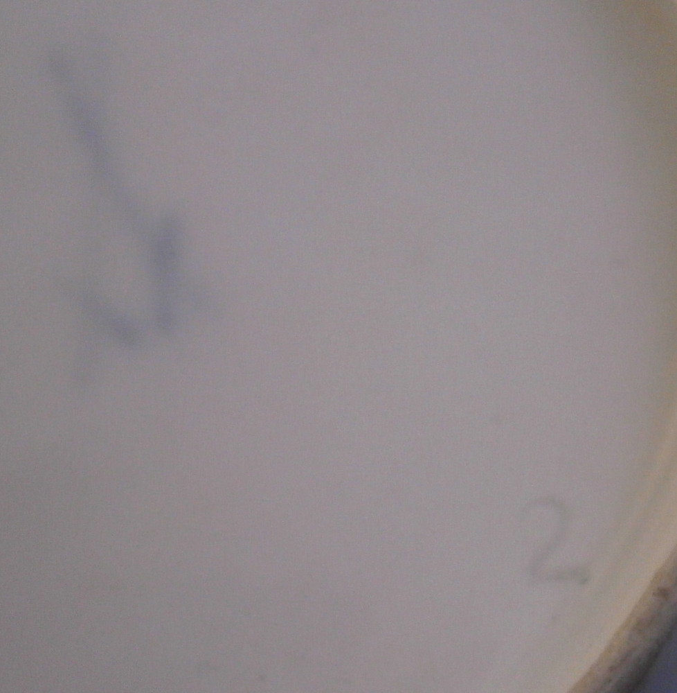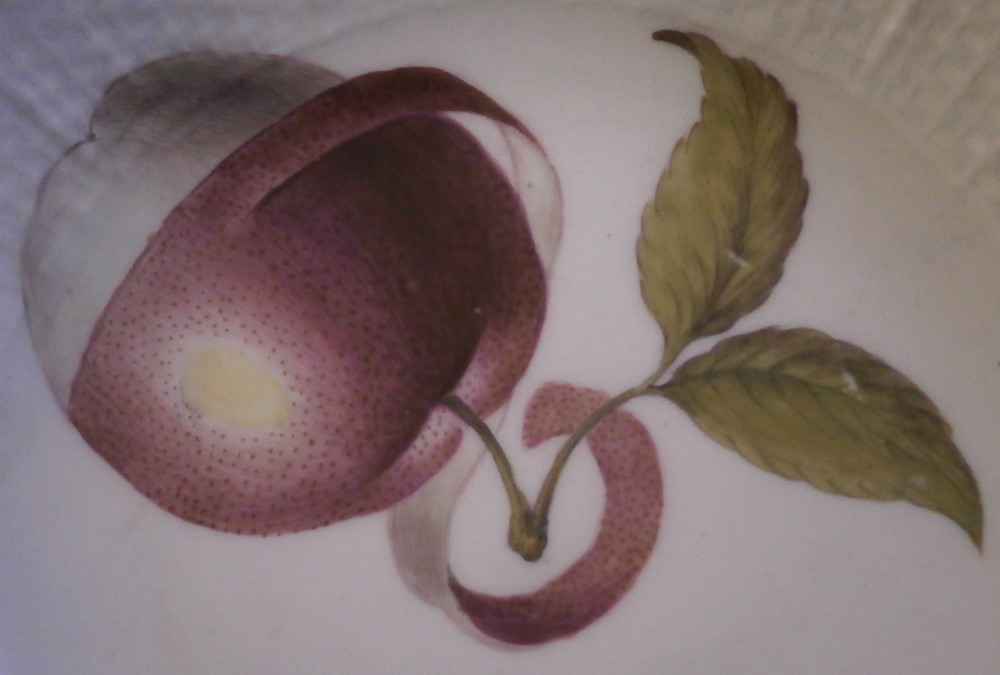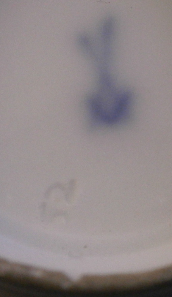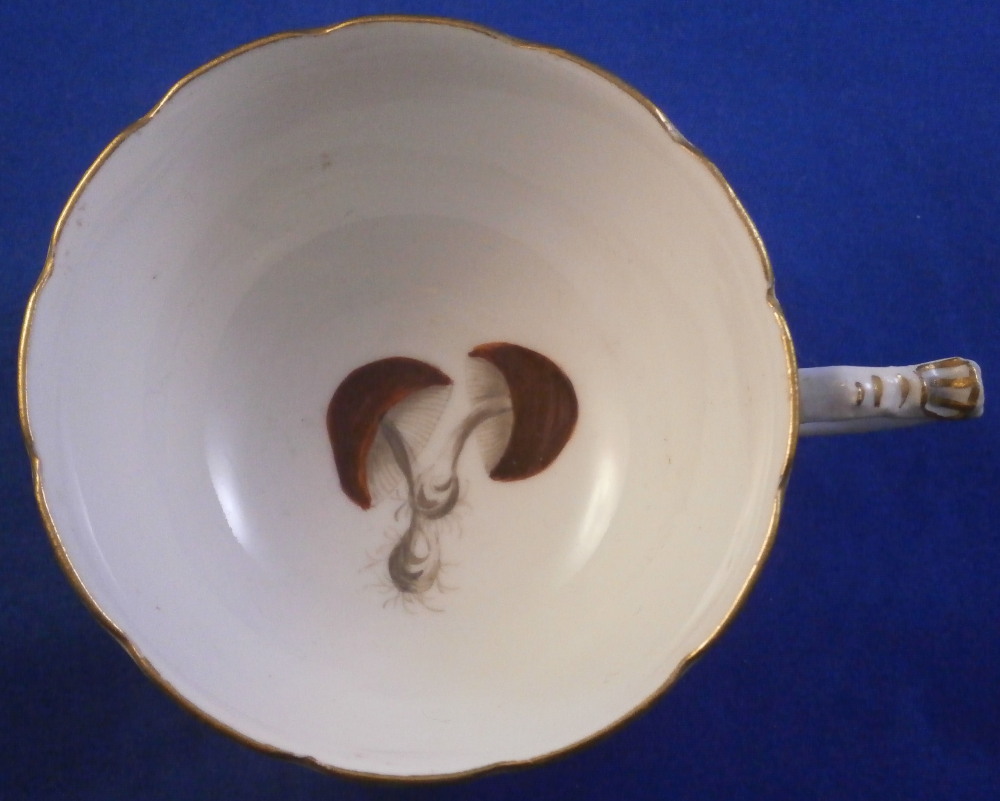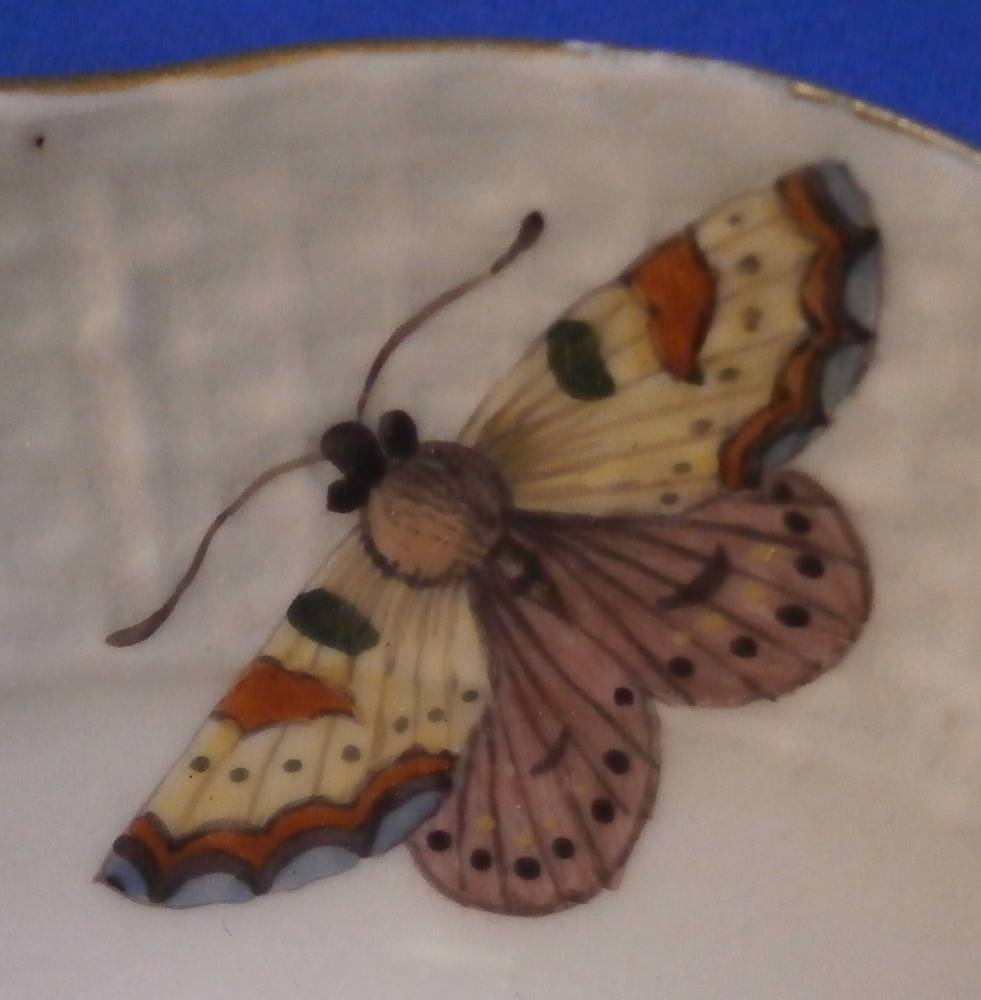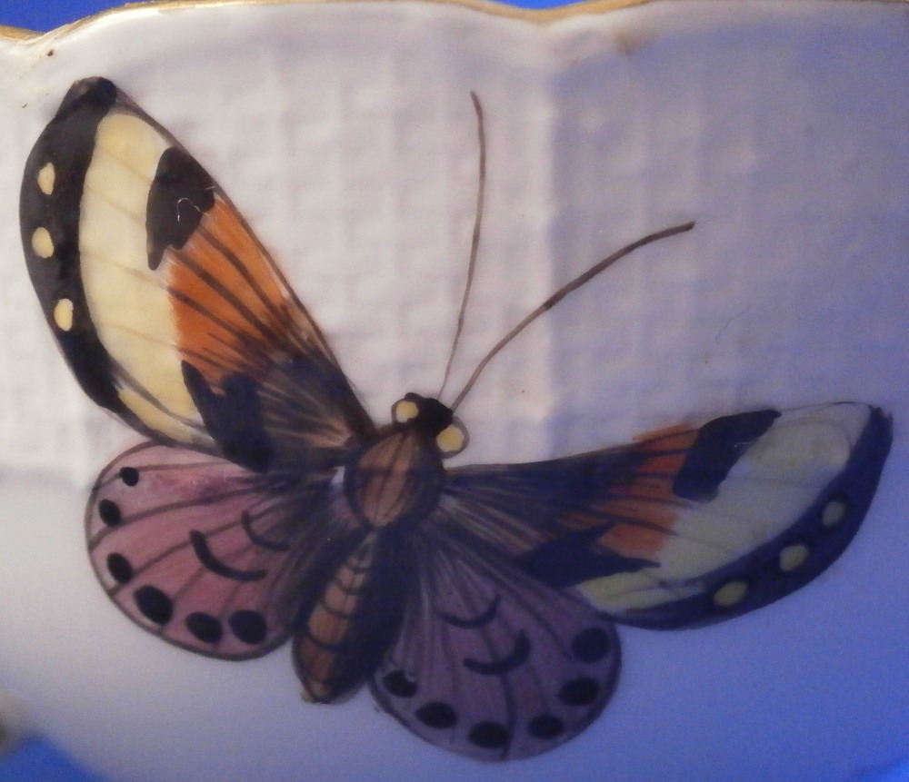 This is a superb early cup and saucer set made by Meissen in about 1745. Both pieces are hand painted with some superb fruit as well as bugs and a large butterfly on each. The saucer has I think an apple that has been partially peeled with the peel hanging on with its stem and two leaves, three smaller bugs and that beautiful butterfly to it while the cup has what look to be two peaches on their branch with some leaves on it as well as two bugs and another awesome butterfly. My favorite part is that superb mushroom pair on the bottom inside of the cup! Gold trim to the edge and a basket weave relief design to the rims. Nice handle shape on the cup with some gold highlights! A really superb set! The quality and detail is top! The cup and saucer are in superb condition with a couple of minor cratches to the leaves of the apple. They display perfecly. The cup is 1.75 inches tall and 3 inches in diameter. The saucer is 1 inch tall and 4.75 inches in diameter. Both are marked with the under glaze blue crossed swords mark underneath as well as an impressed 2 on the saucer and 52 on the cup. Please email me for more information or other pictures.