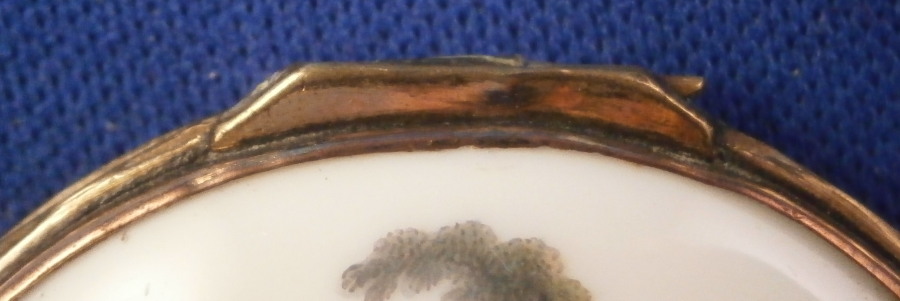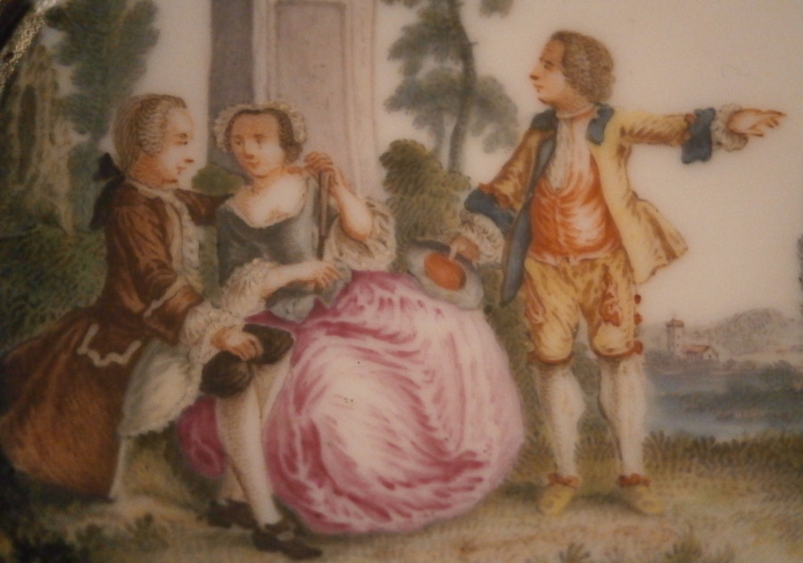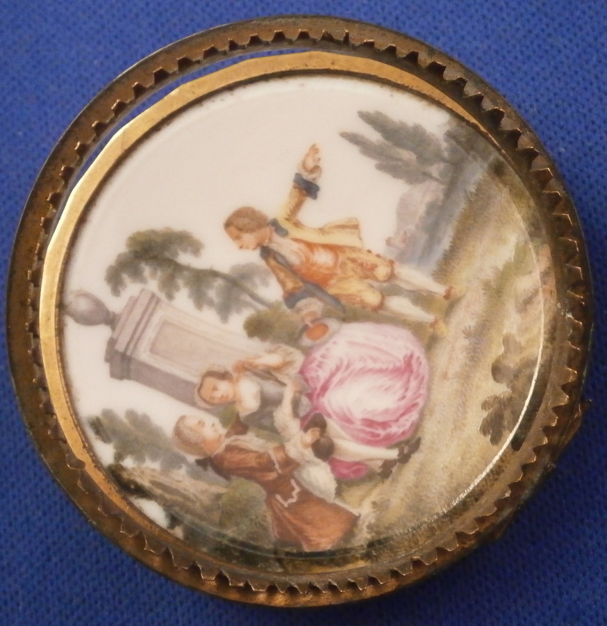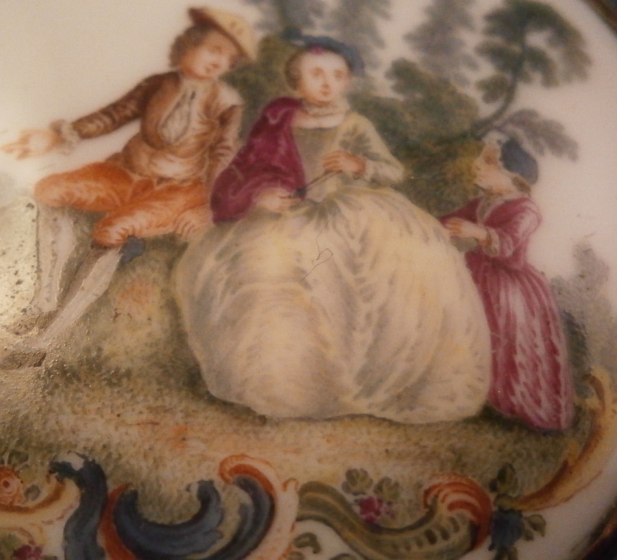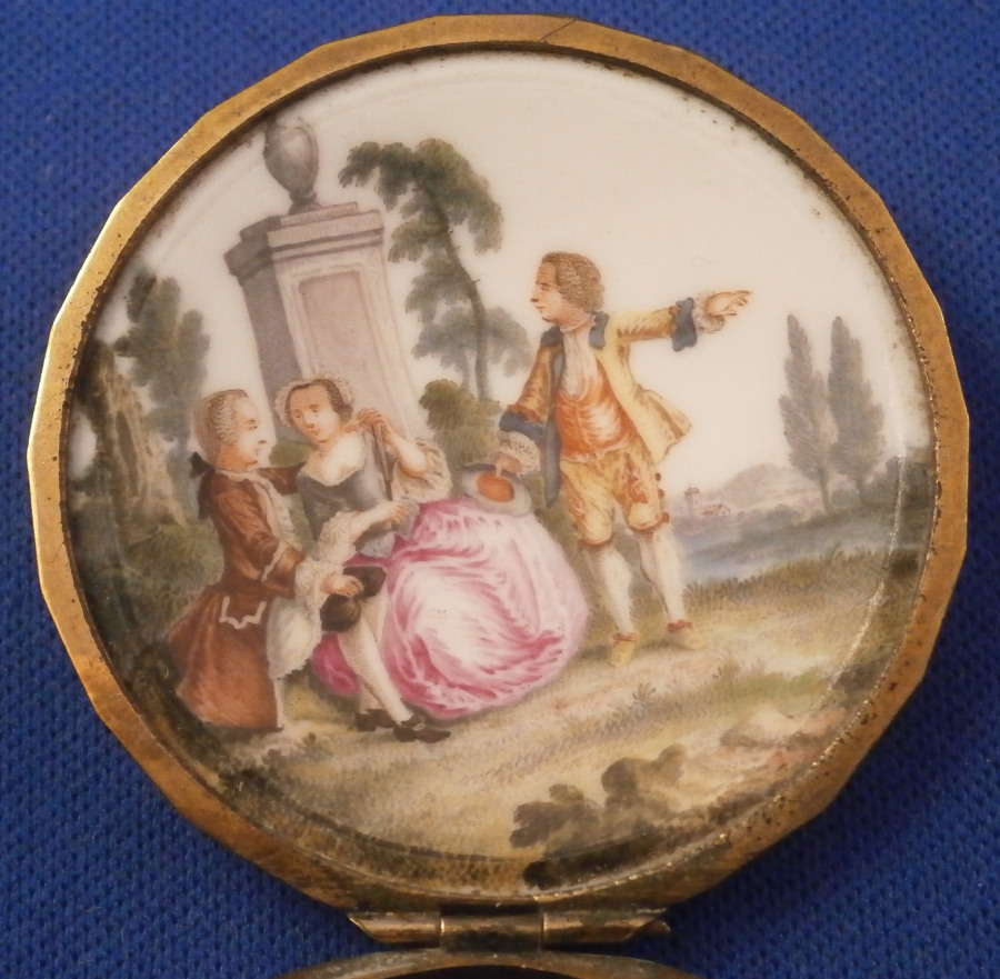 This is a superb lid for a small snuff / patch /pill box made by Meissen around 1750. The round porcelain piece is hand painted with a superb scene to the top inclduing a couple and a young child in a landscape surrounding with some colorful scrolls and flowers underneath the scene. The underside of the lid has another scene including three adults in a landscape surrounding with a column behind them and a building in the distance. Really top quaility piece! The mounts are gold color but I think the lid part was just gold washed though I am not sure. Obviously the box part is missing but any decent jeweller could make a silver or gold one for it and you'd have a really nice piece with a superb lid! The mounts are all there already which is the hard part. The porcelain is in great condition and the mounts are fine as well. A little dirty and could use a polish or cleaning. The lid is not marked which is normal. The entire lid part with the mounts on the edge is about 1.75 inches in diameter. The mounts that would go ontoa bod have a diameter of just a touch over that. Please email me for more information or other pictures.