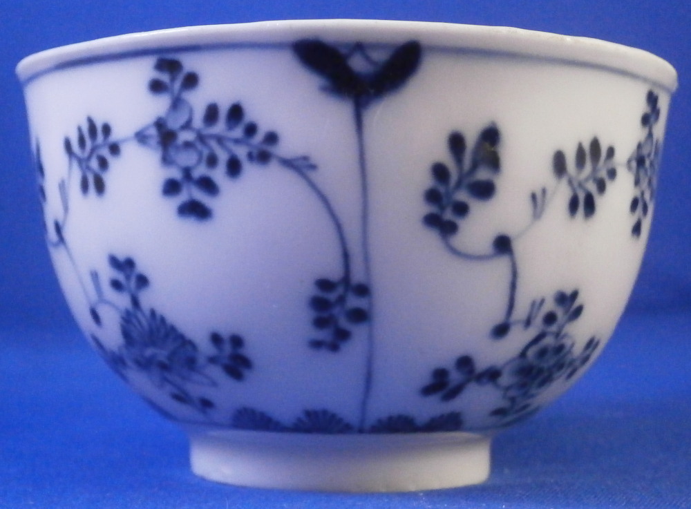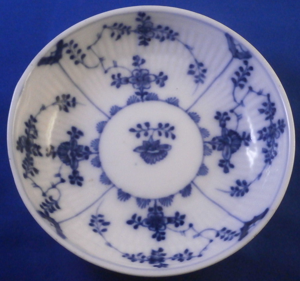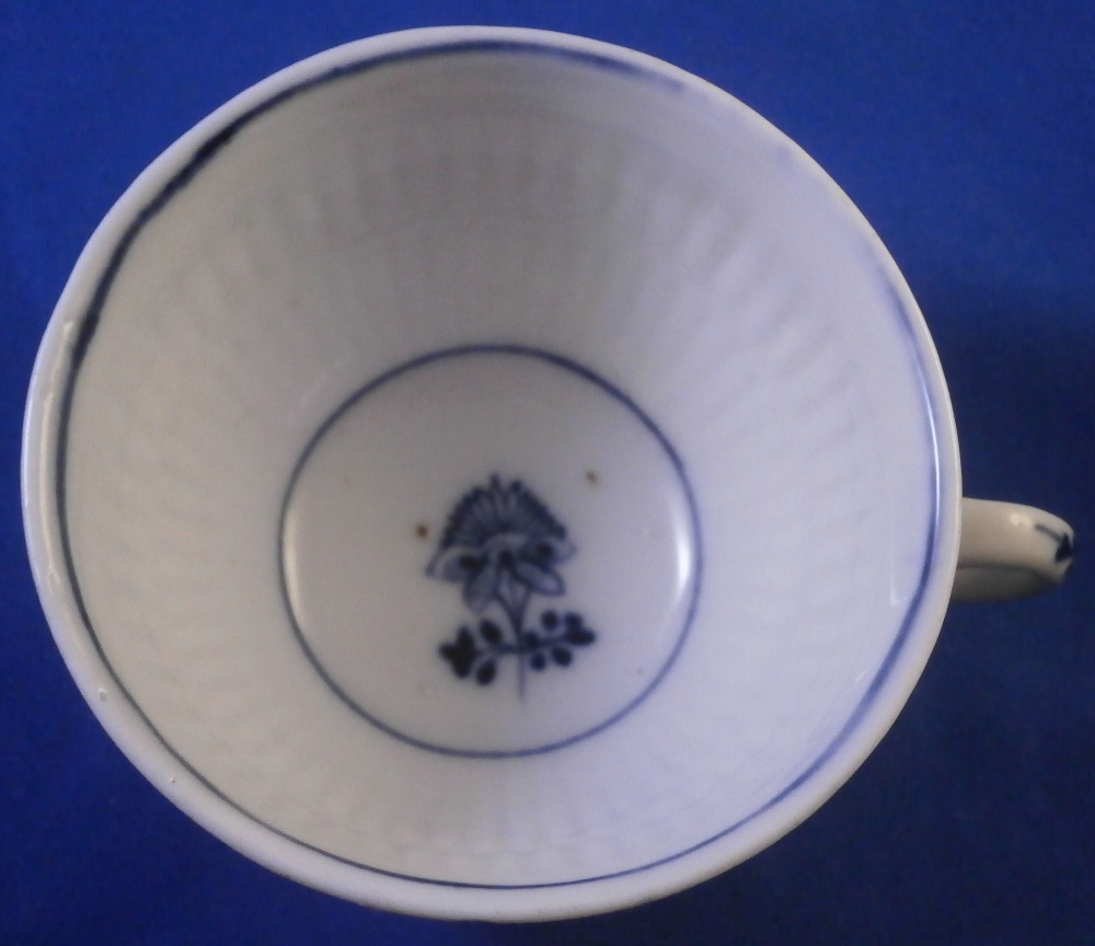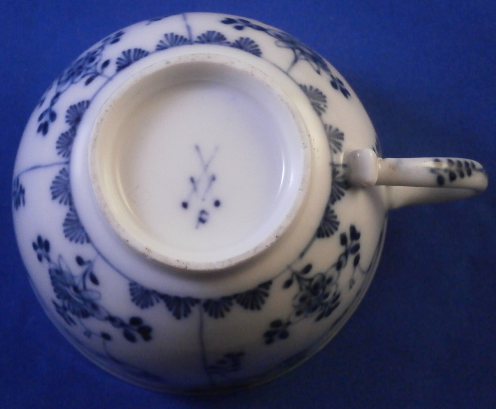 This is a nice early cup and saucer set made by Meissen around 1750. It is quite hard to find one of these early sets these days. Both pieces are hand painted with the well known strawflower design used by so many makers.The design goes all around and there is a bit of a design to the handle as well. The inside of the saucer and inside of the cup have a ribbed design to it to give it a bit of extra texture. A nice touch! The set is in great condition with the bottom terminal of the handle having a crack in it as shown. A very common issue on these early pieces and not a huge deal but... Two brown spots to the bottom inside of the cup and two very tiny fleabits to the outside edge. Impossible to spot when on display and the set displays superbly! The cup is 1.875 inches tall and just over 3 inches in diameter. The saucer is just under 1.25 inch tall and 5.125 inches in diameter. Both are marked underneath with the early under glaze blue crossed swords mark from this period as shown plus some blue painter's marks and impressed number. Please email me for more information or other pictures.