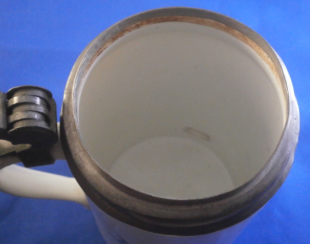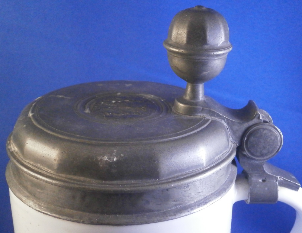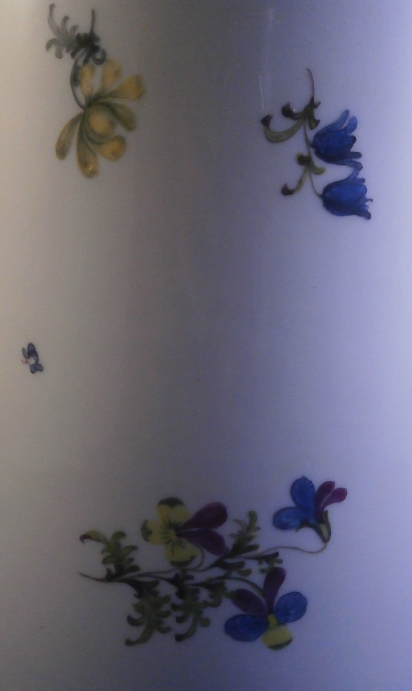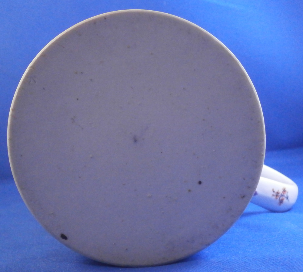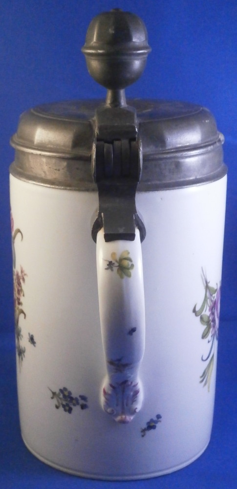 This is a nice early tankard / stein / mug / lidded cup made by Meissen in the mid 18th century. It is hand painted with a superb floral arrangement to the front in the typical early Deutsche Blumen style and colors with my favorite flower being the iris sticking out the top. There is a smaller upside down arrangement on the other side and lots of smaller single flowers and elaves filling in the rest of the space. The handle has two flowers and a leaf or blossom to it with some puce trim to the nice bottom terminal. The piece still has its original zinc mounts which is nice. There is an old coin looking design in the center though I am unsure of it is a coin or just part of the design. On silver example there was often a silver coin so this might just be some sort of imitation of that sort of feature. From underneath it does look like it is a coin or medal. The lid is even marked by a maker's mark underneath the lid though I could not find it anywhere to ID the maker of the zinc. The tankard is in superb condition no chips, wear, etc. One small paint flake to a blosson and the occasional black firing spot normal to early wares. The zink has its issues with some scratches, dents, a crack near the hinge as shown and a possible repair in that area but hey they are over 250 years old and zinc is fairly soft. Just happy it's still there! One part of the hinge is missing a small piece as well. The underside of the porcelain is faintly marked with the blue crossed swords. A bit hard to see but they are there as is an impressed numer 6 or 9 as shown. The entire piece is 8.25 inches tall and 4 inches in diameter. The coin looking piece is of Jesus on the cross and says Als Die Sterbenden (as the dying) and underneath it states Gedult (patience). The underside has Und siehe wir Leben (and see that we are living) as well as ueberwindet (overcomes) on it. Plus 2 Cor. (for Corintians) 6 and 9 I believe. I found a silver medal (which this is not) with the same scenes to it - one being of Jesus' crucifixion and one of his resurrection. A neat piece for sure! Please email me for more information or other pictures.