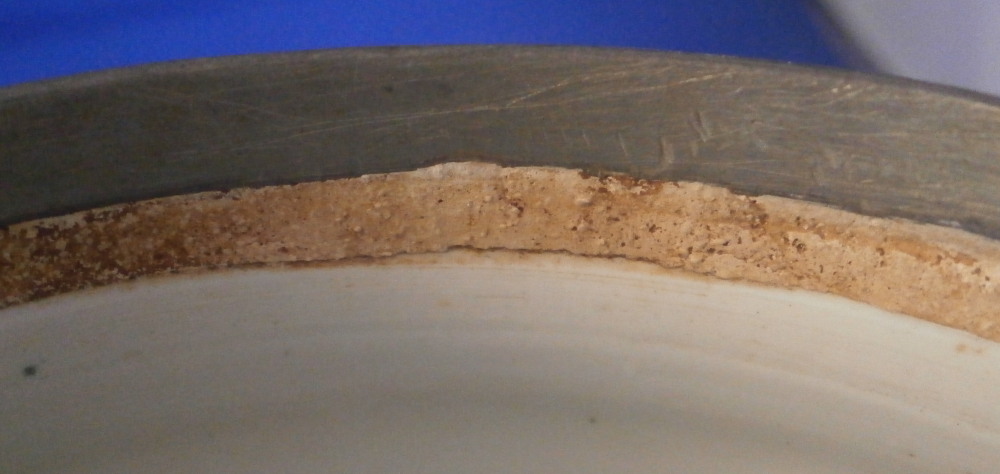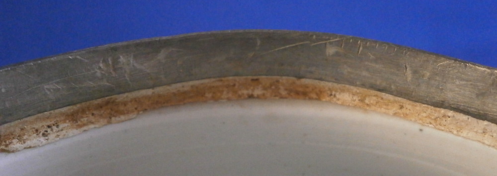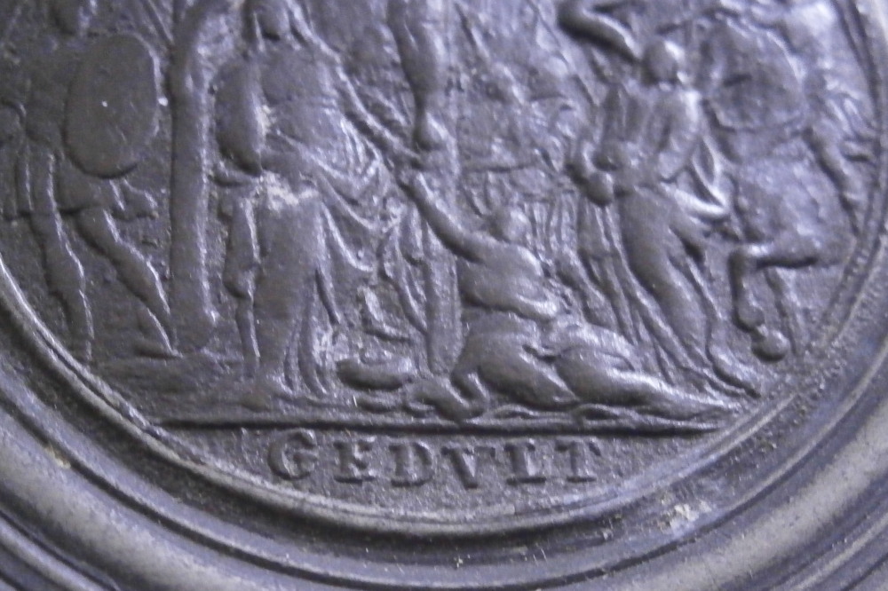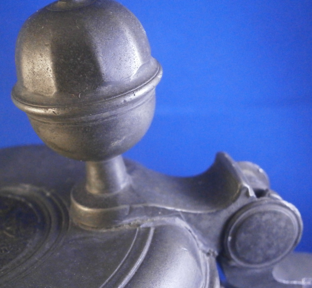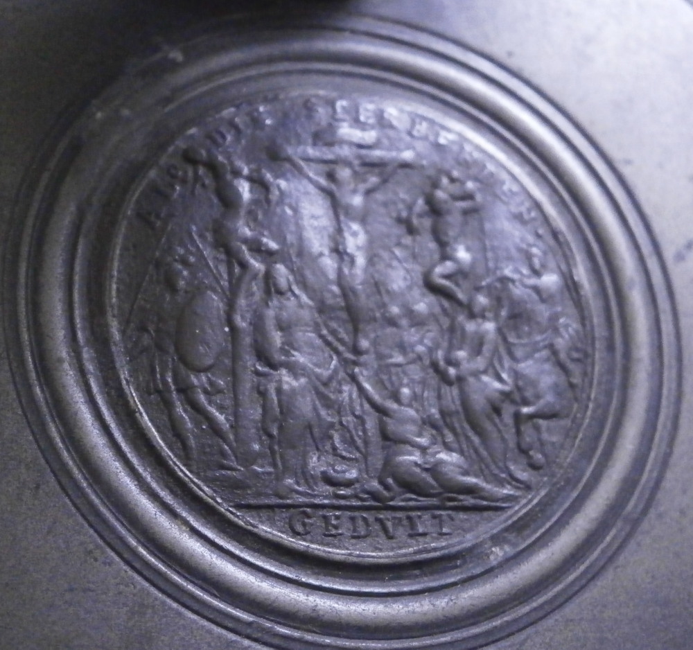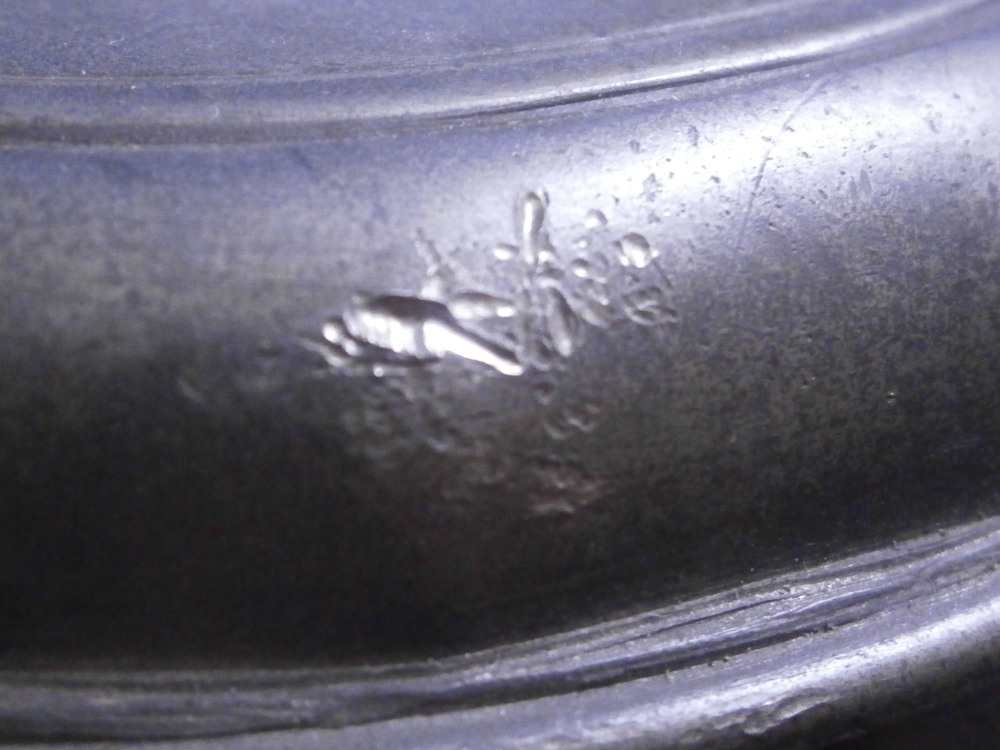 This is a nice early tankard / stein / mug / lidded cup made by Meissen in the mid 18th century. It is hand painted with a superb floral arrangement to the front in the typical early Deutsche Blumen style and colors with my favorite flower being the iris sticking out the top. There is a smaller upside down arrangement on the other side and lots of smaller single flowers and elaves filling in the rest of the space. The handle has two flowers and a leaf or blossom to it with some puce trim to the nice bottom terminal. The piece still has its original zinc mounts which is nice. There is an old coin looking design in the center though I am unsure of it is a coin or just part of the design. On silver example there was often a silver coin so this might just be some sort of imitation of that sort of feature. From underneath it does look like it is a coin or medal. The lid is even marked by a maker's mark underneath the lid though I could not find it anywhere to ID the maker of the zinc. The tankard is in superb condition no chips, wear, etc. One small paint flake to a blosson and the occasional black firing spot normal to early wares. The zink has its issues with some scratches, dents, a crack near the hinge as shown and a possible repair in that area but hey they are over 250 years old and zinc is fairly soft. Just happy it's still there! One part of the hinge is missing a small piece as well. The underside of the porcelain is faintly marked with the blue crossed swords. A bit hard to see but they are there as is an impressed numer 6 or 9 as shown. The entire piece is 8.25 inches tall and 4 inches in diameter. The coin looking piece is of Jesus on the cross and says Als Die Sterbenden (as the dying) and underneath it states Gedult (patience). The underside has Und siehe wir Leben (and see that we are living) as well as ueberwindet (overcomes) on it. Plus 2 Cor. (for Corintians) 6 and 9 I believe. I found a silver medal (which this is not) with the same scenes to it - one being of Jesus' crucifixion and one of his resurrection. A neat piece for sure! Please email me for more information or other pictures.