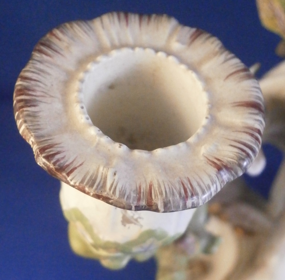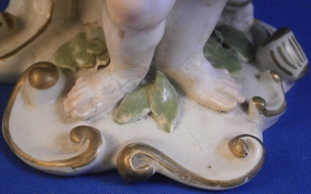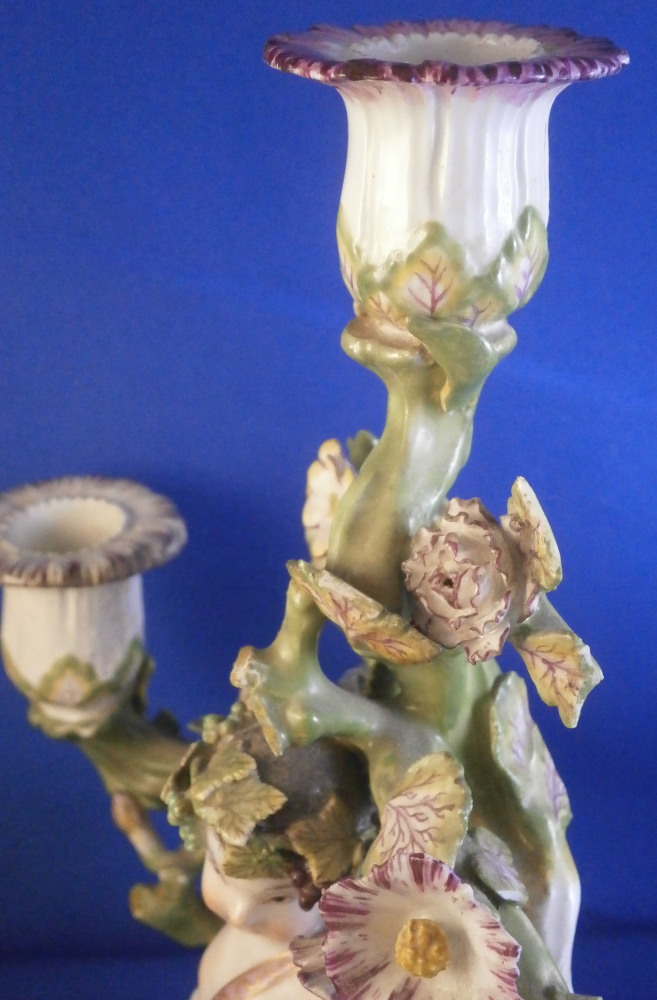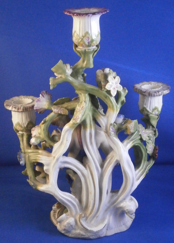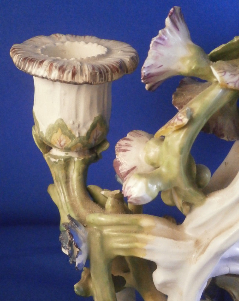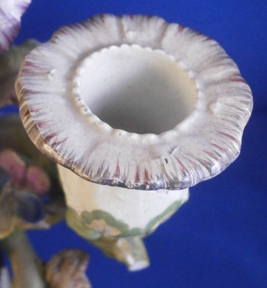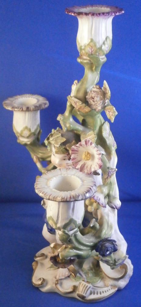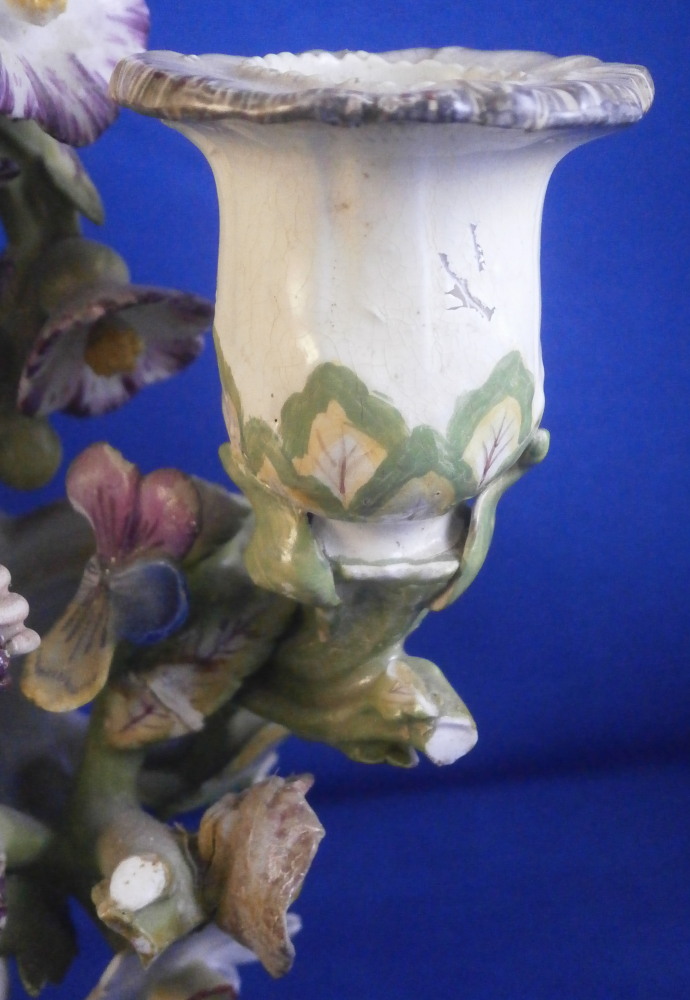 This is a neat triple figural candleholder made by Meissen in about 1750. Before you get too excited - it has been heavily restored. Still worth saving and maybe even having restored a bit better. The piece has a central figurine of a putto holding a bunch of grapes in his left hand and what probably was a knife in the other though the blade is missing. His right arm was broken off and restored and h was broken off the base as well and restored. The candle holder part is made up of a couple of intertwined branches that end in two lower candle holders and one up high. Lots of flowers and some leaves to the branches. The top candle holder cup is in good shape but looks to have been broken off the branch though I am not sure. The other two candle holder cups are but heavily restored / possibly replaced with replicas. The branches in the back are oddly enough in great shape though one has a hairline to one spot. There is dmage to the laves and some minor damage to the flowers though most are in top shape. The base has been heavily over painted and I have no idea what was done to it. The underside looks fine except for a large firing crack and clear coated over but does not appear to have replaced pieces. One flowers looks to be a replacement as well. The scrolls on top are probably additions. Not sure. All in all it sounds much worse than it looks and it is a rare survivor for being 275 years old. The candlestick is 8.875 inches tall, 6.875 inches wide and 3.5 inches deep. The piece is unmarked or at least not visibly marked after the restoration but ceertainly Meissen from the mid 18th century. Please email me for more information or other pictures.