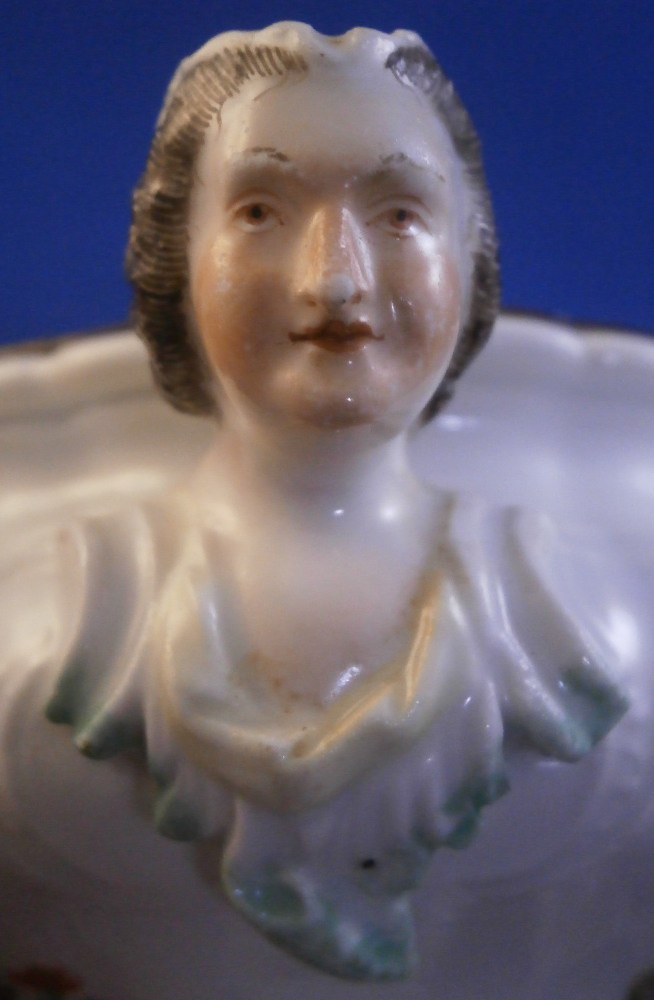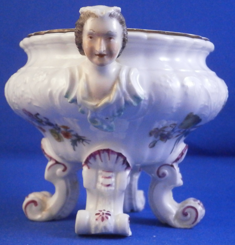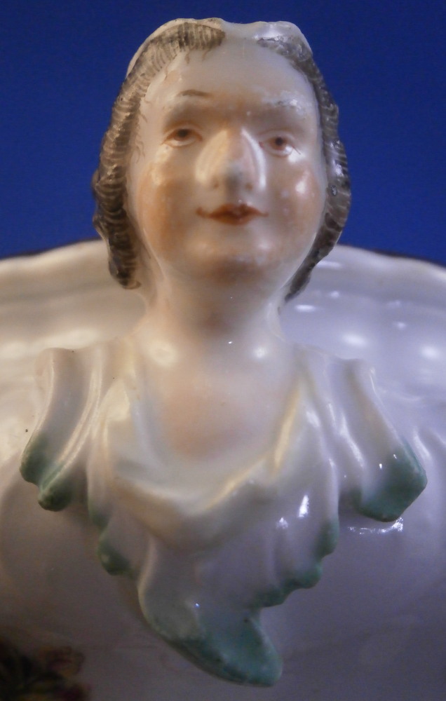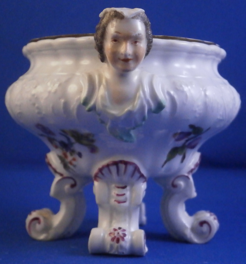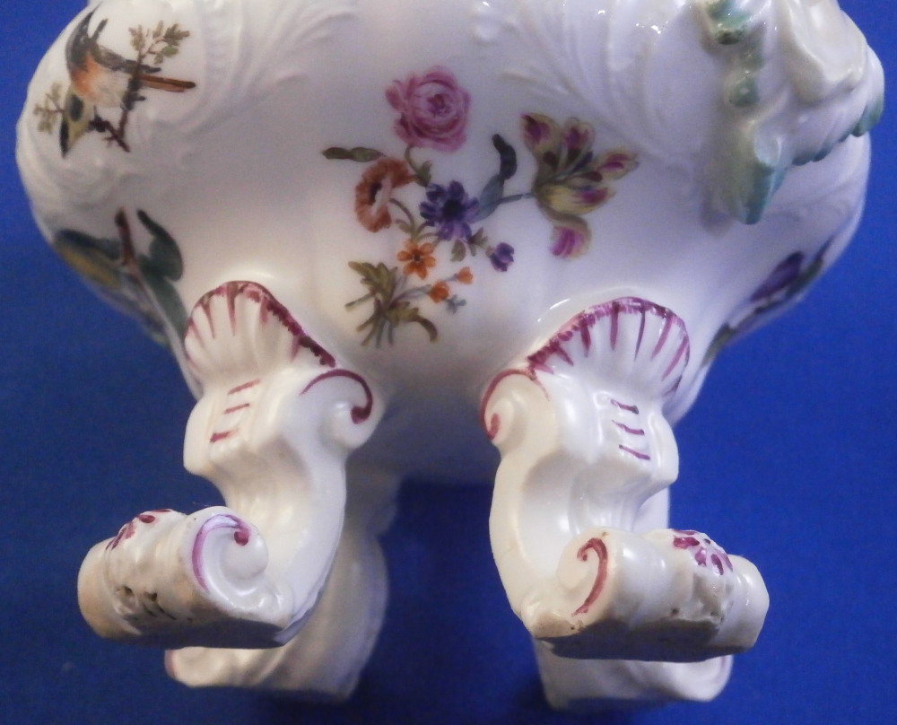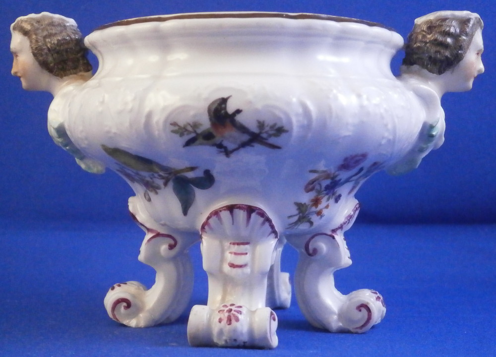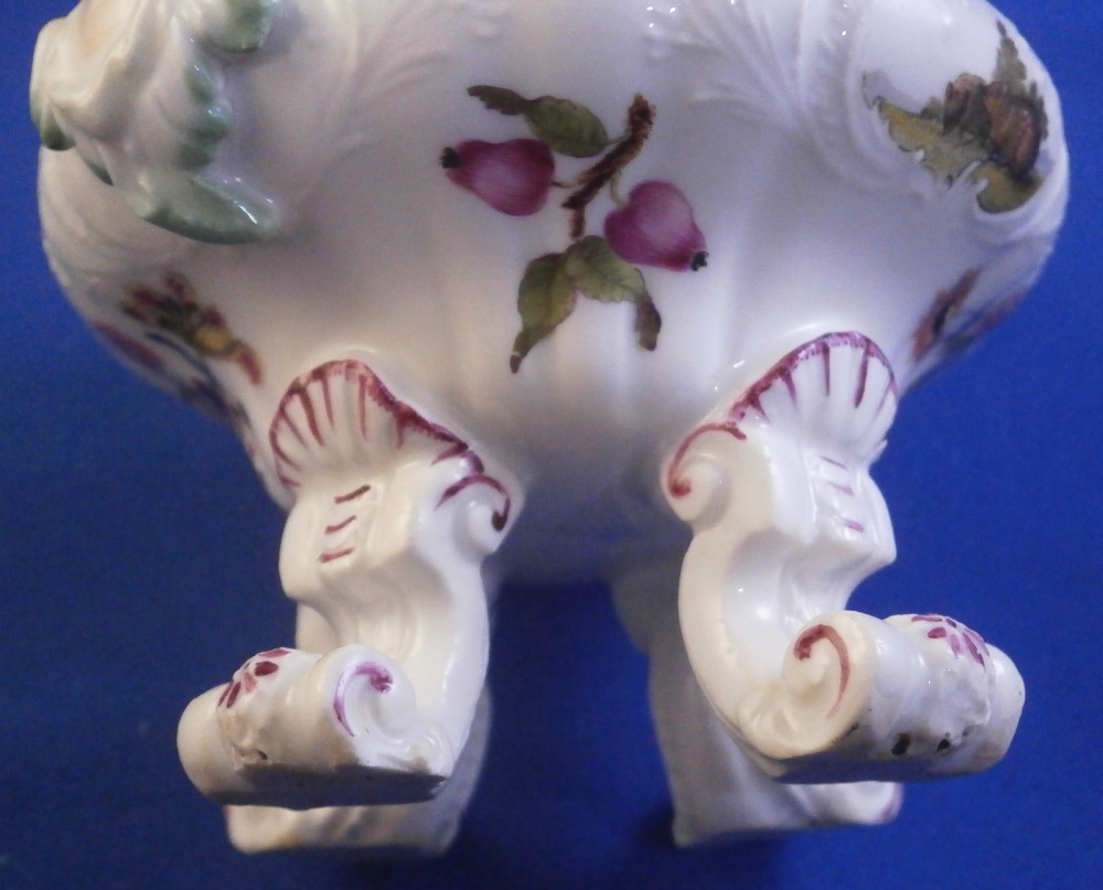 This is a really super and early open salt dish / trencher made by Meissen in about 1740. The nicest I ahve seen in a long time! It is round in shape with a handle in the form of lady bust on either side and is decorated with a relief design as well as a bird scene, a scene including mice or some other form of rodent, a lemon branch with a fruit and its leaves and blossoms, another fruit scene I cannot make out as well as two floral arrangements. The peice sits on four feet with puce trim to them. Brown trim to the top edge. This piece has it all and looks amazing! The open salt is in superb condition with some minor firing flaws common to these early peices as well as a touch of wear but it displays perfectly! The piece is marked with the under glaze blue crossed swords underneath as shown - it is fairnt but it's there. The dish is 2.625 inches tall with the heads sticking up a bit more and 3.25 inches in diameter. Please email me for more information or other pictures.