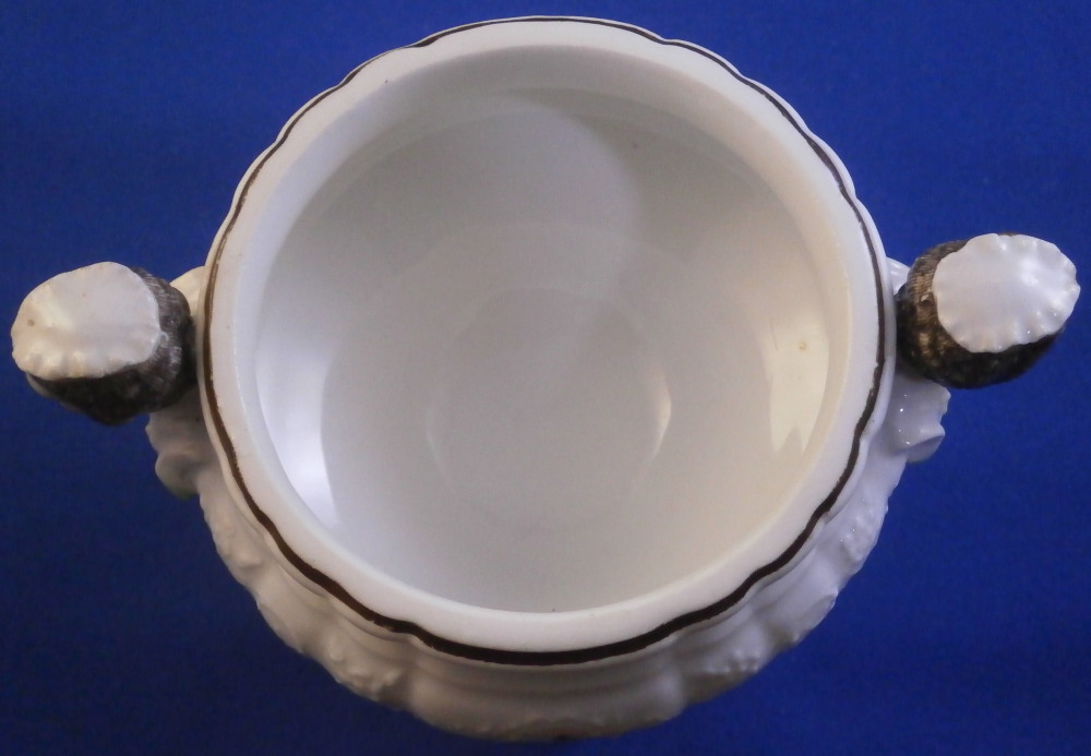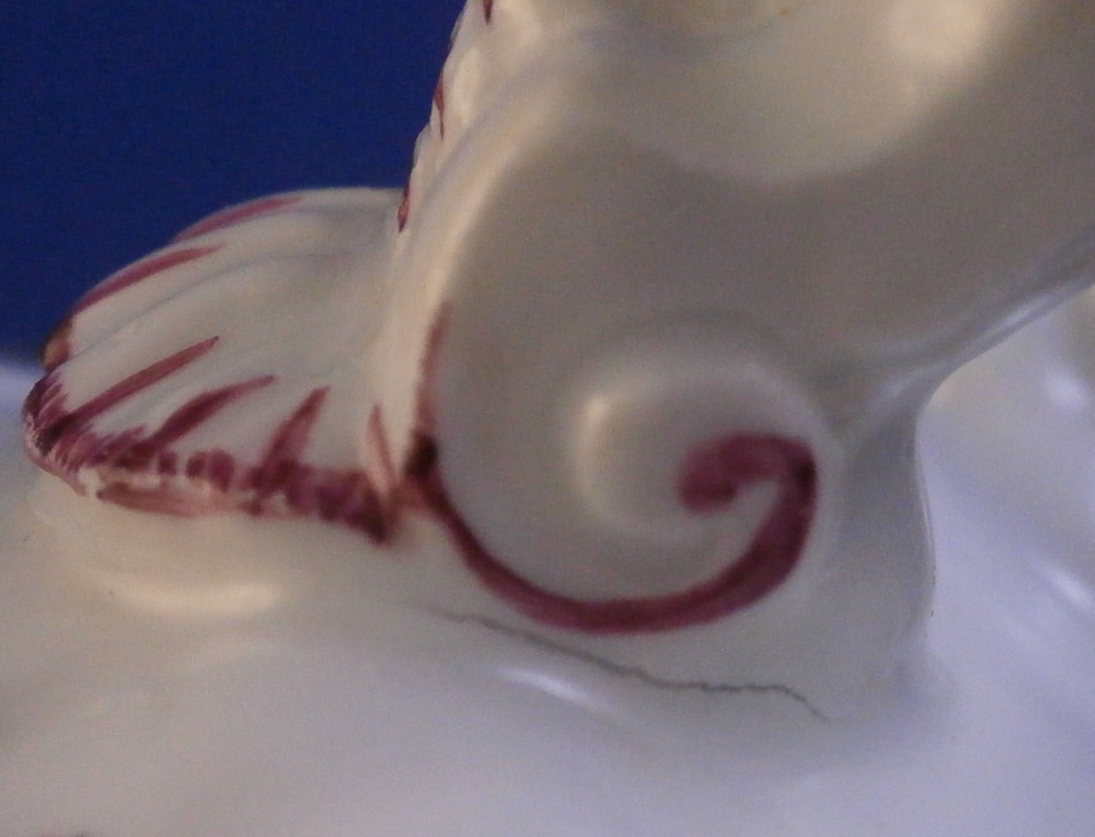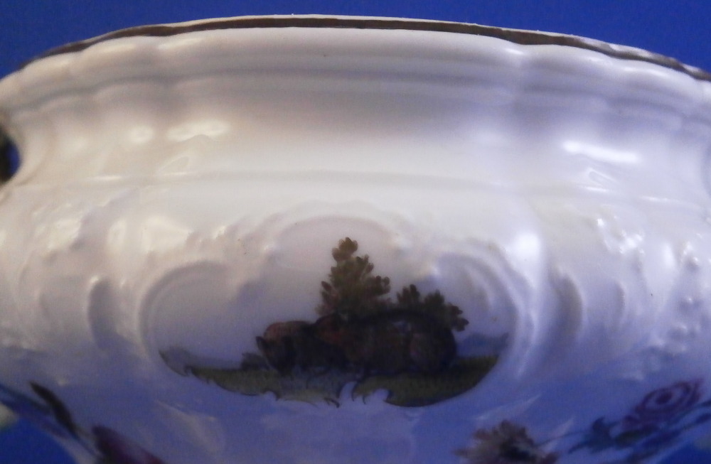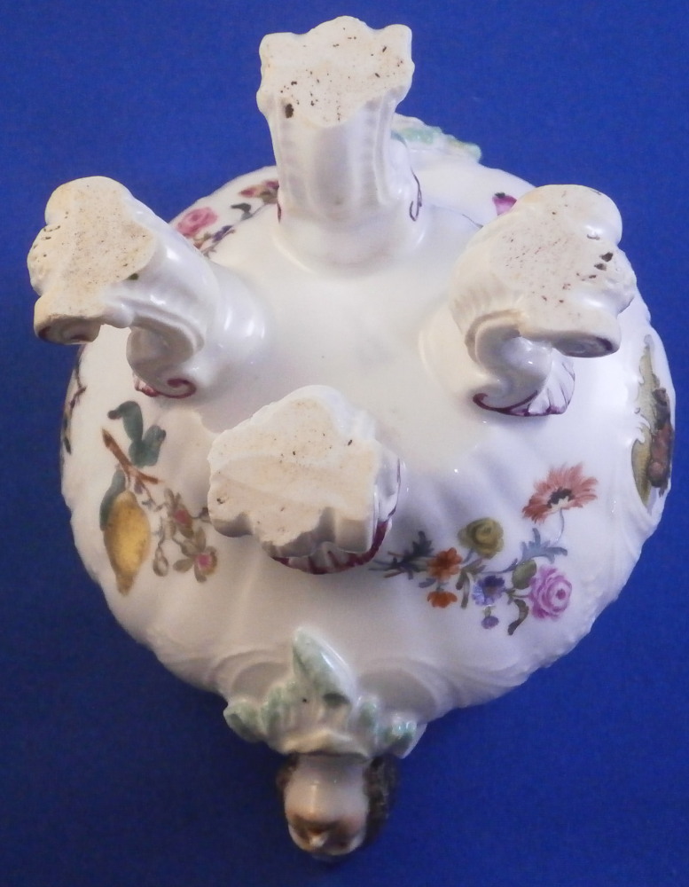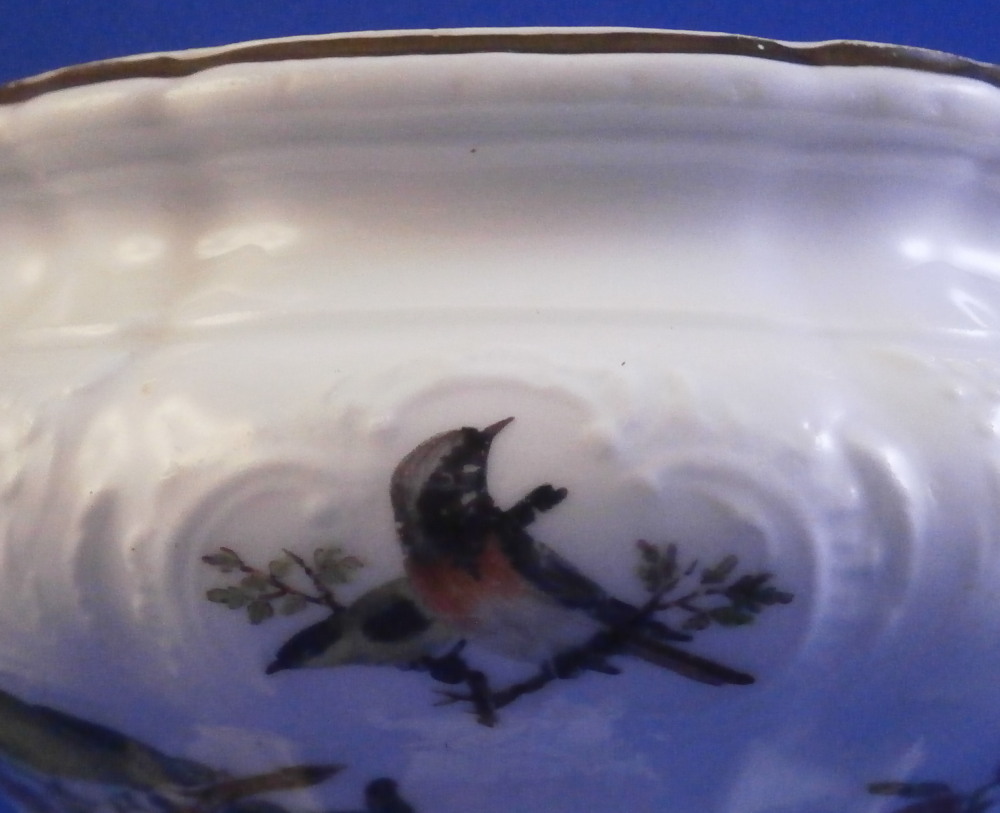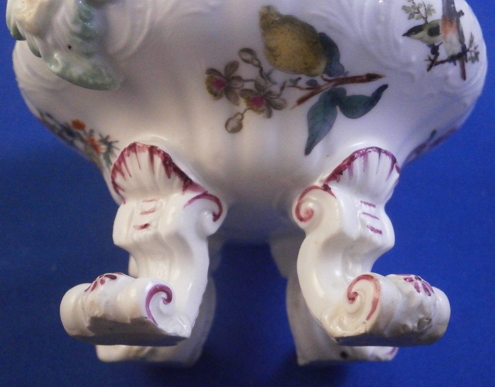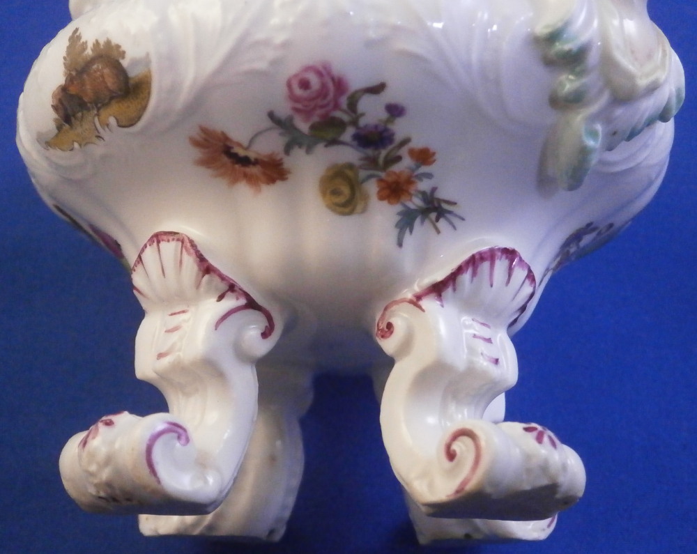 This is a really super and early open salt dish / trencher made by Meissen in about 1740. The nicest I ahve seen in a long time! It is round in shape with a handle in the form of lady bust on either side and is decorated with a relief design as well as a bird scene, a scene including mice or some other form of rodent, a lemon branch with a fruit and its leaves and blossoms, another fruit scene I cannot make out as well as two floral arrangements. The peice sits on four feet with puce trim to them. Brown trim to the top edge. This piece has it all and looks amazing! The open salt is in superb condition with some minor firing flaws common to these early peices as well as a touch of wear but it displays perfectly! The piece is marked with the under glaze blue crossed swords underneath as shown - it is fairnt but it's there. The dish is 2.625 inches tall with the heads sticking up a bit more and 3.25 inches in diameter. Please email me for more information or other pictures.
