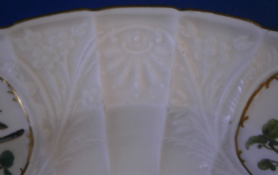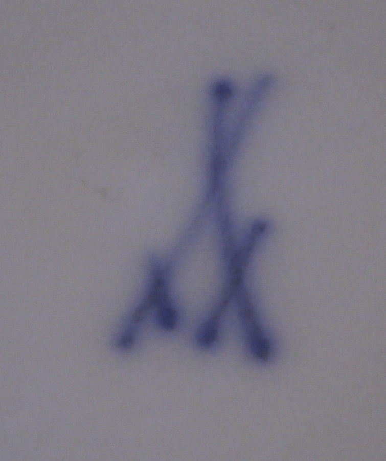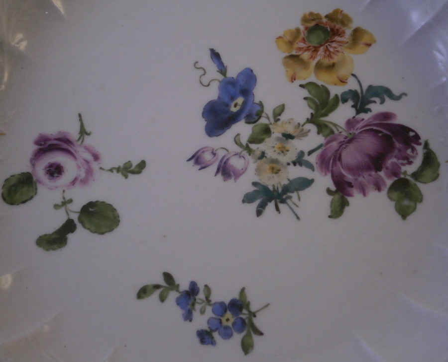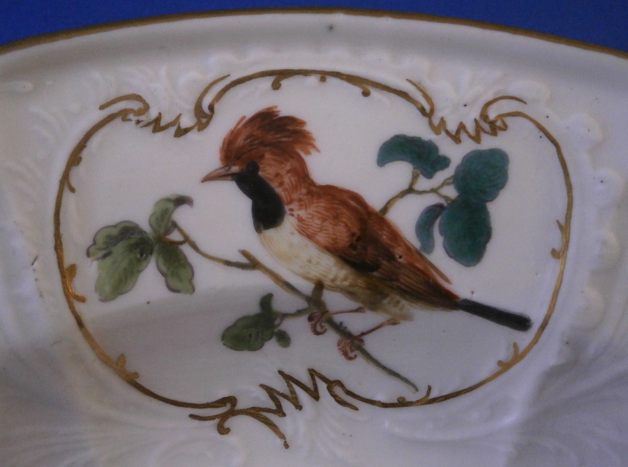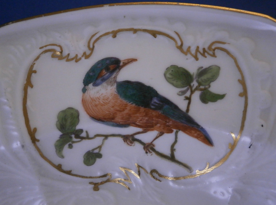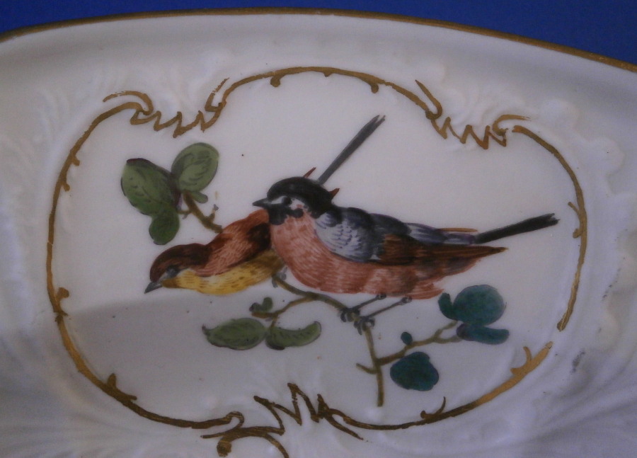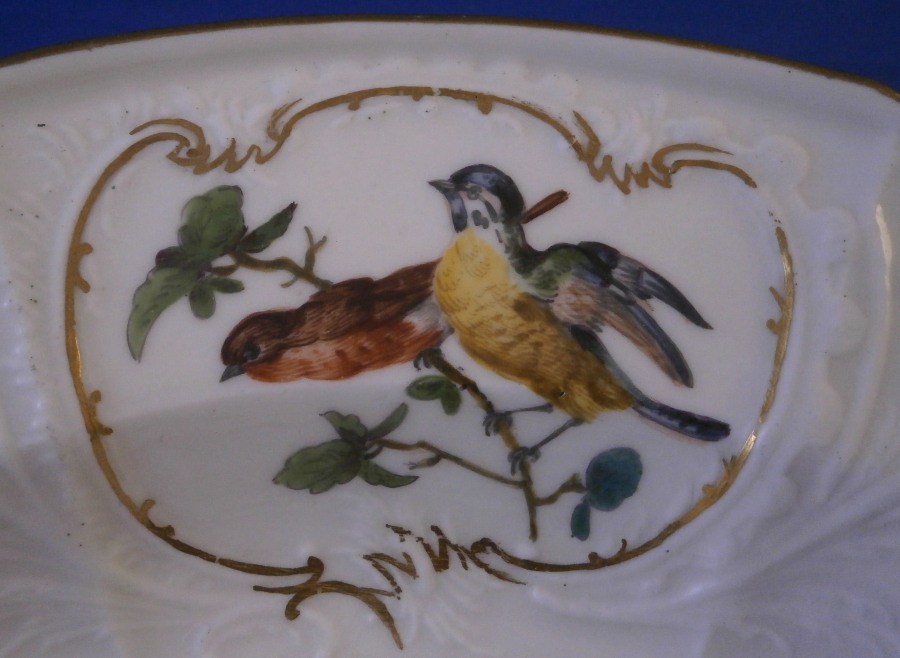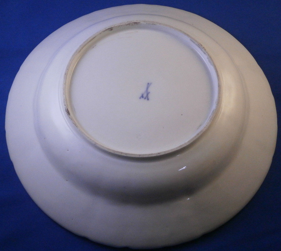 This is a nice early deep / soup plate made by Meissen in about 1750. A nicely shaped piece with a relief design called the Dulong relief around the edge of the well and the rim. There are four panels along the rim with superbly hand painted bird scenes in them. Two have a single bird sitting on a branch and two of the panels have two birds sitting on a branch. Each panel is surrounded by a gold trim. The center of the plate has a large floral arrangement on one side with two smaller single flowers filling in the rest of the space. The edge has a simple gold trim to it. A great looking plate! The plate is in superb condition with some minor wear (mostly to the large purple blossom) as shown. It displays superbly! The plate is marked with the under glaze blue crossed swords mark on the underside as well as an impressed number as shown. The piece is 2 inches tall and 9.5 inches in diameter. Please email me for more information or other pictures.