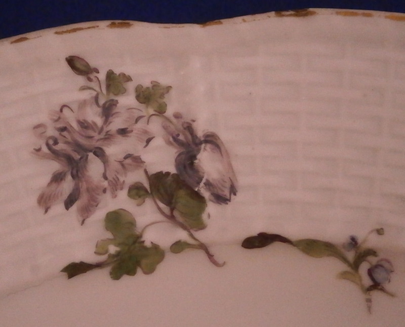 This is a great porcelain plate made by Meissen in about 1750. It is hand painted with a very good quality flower arrangement on the side of the well with some smaller single flowers scattered about the rest of the plate. The flowers are already in the Deutsche Blumen style but still show some influence of the early woodcut style so it's a nice early example! Basket weave design to the rim with a gold trim to the nicely shaped edge. The plate is in great condition with some wear as shown but no chips, etc. There is a manufacturing flaw on the back which was covered with a lily of the valley leaf and flower - the larger such cover up I have seen in my years of collecting Meissen. really quite nice. A piece of the green paint of the leaf has flaked off over time. The plate is 1.375 inches tall and 9.375 inches in diameter. Marked underneath with the underglaze blue crossed swords as well as an impressed number 140. Please email me for more information or other pictures.