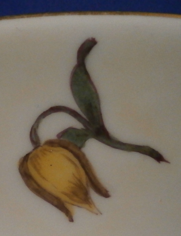 This is an early saucer set made by Meissen in about 1745. The saucer is nicely hand painted with one larger floral arrangement as well as somer smaller flowers scattered throughout with a gold trim to the rim. The flowers are still influenced by the woodcut style so definitely 1750 or earlier but not before 1740 since there is an impressed number to the underside. My favorite part is the underside of the saucer is painted with a yellow ground color which is very nice! The piece is marked with an early version of the blue crossed swords underneath as well as an impressed number. The saucer is in superb condition with with some very minor wear and one spot where the color has flaked off a leaf. The yellow ground on the udnerside has a spot by the edge that disn't take so they painted a pink flower over it to hide it - quite typical for this period! The saucer is 1.125 inches tall and 5.375 inches in diameter. Please email me for more information or other pictures.
