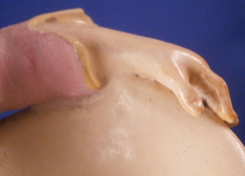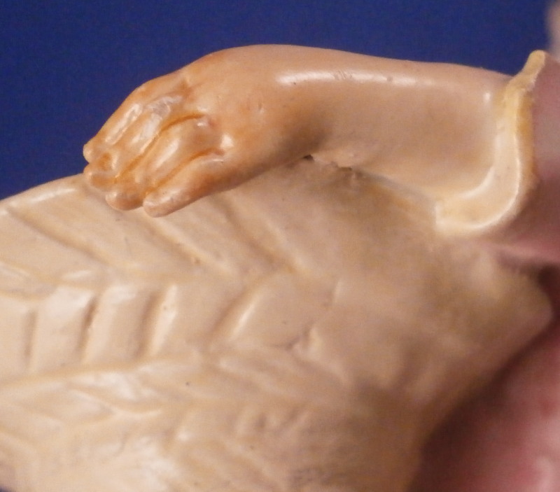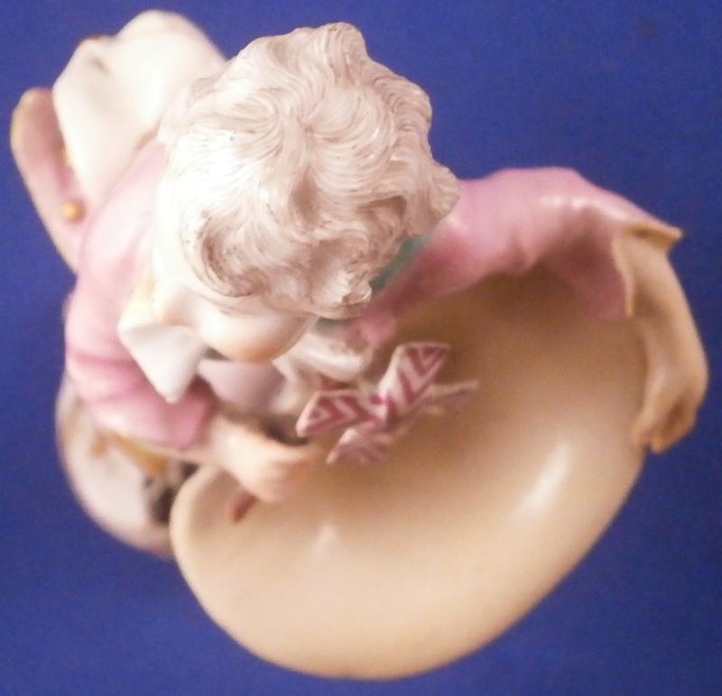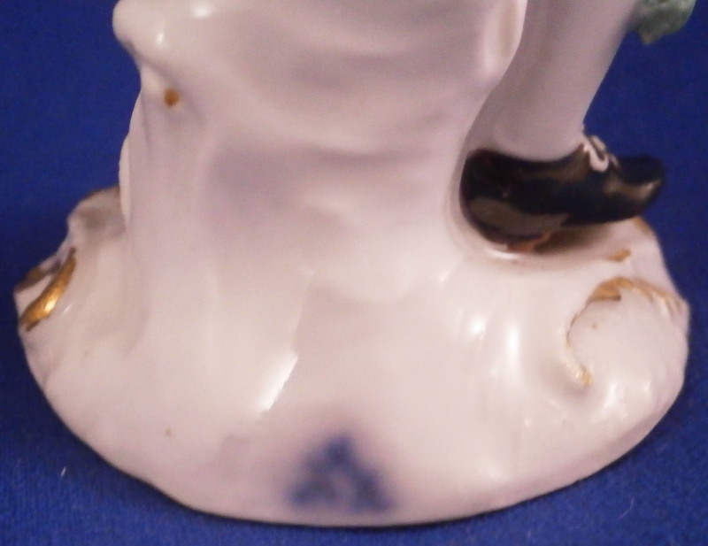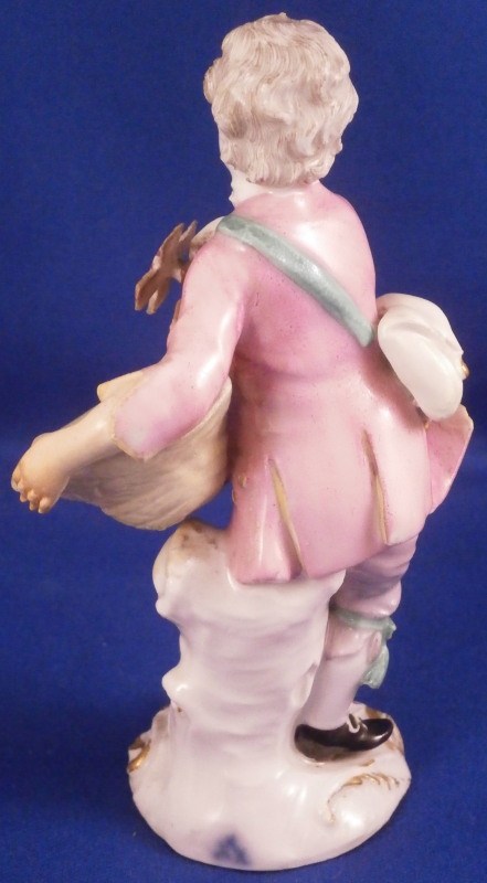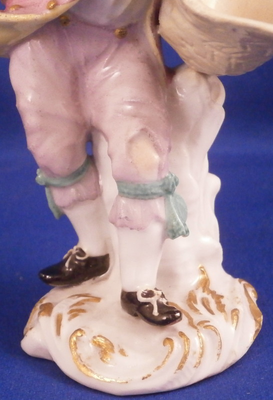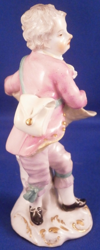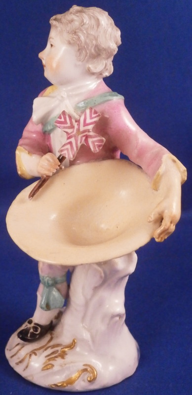 This is a figurine of boy / young man with a pinwheel in his hand made by Meissen in about 1750. A really nice figurine with the boy being nicely dressed with a pink jacket and purple pants. He has a bag on his back, the pinwheel in his right hand and a large straw hat or basket in the front. Typical base for this period with gilded scrolls. Very well modeled with lots of nice detail as one would expect from a Meissen figurine. The figurine is in great condition with a small chip to the tip of the jacket corner and his left hand/arm was worked on as was the basket. Very well done and I cannot tell what exactly was restored. Amazingly that pinwheel is still in perfect condition which is fun! He displays perfectly! The bottom of the base is flat and filled with only the air hole in it. The back of the base is marked with the under glaze blue crossed swords as shown! The figure is 4.5 inches tall, 2.375 inches wide and 2.125 inches deep. Please email me for more information or other pictures.