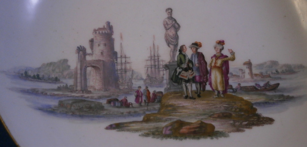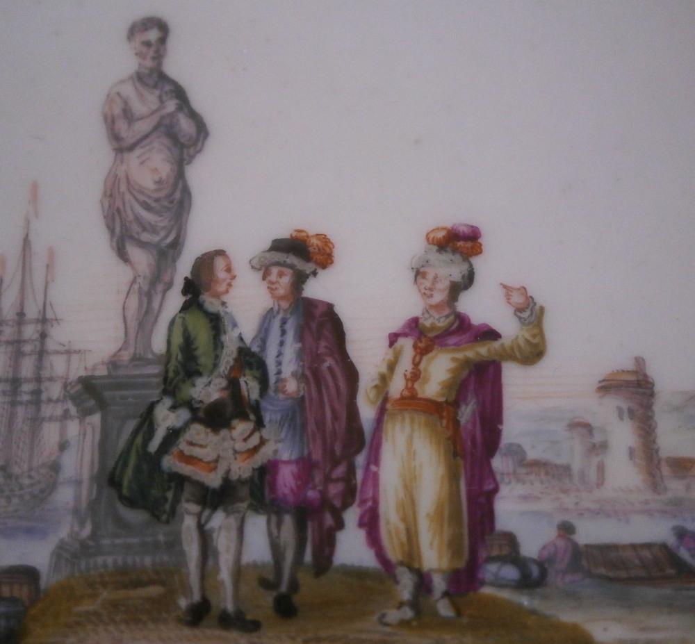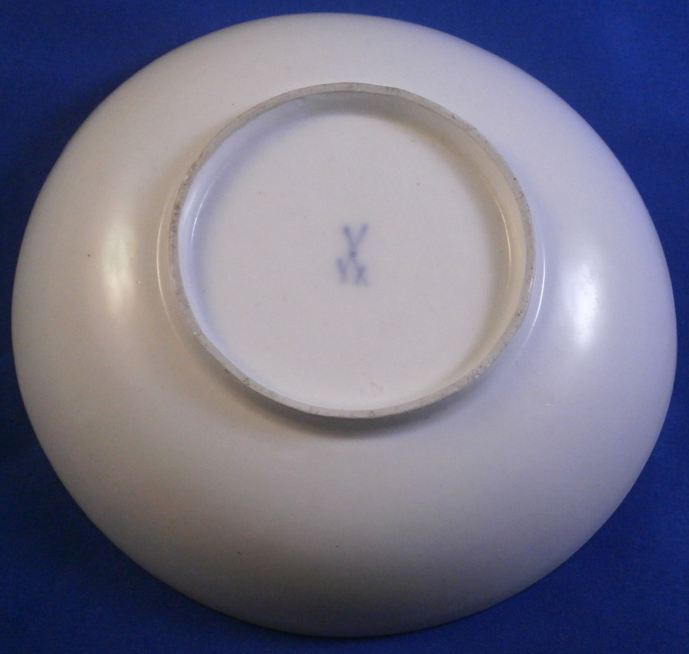 This is a nice saucer made by Meissen in the mid 18th century. A bit rough to call it simple since the scene is superb and amazingly detailed but usually these harbor / merchant type scenes have so much fancy gilding around it that it is refreshing to see just a simple gold trim to the edge. A stunning piece for sure! The scene in the center is quite large with lots of buildings and two large ships as well as a small boat and off course the merchants going about their business and some of their wares. It even has a large statue in the center. Top quality painting and more detail than many! The piece is in superb condition with just a minor touch of wear only visible under magnification. Mainly to the head of the one merchant. The dish is 1.125 inches tall and has a diameter of 5.25 inches. The saucer is marked underneath with the under glaze blue crossed swords mark as well as an impressed number as shown. Please email me for more information or other pictures.