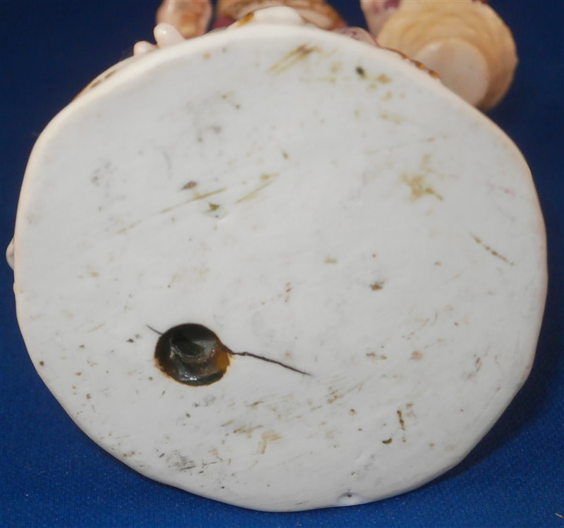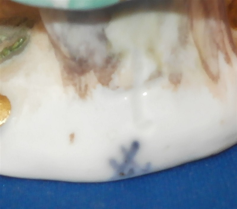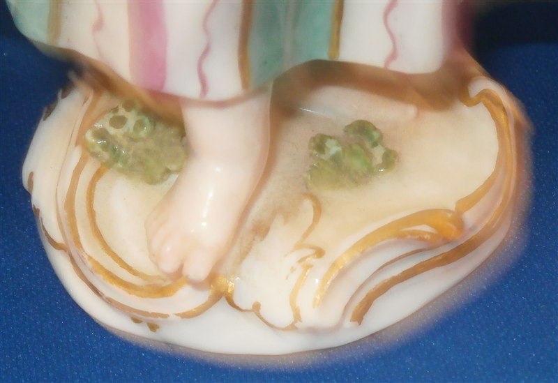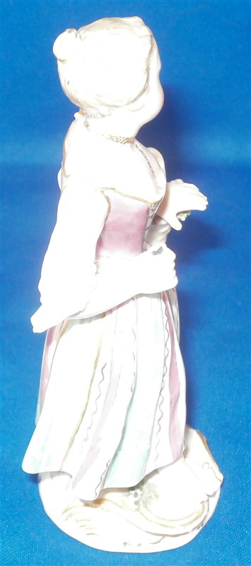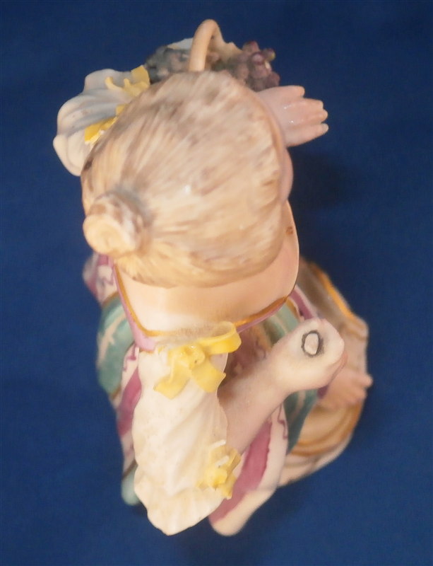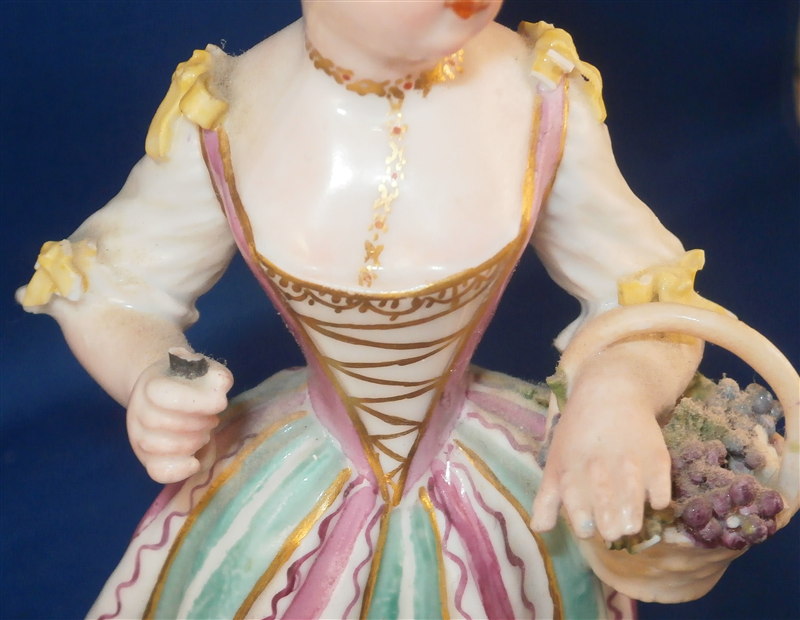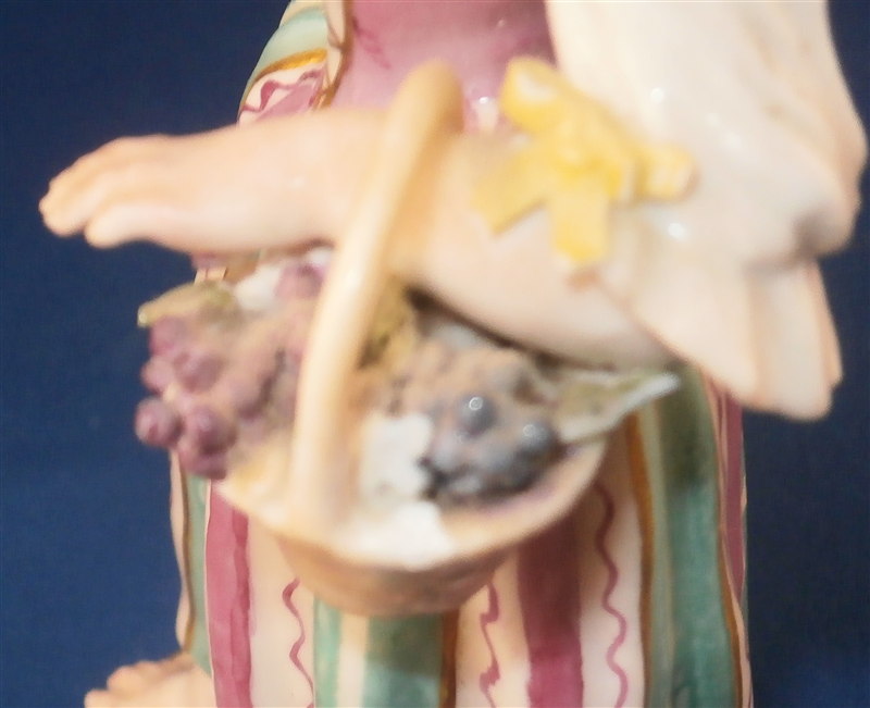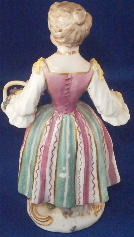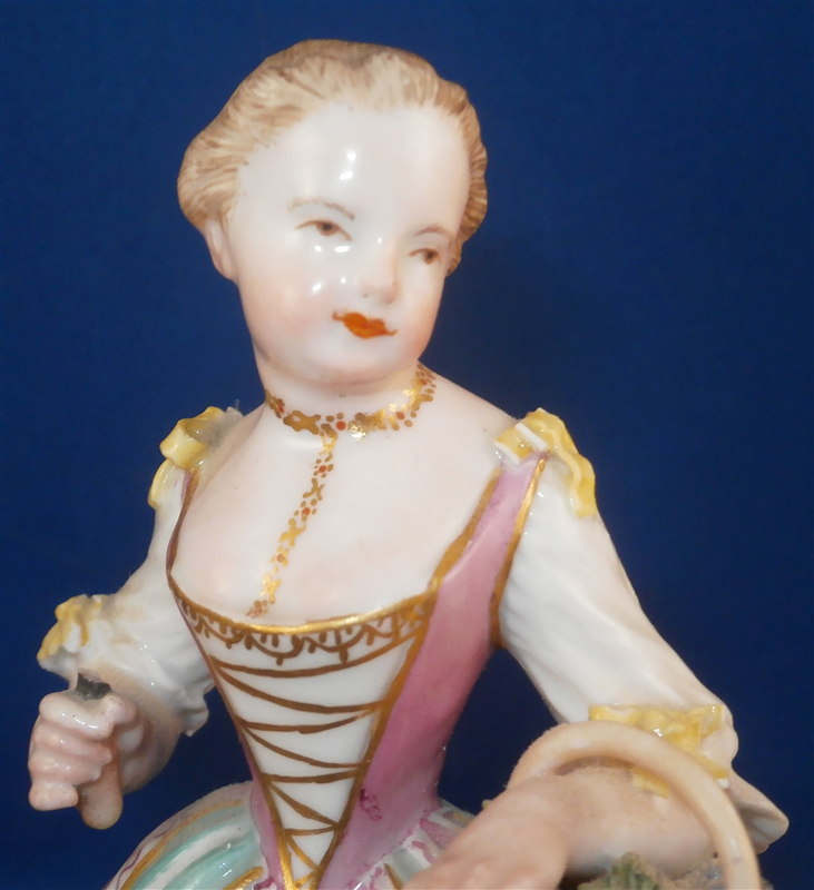 This is a figure of lady holding a flower basket in her left hand made by Meissen in about 1760. She is wearing a nice skirt with some bows on her blouse. Base is highlighted with raised designs and gilding. The figurine is in great condition with some damage to two leaves and a grape cluster in the basket as well as to the yellow bows on her blouse and the implement she was holding in her right hand is broken off. A few small spots of paint flaking to the aqua color as shown. The bottom of the base is flat and filled with only the air hole in it typical for Meissen. She is marked with the blue crossed swords mark with the dot between the bottom on the back of the base with some sort of incised mark above the mark. The figure is 5.375 inches tall, 2.75 inches wide and 2 inches deep. Please email me for more information or other pictures.
