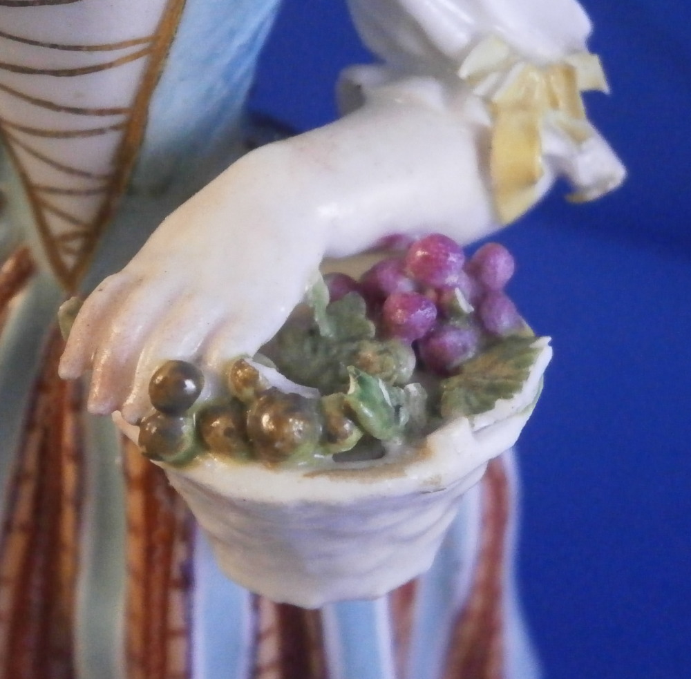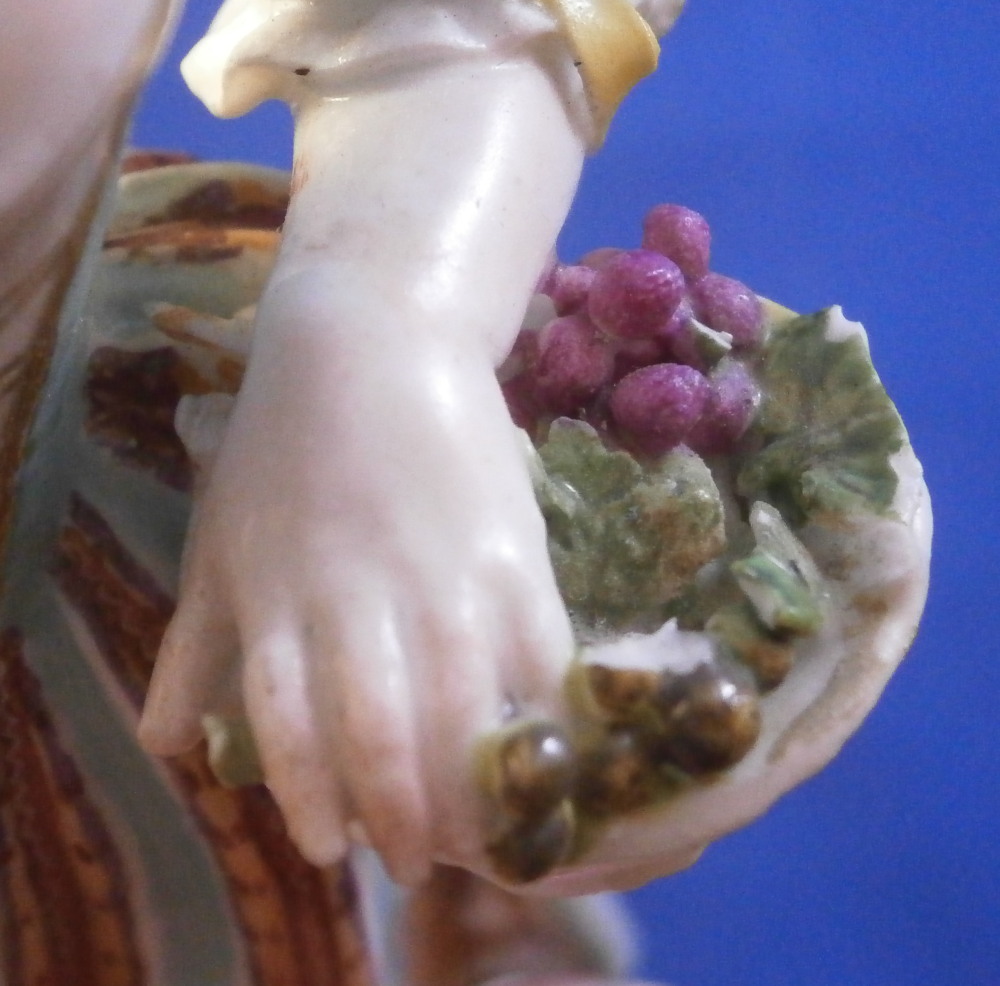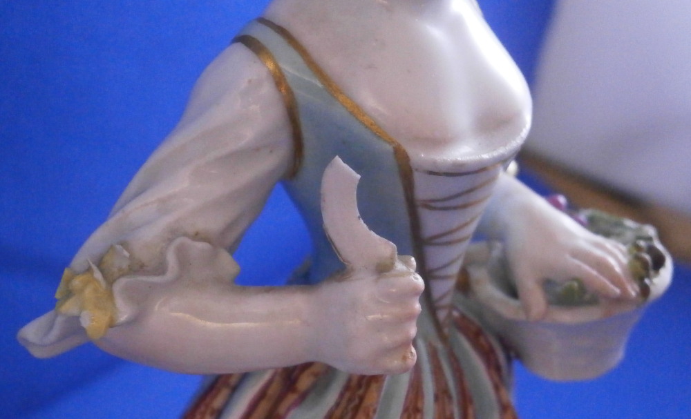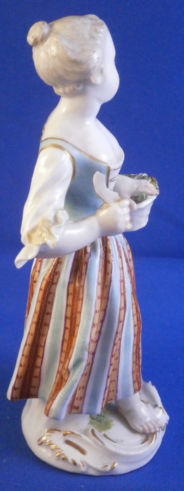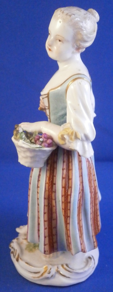 This is a figure of girl / young lady holding a flower basket in her left hand and a sickle in her right hand made by Meissen in the mid 18th century. She is wearing a nicely decorated skirt with some bows on the ends of her sleeves. Base is decorated with raised scrolls highlighted with gilding. The figurine is in good condition with some damages - the tip of the sickle is missing, a bit of damage to the bows and the handle of the basket is gone and some small chips to the goodies in the basket. Some glaze flaws from when she was made but all in all a very nice example of their early work. The bottom of the base is flat and filled with only the air hole in it typical for Meissen. She is marked with the blue crossed swords mark under the base but it's really faint which is normal on the unglazed pieces. The figure is 5.375 inches tall, 2.625 inches wide and 2.125 inches deep. Please email me for more information or other pictures.