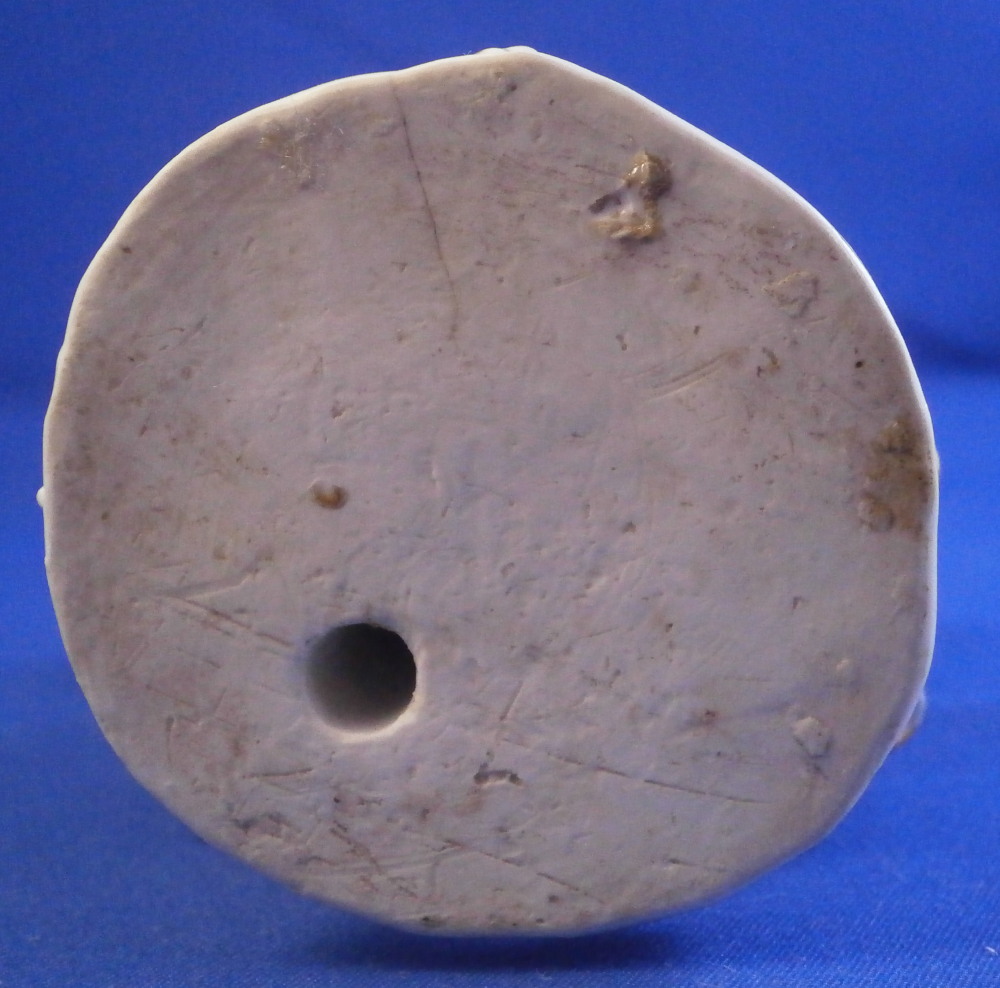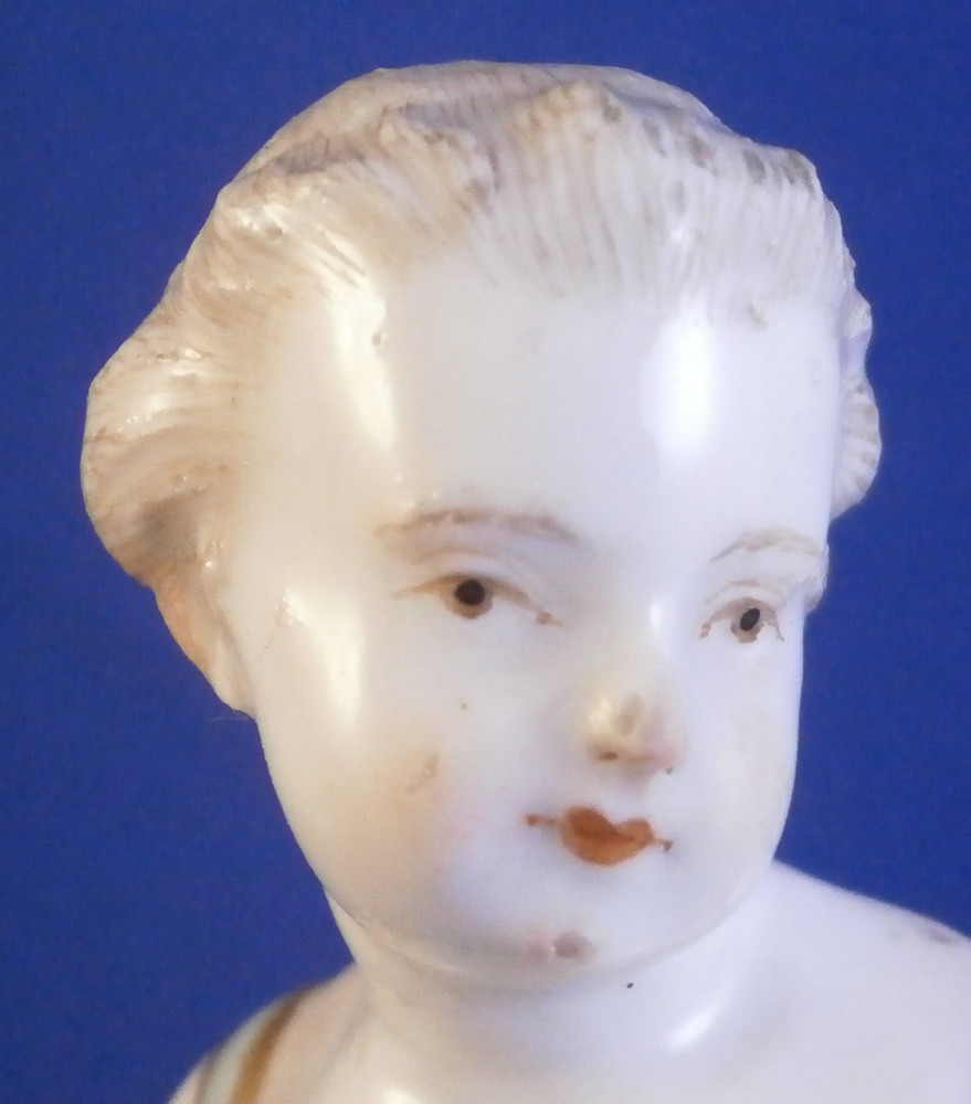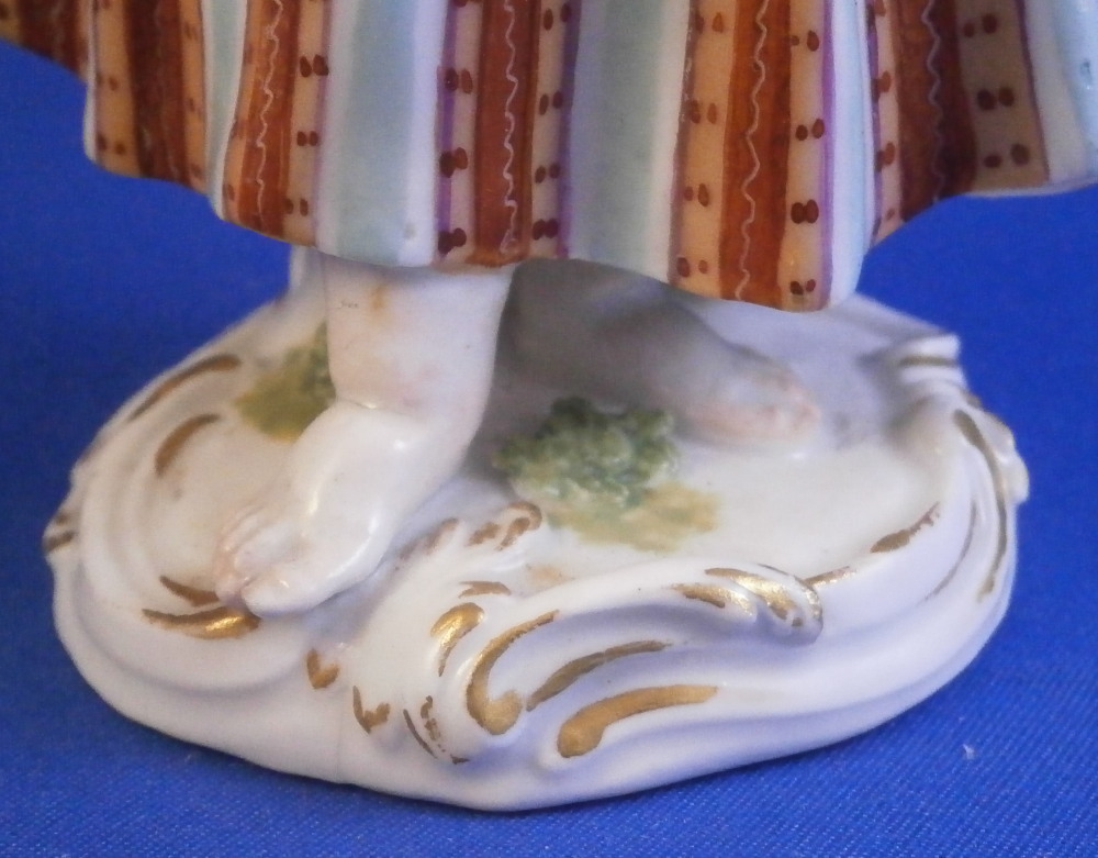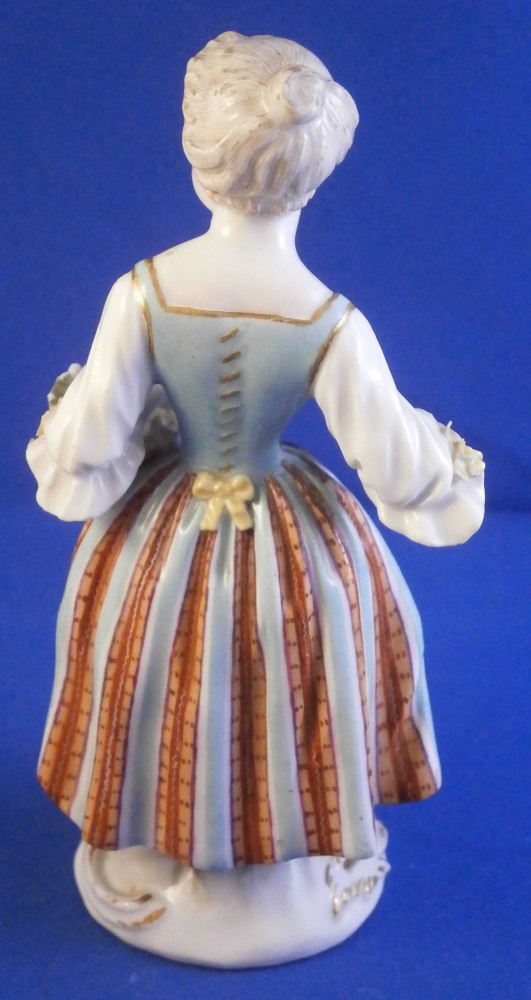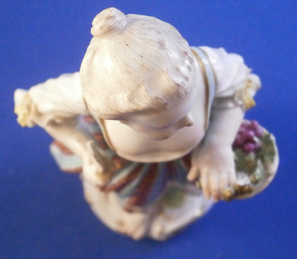 This is a figure of girl / young lady holding a flower basket in her left hand and a sickle in her right hand made by Meissen in the mid 18th century. She is wearing a nicely decorated skirt with some bows on the ends of her sleeves. Base is decorated with raised scrolls highlighted with gilding. The figurine is in good condition with some damages - the tip of the sickle is missing, a bit of damage to the bows and the handle of the basket is gone and some small chips to the goodies in the basket. Some glaze flaws from when she was made but all in all a very nice example of their early work. The bottom of the base is flat and filled with only the air hole in it typical for Meissen. She is marked with the blue crossed swords mark under the base but it's really faint which is normal on the unglazed pieces. The figure is 5.375 inches tall, 2.625 inches wide and 2.125 inches deep. Please email me for more information or other pictures.