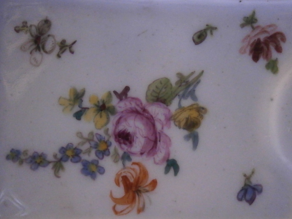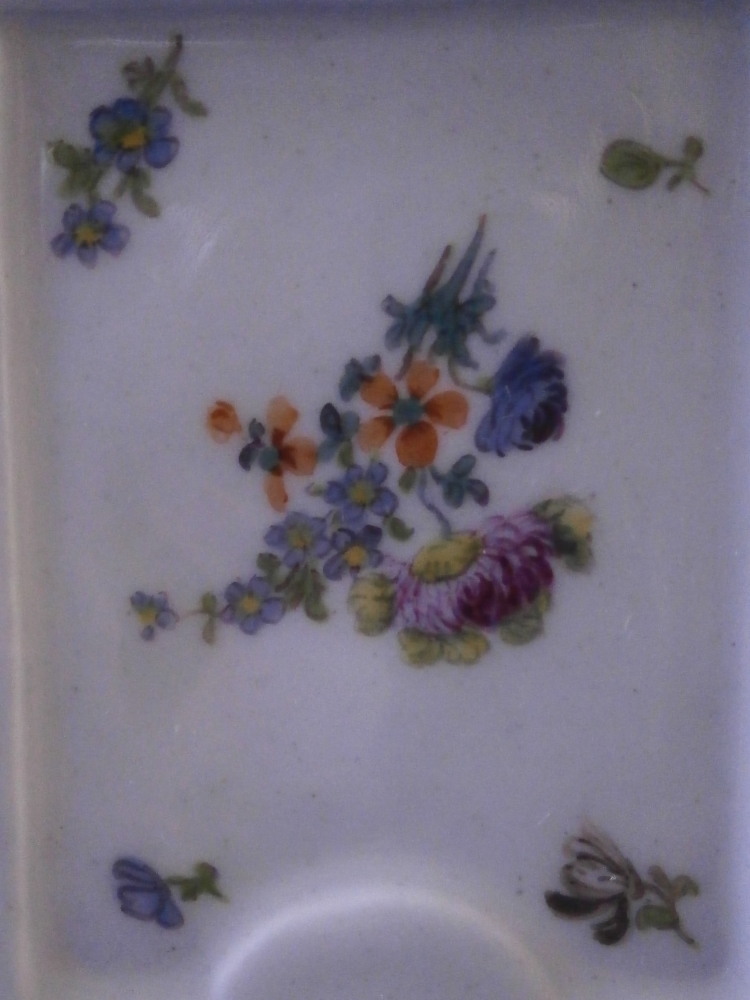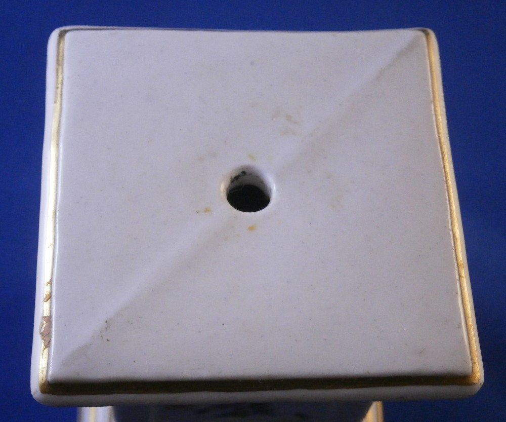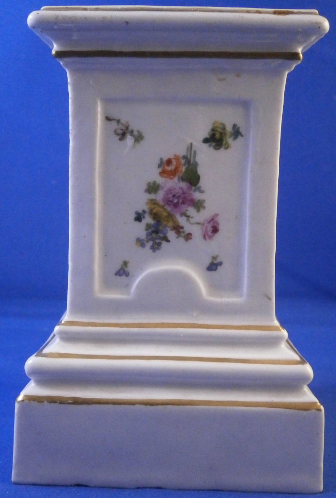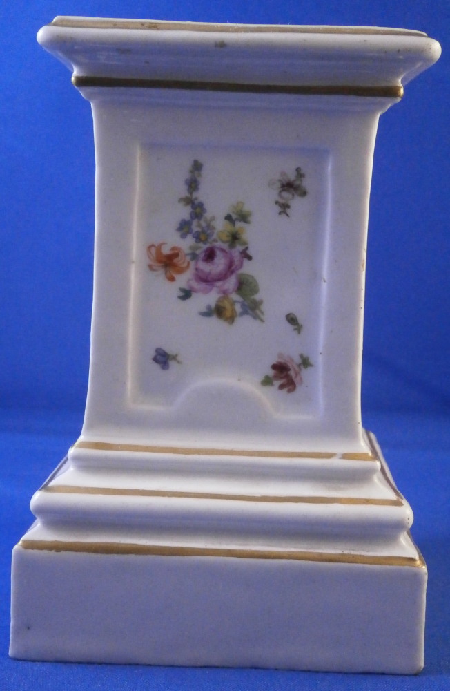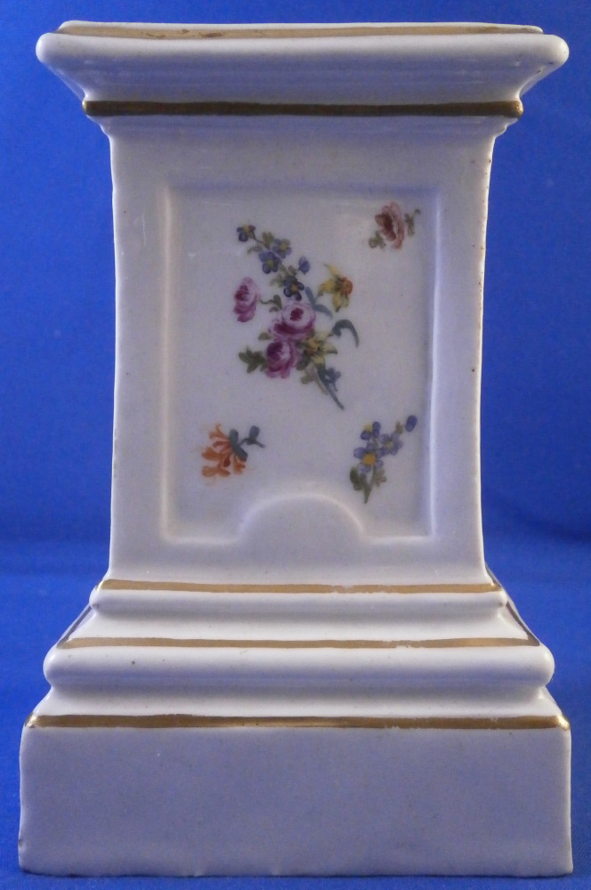 This is a great base / pedestal for a figurine made by Meissen in about 1750. The piece has a tall slender shape to it with a rectangular base with three gold trimmed levels to the bottom and a gold trim to the top part. Each side has a relief design to it with a floral arrangement in the center as well as some smaller scattered flowers. A hole in the top to secure a figurine and to help with the firing process. It would make a nice addition to a figurine from this period! The pedestal is in superb condition with the gold trim in great condition and jsut a few small nibbles mainly to the very bottom edge and mainly from when it was made. One tiny nibble to the corner edge. It displays perfectly! jThe bottom of the base is flat and unglazed. No mark but it is very obvious that it is a Meissen piece from this period! The base is 4.25 inches tall and 2.75 inches on each side at the bottom. The top part is 2.625 inches on the sides. The light staining at teh top was from some glue residue which I cleaned off. Please email me for more information or other pictures.