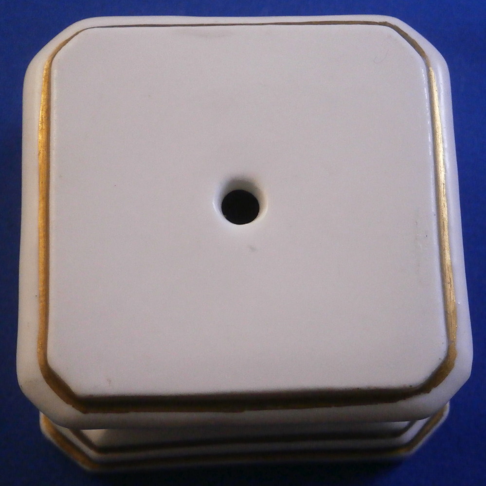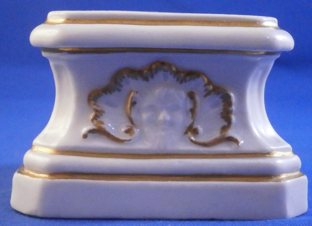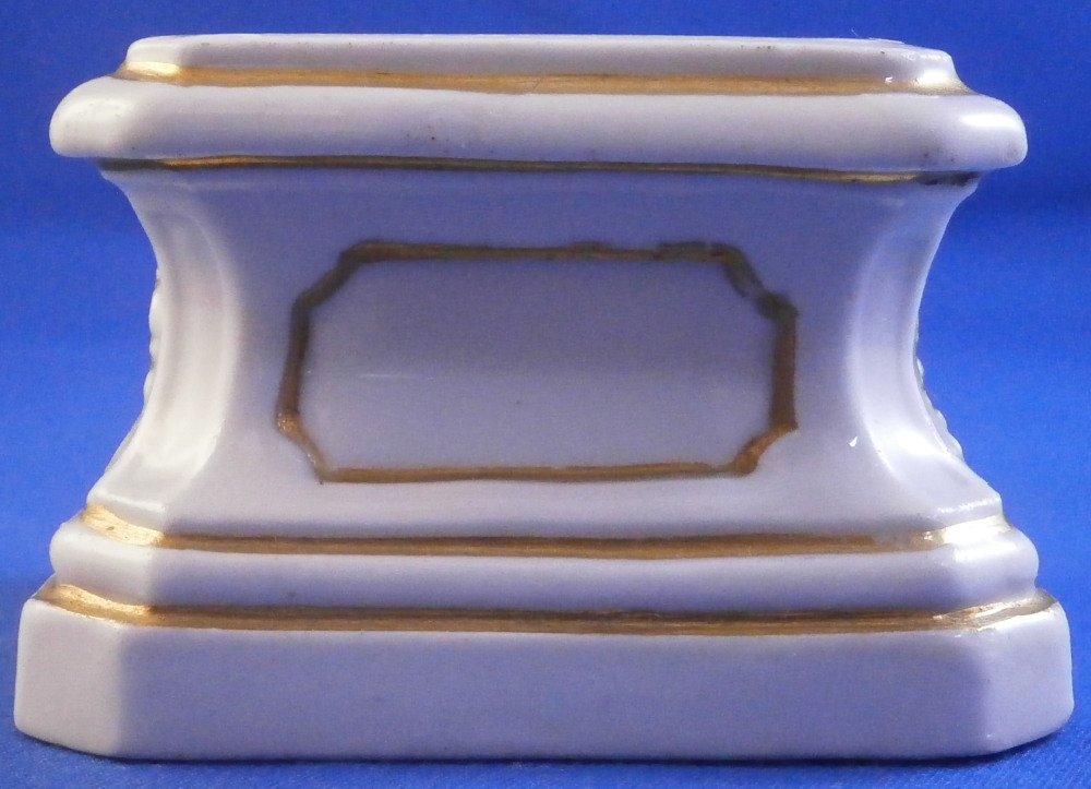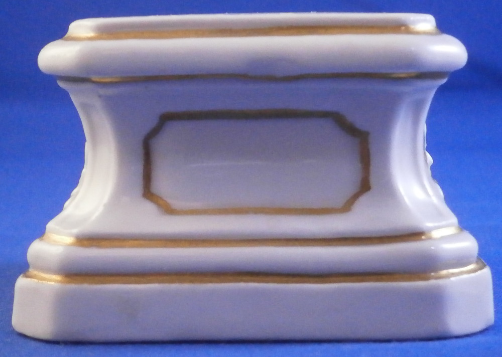 This is a great base / pedestal for a figurine made by Meissen in about 1750. The piece has a nice shape to it and is decorated in relief with some nice detail including faces that remind me of the mythical faun creatures and some gold trim. I have a figurine that comes with this exact same base but they are one piece. Apparently they also made it separately which doesn't surprise me. It would make a nice addition to a smaller figurine! The pedestal is in perfect condition with jsut a small flaw from when it was made as shown. Not obvious at all and it displays perfectly! The bottom of the base is flat and unglazed. No mark but it is very obvious that it is a Meissen piece from this period! The base is just under 1.5 inches tall, 2.25 inches wide and 2.25 inches deep. The top area is about 1.75 inches wide and deep so any figurine would have to have a base with that size maximum. Please email me for more information or other pictures.