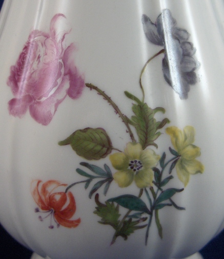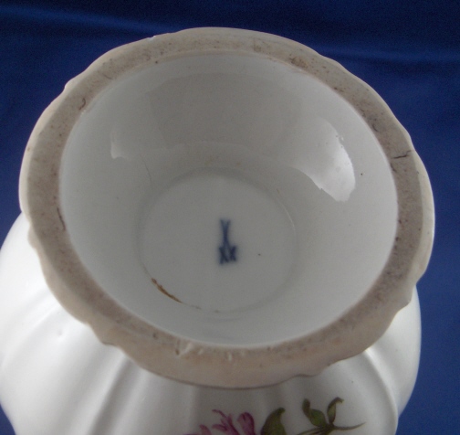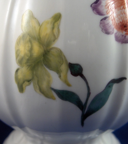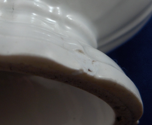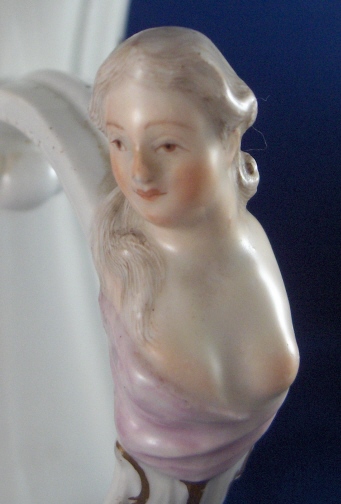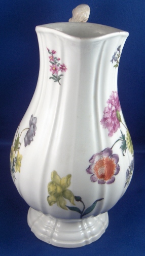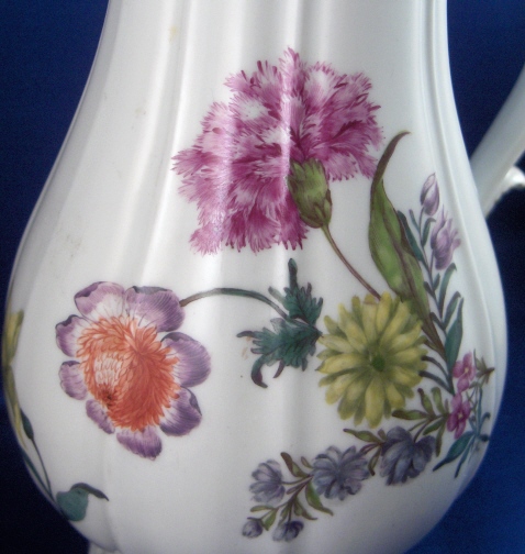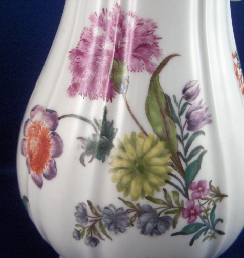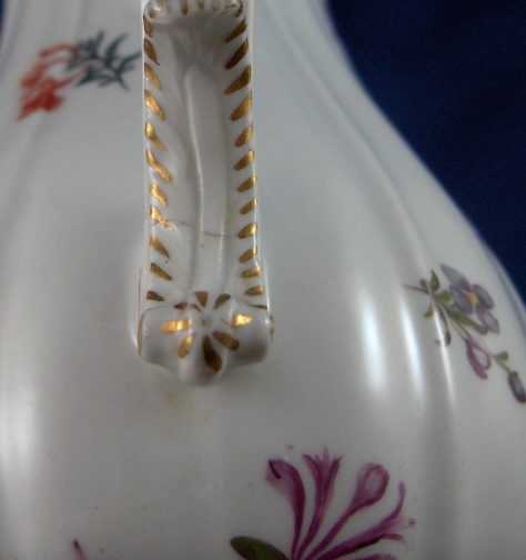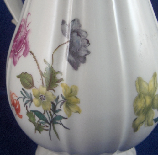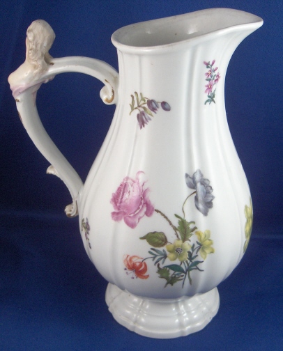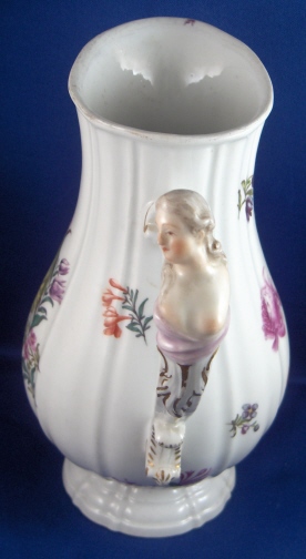 This is a porcelain pitcher made by Meissen around 1740-50. It is handpainted with a large flower arrangment on both sides, a large yellow flower on the front and some smaller flowers throughout. The flowers are still highly influenced by the woodcut flowers of the early Meissen period but are already exhibiting strong signs of the Deutsche Blumen as well so probably from the late 40's or early 50's. There is a neat bust of a nude lady on the top of the handle and some gold trim as well. Nice relief design to the paste itself. This pitcher is in great condition with a small chip to the foot which isn't very obvious, a crack through the bottom of the handle (not the top!) and a purple smudge to the inside spout rim. The pitcher is 8 inches tall, 6 inches wide and 4.5 inches deep. Marked underneath with the underglaze blue crossed swords that are straight. Please email me for more information or other pictures.