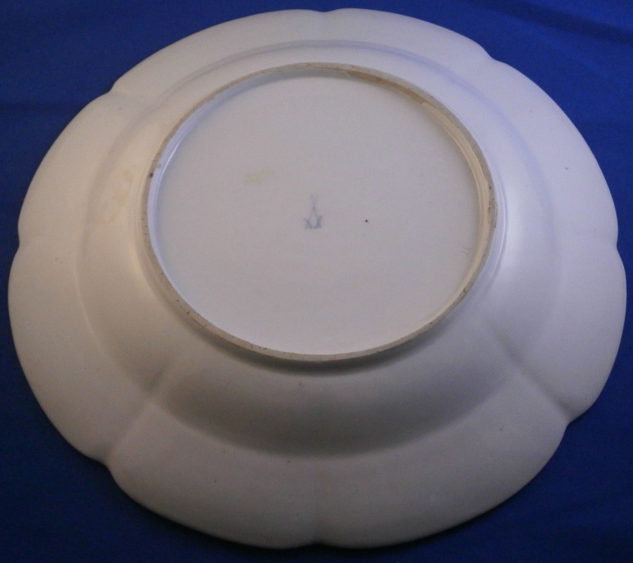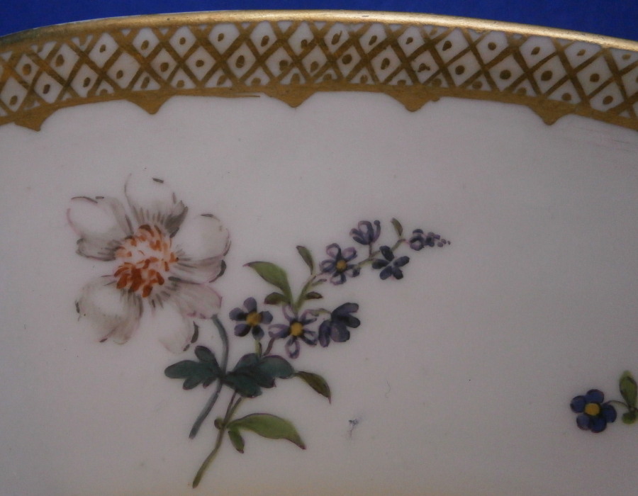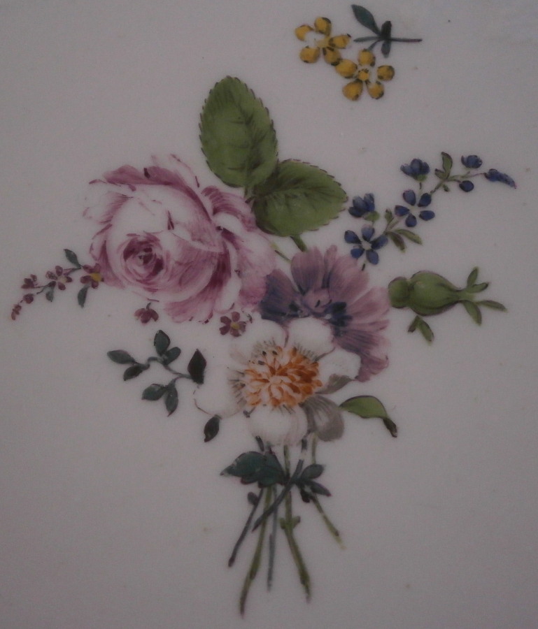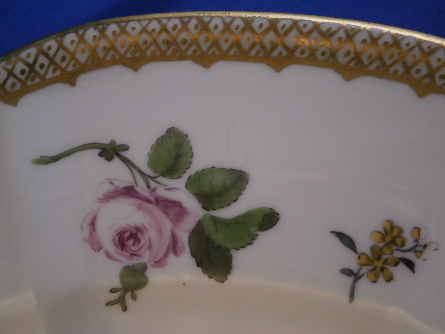 This is a great porcelain plate made by Meissen in the mid 18th century. This is the same style was also used for the St. Andrews Service and the Tsarina Elizabeth I of Russia Service. The plate is decorated with the Gotzkowski erhabene Blumen (raised flowers) design in the paste ( a bit hard to see in the pictures), a nice floral arrangement in the center and four more along the rim plus lots of little single flowers scattered about. The flowers are already in the Deutsche Blumen style but still show the influence of the Woodcut flowers so they are very early on probably around 1745. What makes it more special is that relaly nice gold trim along the edge. It's not super uncommon but it is almost always very worn which kind of makes it looks cruddy. So it's nice to ahve it in such good shape and it really makes the piece look elegant! The plate is in great condition with just some very minor wear along the high points of the edge. The plate is 1.25 inches tall and 9.75 inches in diameter. Marked underneath with the under glaze blue crossed swords as well as an impressed number 21. Please email me for more information or other pictures.