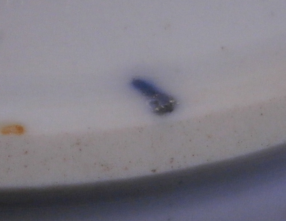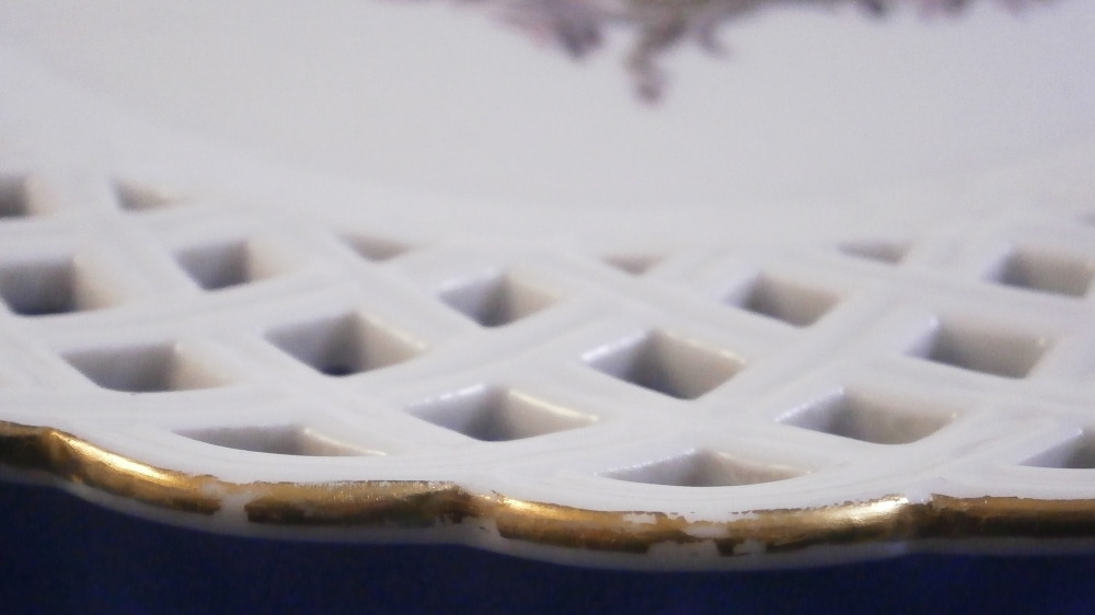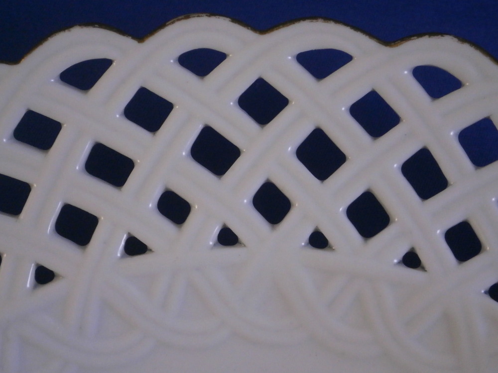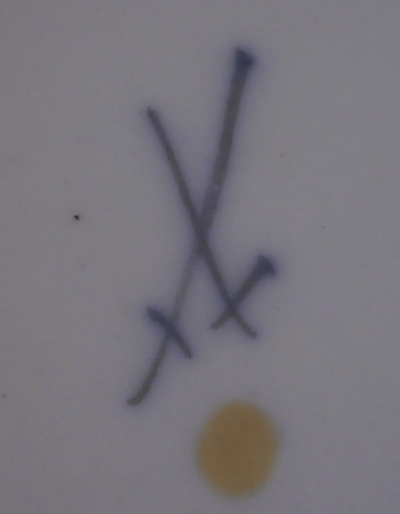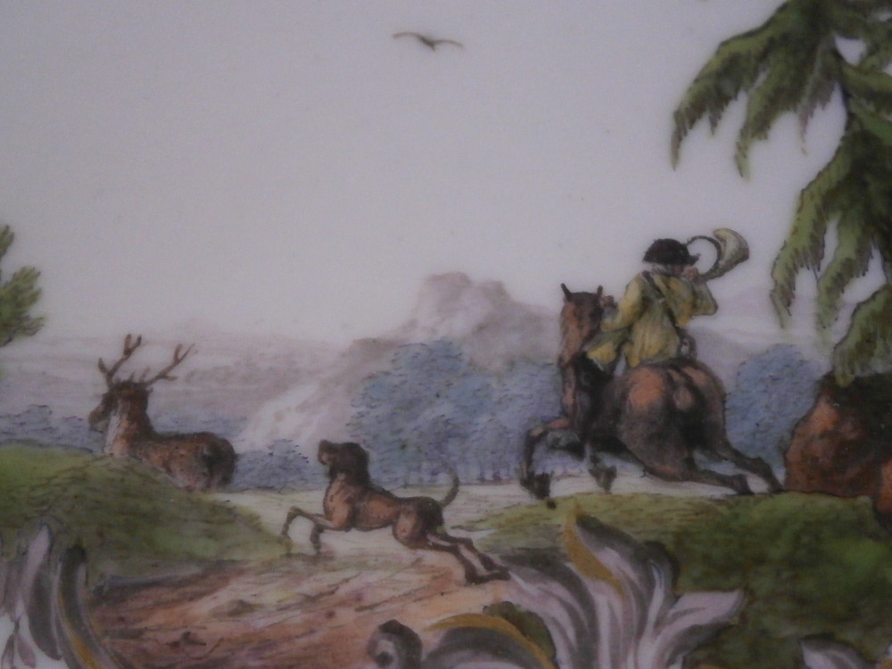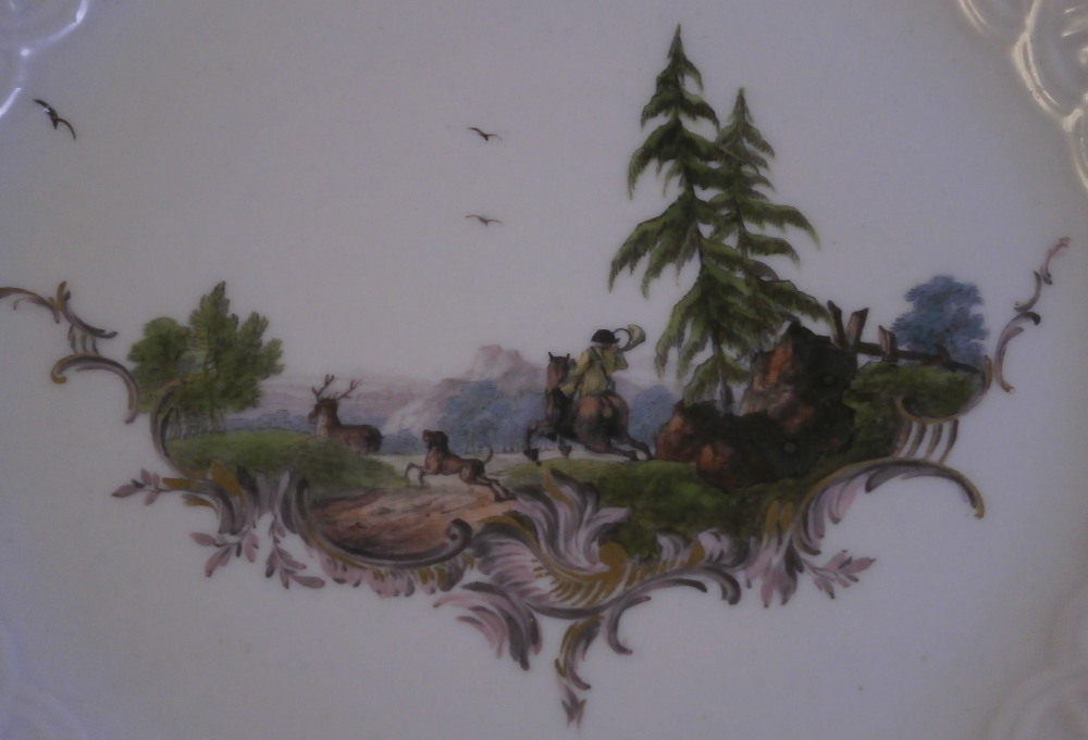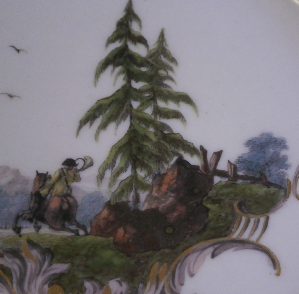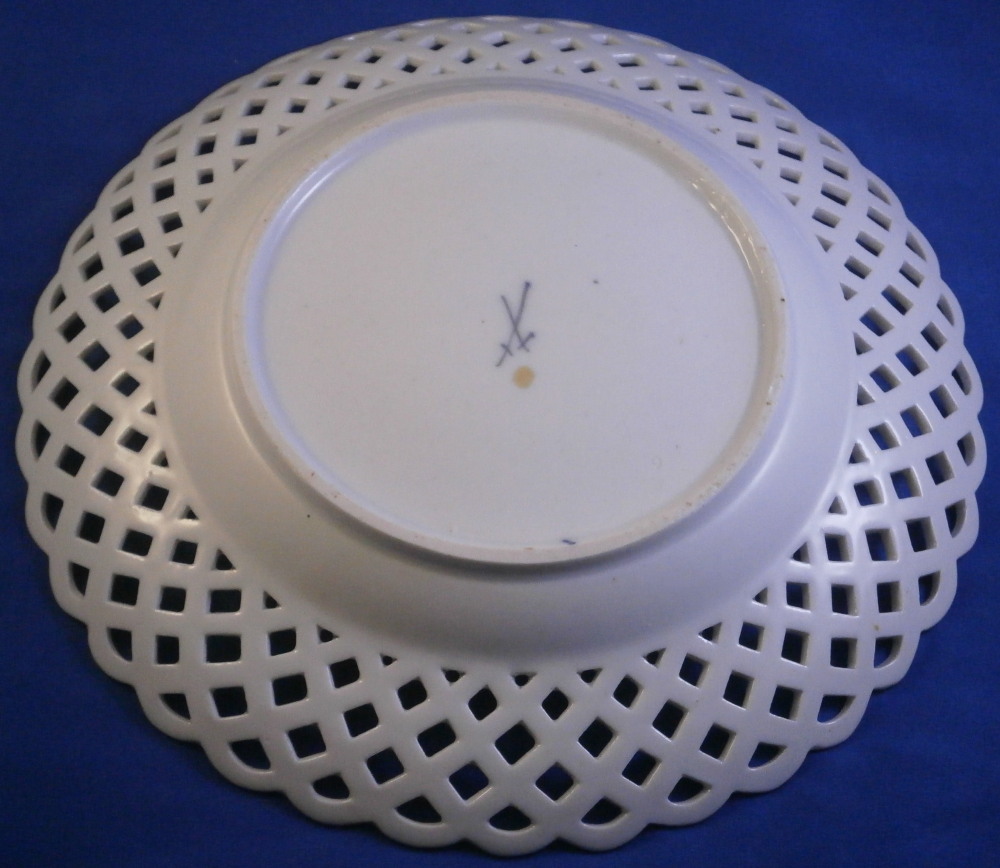 This is a superb plate made by Meissen in the mid 18th century. It has a basket weave style reticulated rim design with some relief detail to the paste, a gold trim to the edge and a superb hunting scene in the center including a hunter on his horse blowing his horn a dog by his side and a stag deer in front all in a nice landscape surrounding with some great scroll work right under the scene which is quite typical for this period. A superb example! The plate is in superb condition with just some wear to the gold trim on the very edge which is to be expected. It displays perfectly! The dish is marked with the under glaze blue crossed swords mark, a blue line near the foot ring, the usual impressed number one finds on Meissen of this period and an incised script F mark not sure what that is for but it is unusual. The plate is 1.25 inches tall and 9 inches in diameter. Please email me for more information or other pictures.