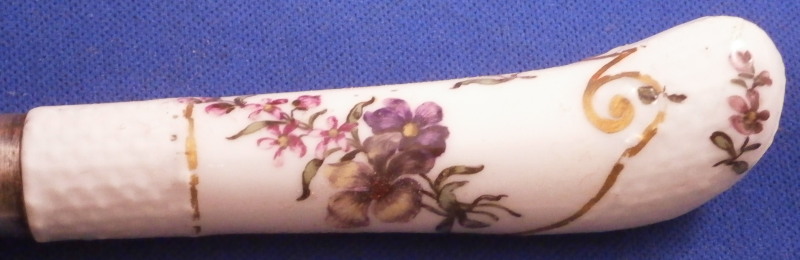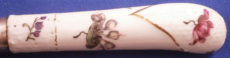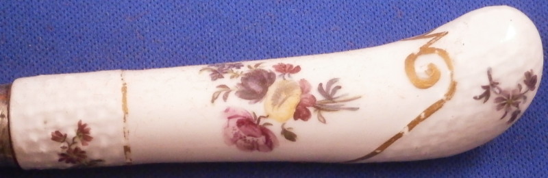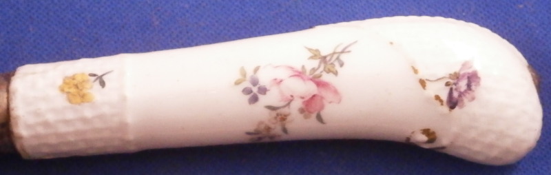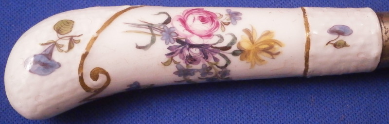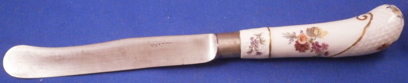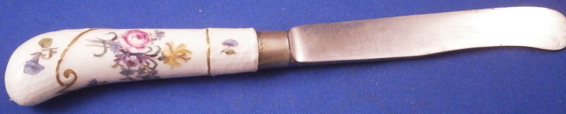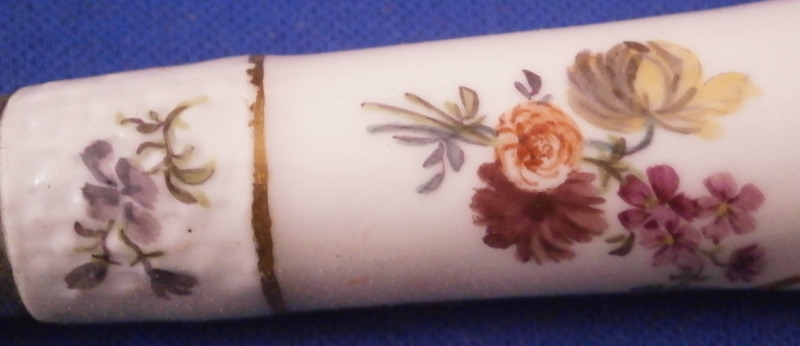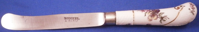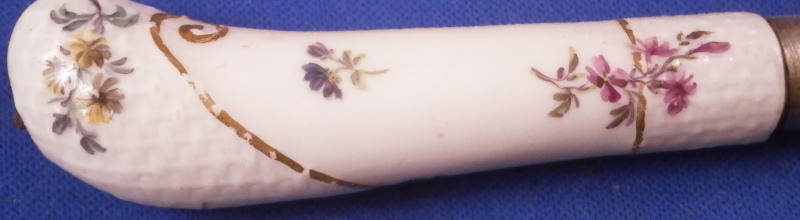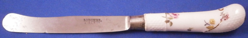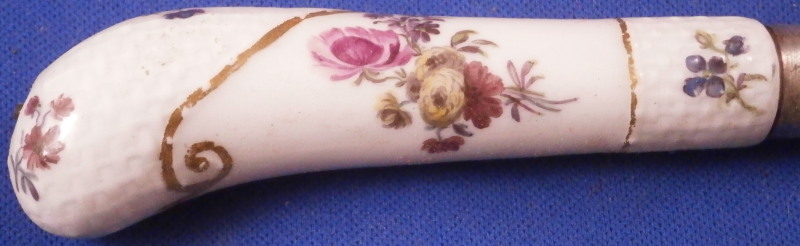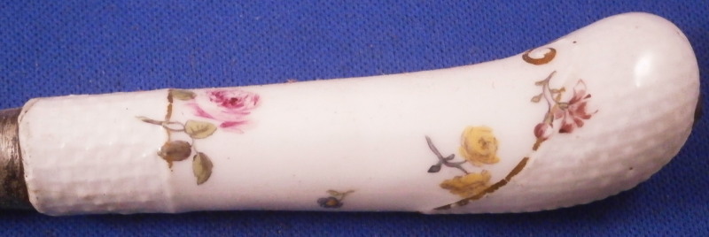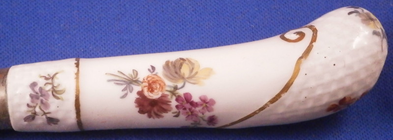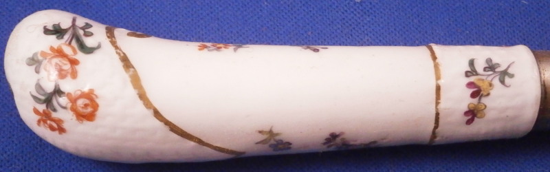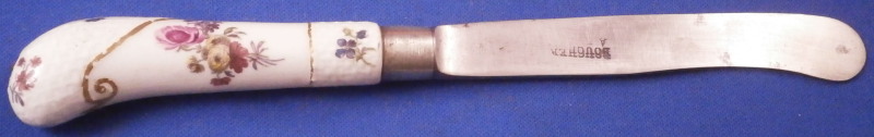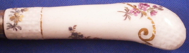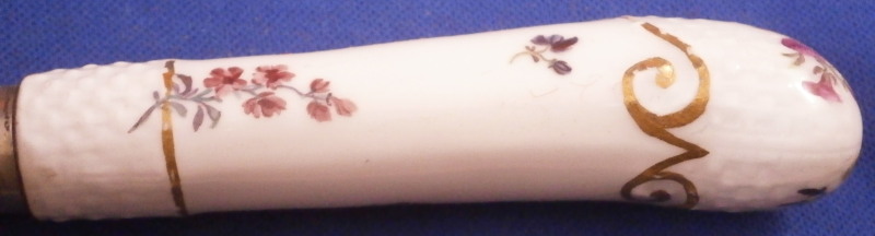 This is a rare set of six knives made by Meissen in about 1740. Smaller in size so likely for butter or fruit. The handles are in the pistol grip shape with a basket weave design to the ends, some gold trim and some really nice flowers. Each knife has a larger floral arrangement as well as lots of small single flowers scattered about. The metal parts are made of steel and original to the period I believe. They are marked with an impressed Boucher a Paris, one is unmarked and one has Vallon impressed on the blade. The ferrules are probably silver which was usually the case. The metal part goes into the handle and there is a spot coming out on the other end to fasten it in place which was only done on early pieces. Most of the knives are missing that little metal end disk to fill the tiny hole! The set is in superb condition with some minor wear, one handle has a firing crack under the glaze and one has two sections near the ferrule that are damaged - I don't think the porcelain ever chipped but there are cracks as shown. Each knife is 7.625 inches long of which 3.125 inches is the length of the visible porcelain handle. The porcelain is not marked or shall we say visibly marked since it would be hidden by the ferrule which is normal but it is definitely made by Meissen. It is rare to find a set of knives in their original box. The box is not in the best of shape anymore but it is still nice to have it! Please email me for more information or other pictures.