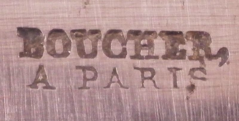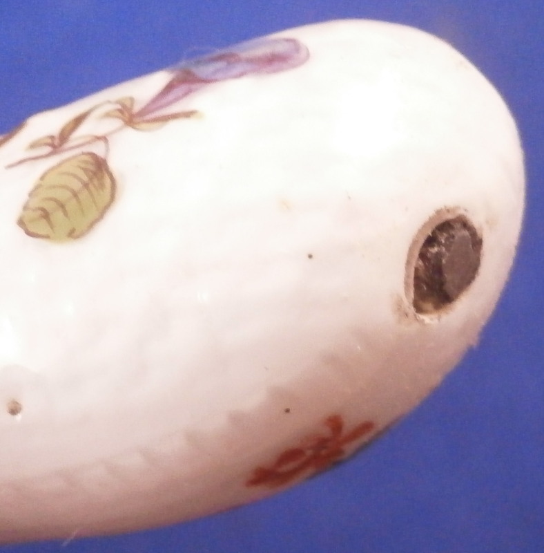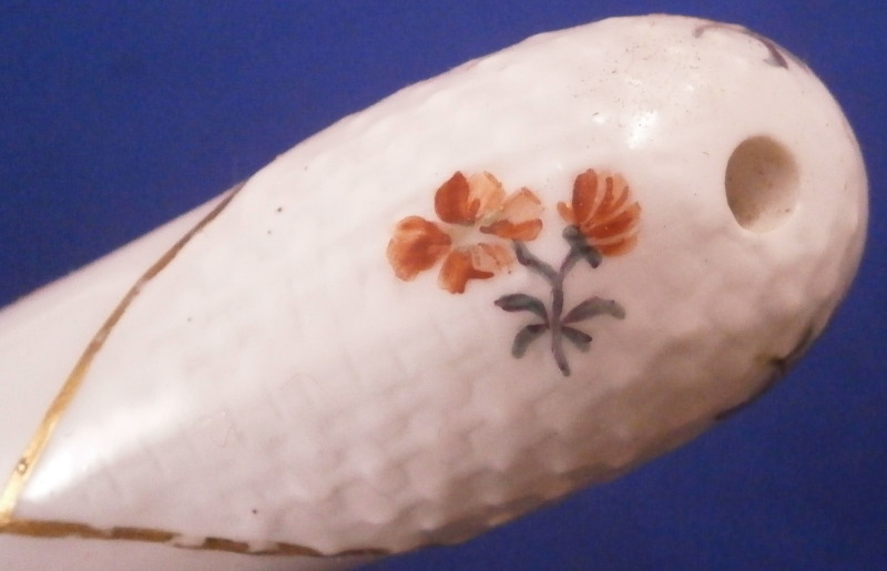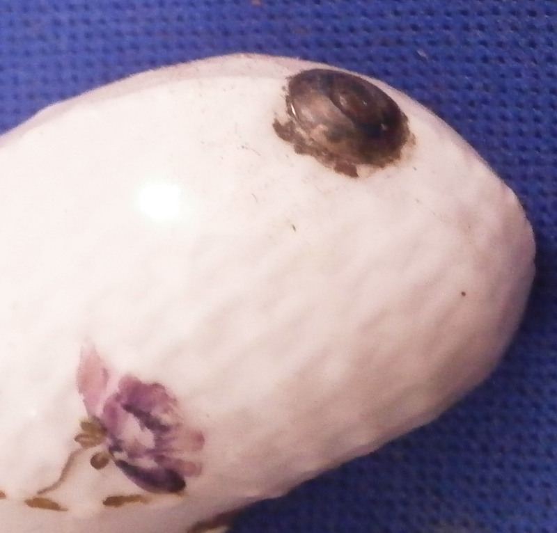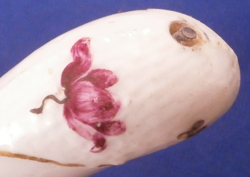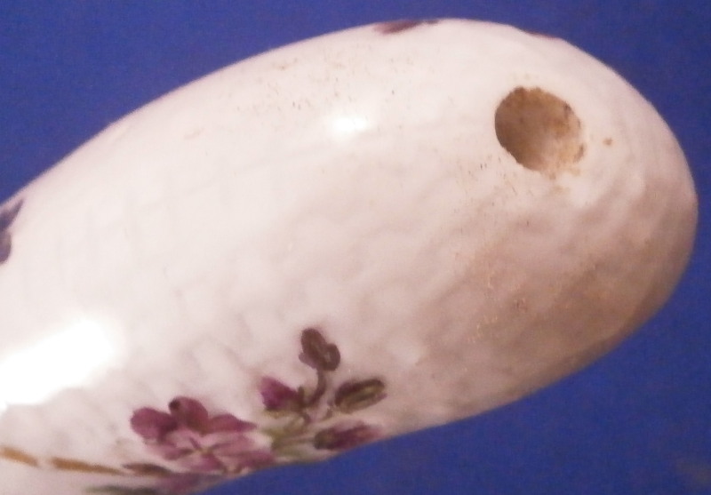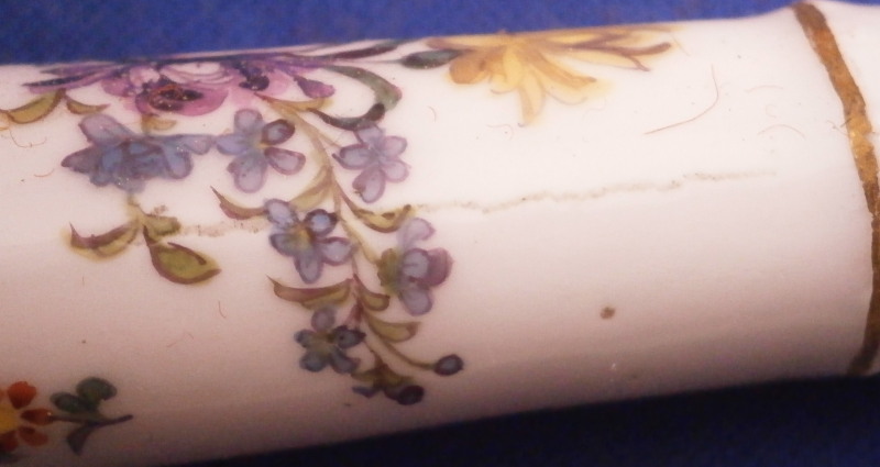 This is a rare set of six knives made by Meissen in about 1740. Smaller in size so likely for butter or fruit. The handles are in the pistol grip shape with a basket weave design to the ends, some gold trim and some really nice flowers. Each knife has a larger floral arrangement as well as lots of small single flowers scattered about. The metal parts are made of steel and original to the period I believe. They are marked with an impressed Boucher a Paris, one is unmarked and one has Vallon impressed on the blade. The ferrules are probably silver which was usually the case. The metal part goes into the handle and there is a spot coming out on the other end to fasten it in place which was only done on early pieces. Most of the knives are missing that little metal end disk to fill the tiny hole! The set is in superb condition with some minor wear, one handle has a firing crack under the glaze and one has two sections near the ferrule that are damaged - I don't think the porcelain ever chipped but there are cracks as shown. Each knife is 7.625 inches long of which 3.125 inches is the length of the visible porcelain handle. The porcelain is not marked or shall we say visibly marked since it would be hidden by the ferrule which is normal but it is definitely made by Meissen. It is rare to find a set of knives in their original box. The box is not in the best of shape anymore but it is still nice to have it! Please email me for more information or other pictures.