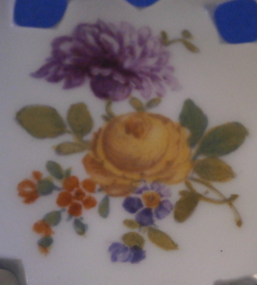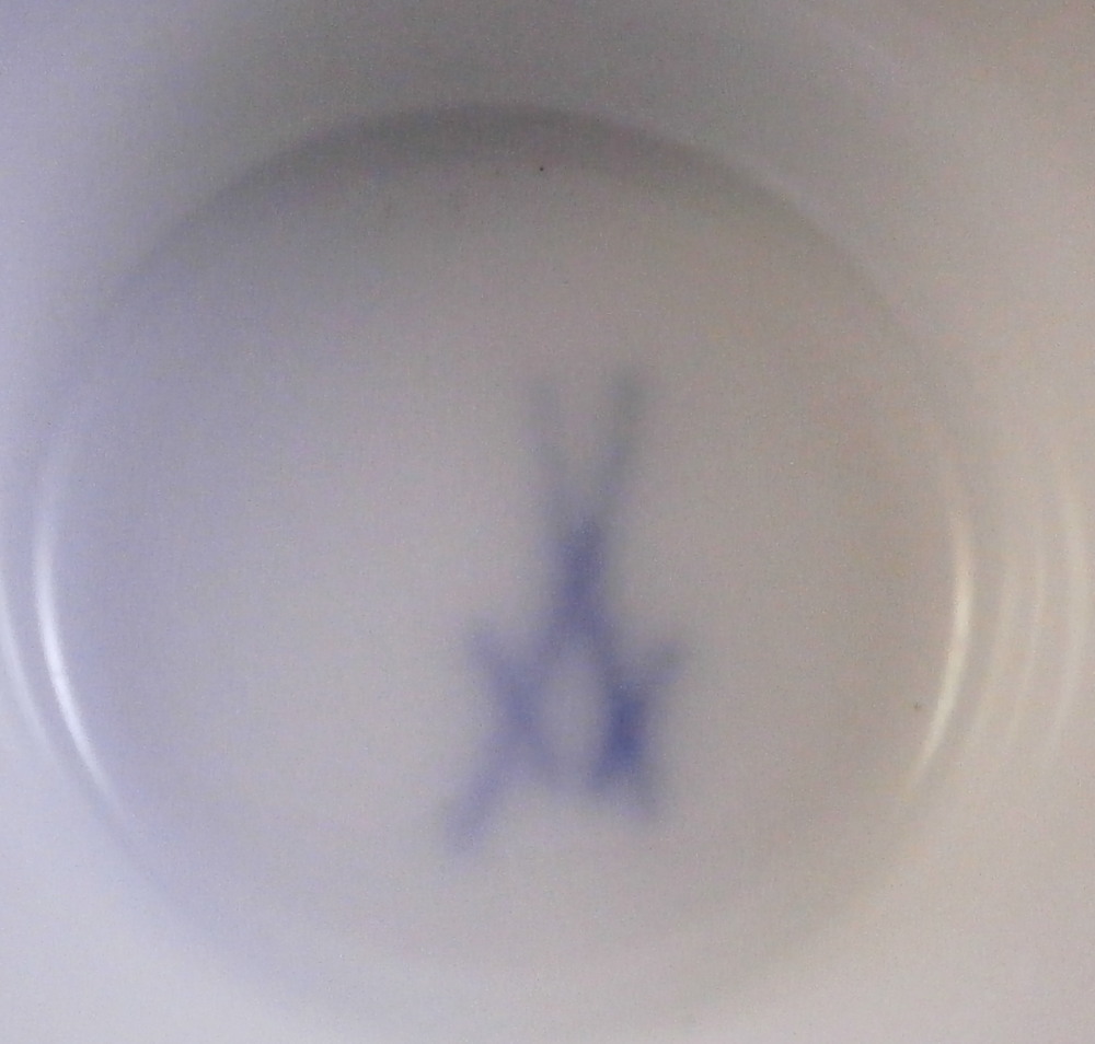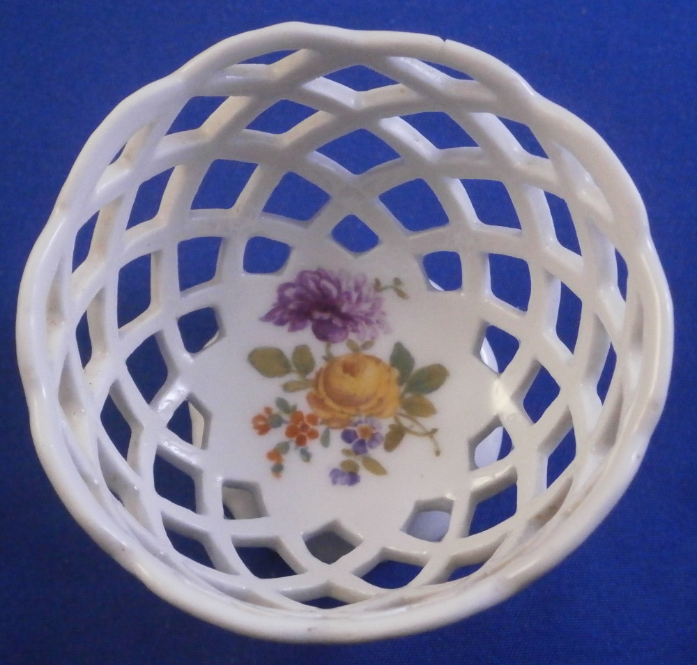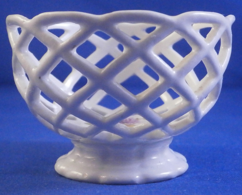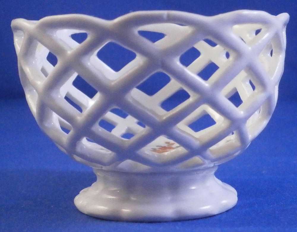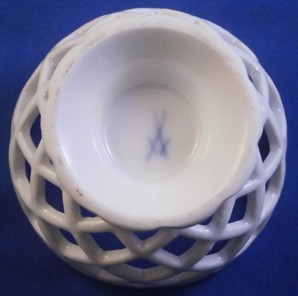 This is a very rare piece made by Meissen in the mid 18th century. It is a cup holder known as a Zarf. A zarf is a holder that is placed around a cup to protect the holder's fingers from the heat of the drink. Zarfs are often used for cups without handles. Could be a small porcelain Koeppchen or a metal (possibly silver or even gold in this case) fincan cup. I have not seen one from the 18th century before! The piece has a reticulated top with a little base. The inside bottom has a small hand painted floral arrangement to it. A very delicate piece so probably an extremely rare survivor. The piece is in great condition with just a small chip to the top edge as shown which resulted in a hairline to that small top section. The piece displays superbly and is just waiting for a new inside cup. I am sure one could be made for it to complete it once again and that would make for an amazing look! The piece is marked underneath with the under glaze crossed swords mark from about 1750 as shown. Please email me for more information or other pictures.