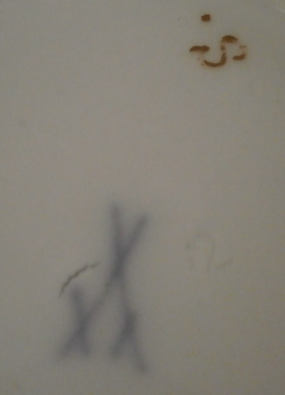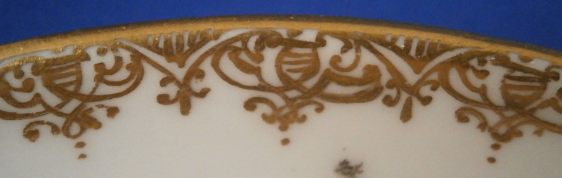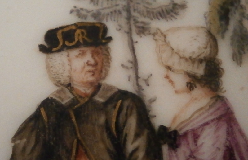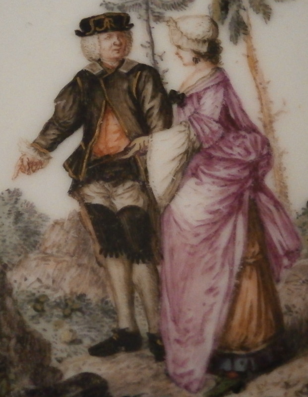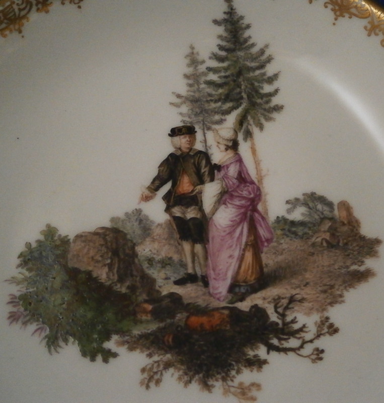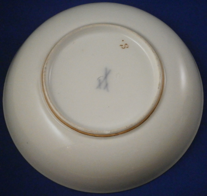 This is a rare early saucer made by Meissen in about 1745. It is superbly hand painted with a scene that is highly collectible - a Saxon miner ( Bergleute ) and his lady in a landscape surrounding. Mining scenes are rare on Meissen porcelain and when they do come up they are gone just as fast as the appeared since people love them. The miner is dressed in his typical outfit with the hat that has the gold AR for Augustus Rex on it while the lady is wearing a fancy outfit. Nice landscape surrounding including two tall trees in the background, some rocks and greenery. The rim has some fancy gilding to it as shown and the foot ring has a gold ring around it. The saucer is in perfect condition! The piece is 1 inch tall and has a diameter of 4.75 inches. It is marked underneath with the under glaze blue crossed swords mark, a gold S. as well as an impressed number 12 I believe. Please email me for more information or other pictures.