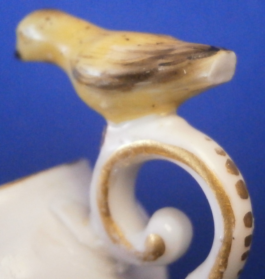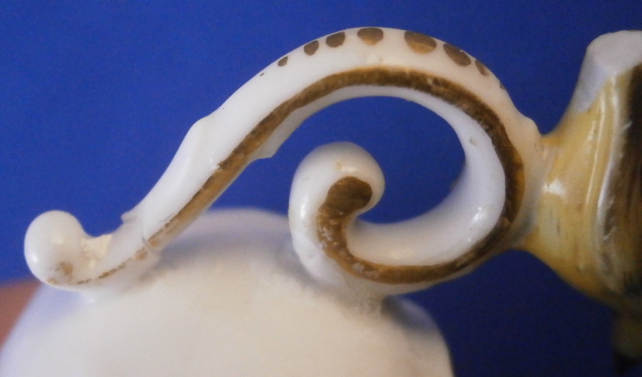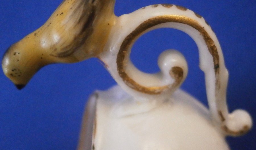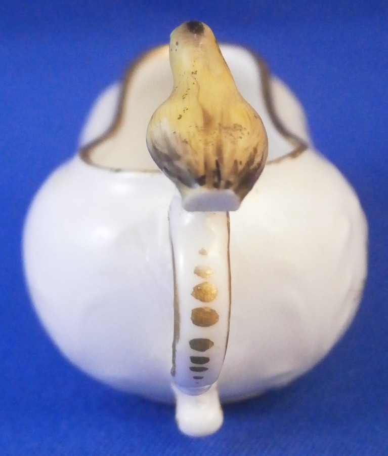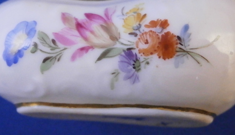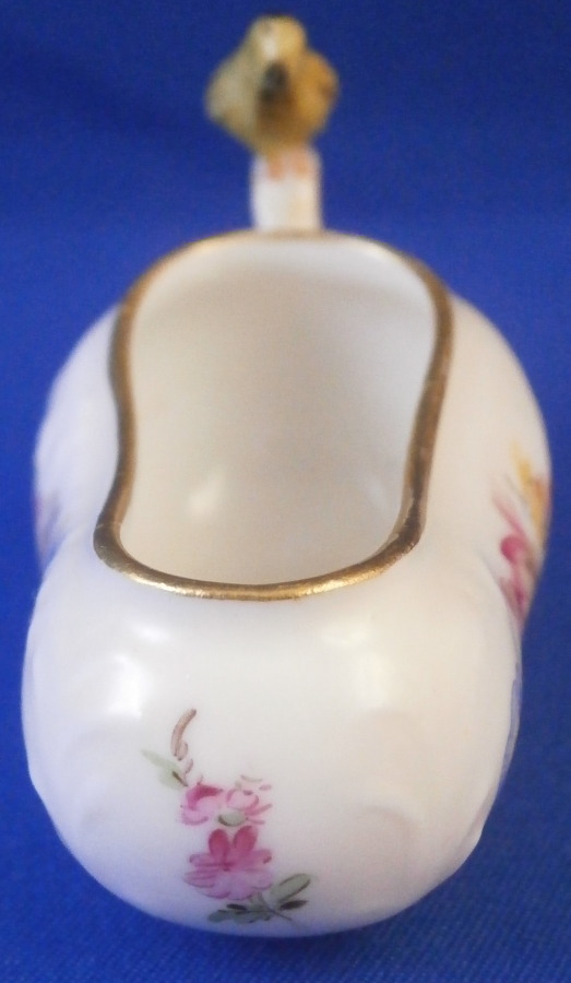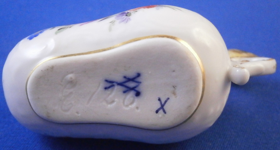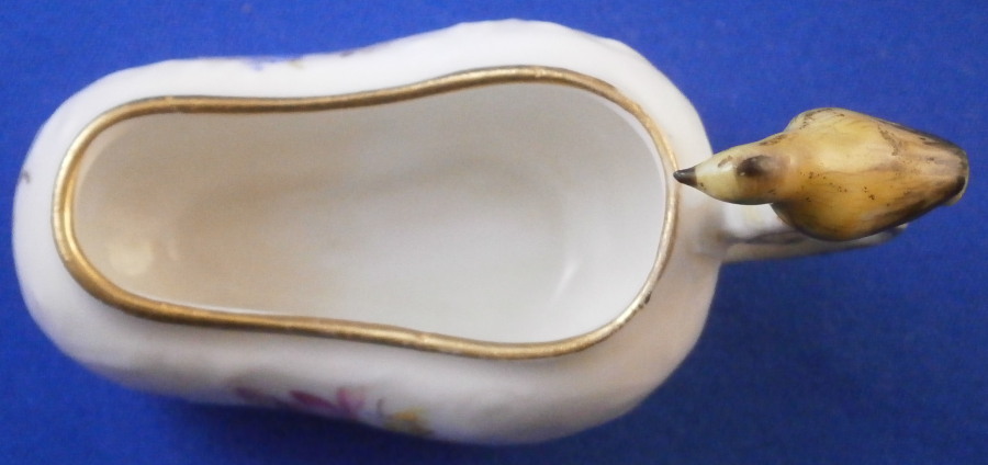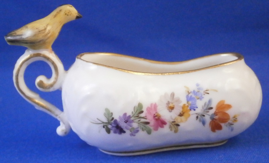 This is a very rare piece made by Meissen in the mid to late 19th century. It is a dollhouse or poupee sized bourdaloue . An extremely rare piece and I could not find another. I did find one miniature French one from this period that sold for 3K and was not as nice. They really did make everything for dollhouses! A must have for your high end doll :) This shape is often confused with sauceboats which is pretty disgusting and a bit funny. It's a chamber pot for ladies! The bourdaloue ishand painted with a floral arrangement to the sides, a small flower to the front and a relief design to the paste all around with a fun handle with a bird sitting on it which is not uncommon on the normal sized pieces - not sure why there is a bird but hey it looks great when on display! The piece displays nicely but the handle was off and is reglued and the tail of the bird is missing its tip. An easy fix for any restorer or fine the way it is. It might be the only one out there so one can forgive the damage I think. Unglazed bottom with a crossed swords mark to it as well as an X in blue and the usual incisedmodel number as shown. A fun and quirky piece and definitely a conversation starter :) The piece is 0.875 inches tall without the handle which adds another 0.5 inches, 2.375inches long and and 1.125 inches wide. Please email me for more information or other pictures.