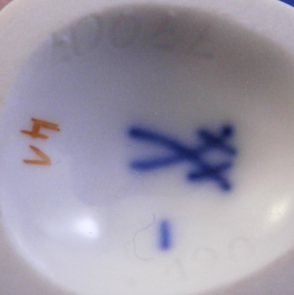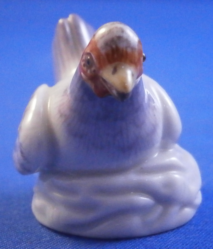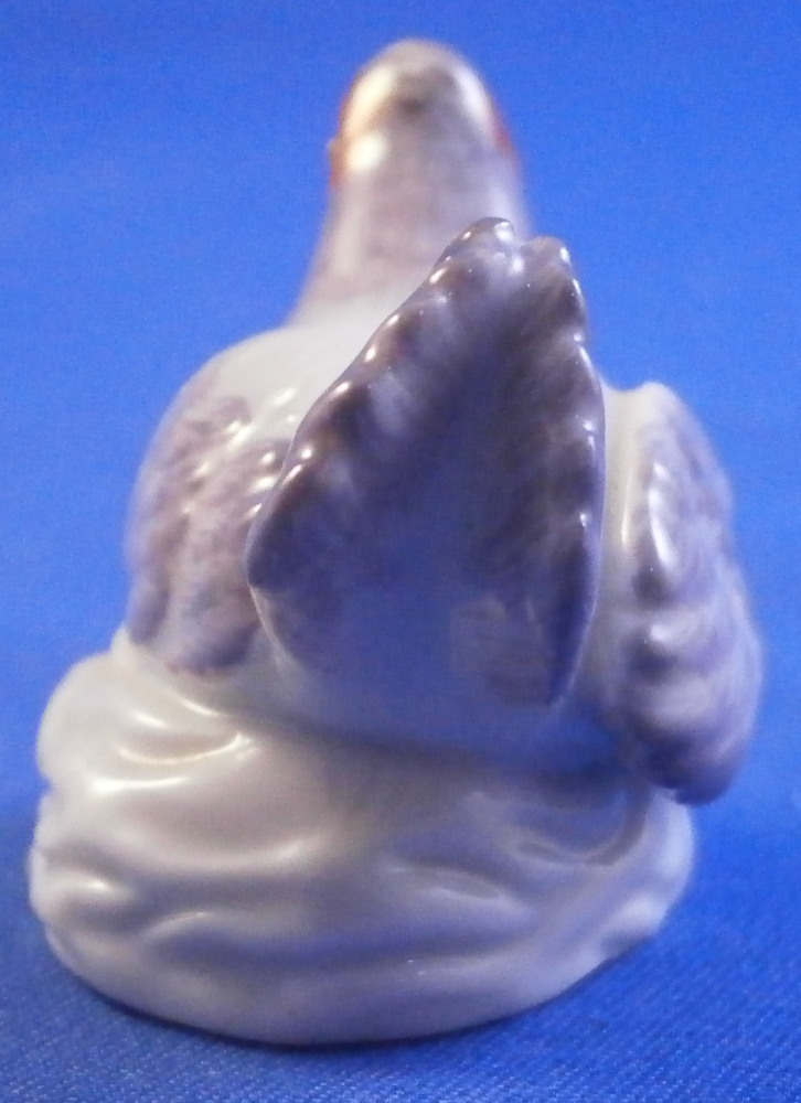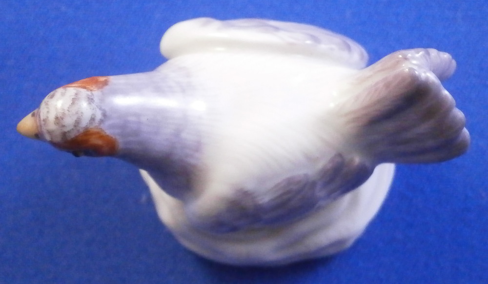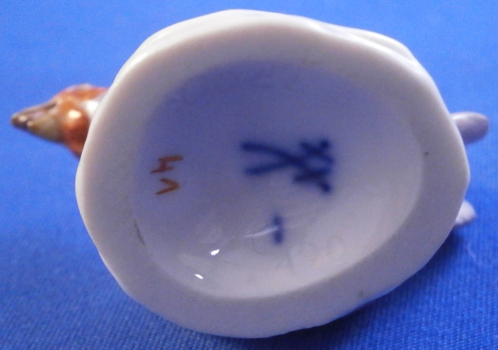 This is a superb miniature figurine of a chicken / hen sitting on her nest made by Meissen in the 20th century. Super cute! The piece is superbly modeled and hand painted with lots of detail. The figure is in perfect condition which is always a bonus. The figurine is just over 1 inch tall, 1 inch wide and 1.625 inches long. The piece is marked underneath with the under glaze blue crossed swords mark as well as the usual impressed numbers and the remnants of a painte's mark as shown. Please email me for more information or other pictures.
